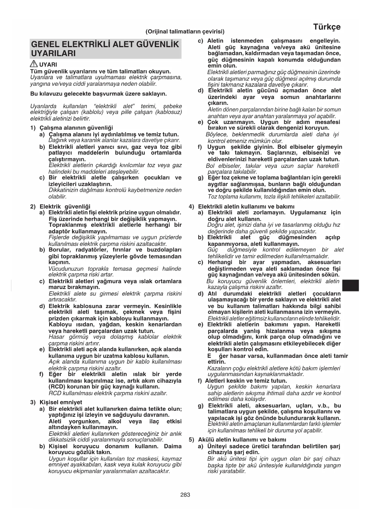a) Bir elektrikli alet kullanırken daima tetikte olun; yaptığınız işi izleyin ve sağduyulu davranın. Aleti yorgunken, alkol veya ilaç etkisi altındayken kullanmayın. Elektrikli aletleri kullanırken göstereceğiniz bir anlık dikkatsizlik ciddi yaralanmayla sonuçlanabilir. b) Kişisel koruyucu donanım kullanın. Daima koruyucu gözlük takın. Uygun koşullar için kullanılan toz maskesi, kaymaz emniyet ayakkabıları, kask veya kulak koruyucu gibi koruyucu ekipmanlar yaralanmaları azaltacakt ır. (Orijinal talimatların çevirisi) 000BookNT1865DBAL.indb283000BookNT1865DBAL.indb283 2022/06/2911:55:452022/06/2911:55:45284 Türkçe b) Elektrikli aletleri sadece özellikle belirtilen akü üniteleriyle kullanın. Başka herhangi bir akü ünitesinin kullanılması yaralanma veya yangın riski yaratabilir. c) Akü ünitesini kullanılmadığı zamanlarda ataşlardan, madeni paralardan, anahtarlardan, çivilerden, vidalardan veya terminaller arasında bağlantı oluşturabilecek diğer küçük metal nesnelerden uzak tutun. Akü kutuplarının kısa devre olması yanıklara veya yangına neden olabilir. d) Yanlış kullanım koşullarında aküden sıvı çıkışı olabilir; temas etmekten kaçının. Kazayla sıvıya temas edilmesi durumunda suyla yıkayın. Sıvının gözlere temas etmesi halinde, ayrıca bir doktora başvurun. Aküden fışkıran su tahriş veya yanıklara neden olabilir.