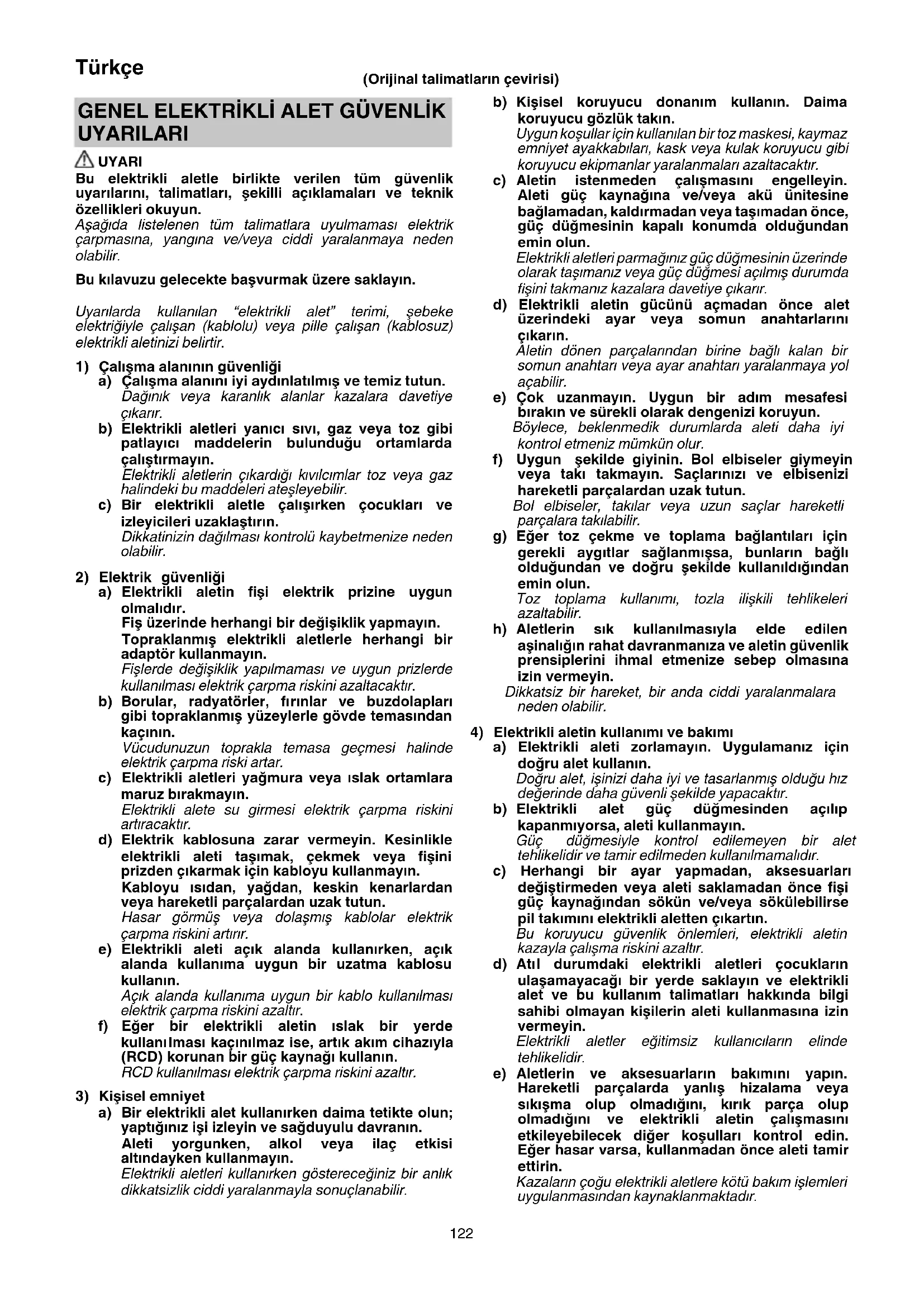 a) Elektrikli aleti zorlamayın. Uygulamanız için doğru alet kullanın. Doğru alet, işinizi daha iyi ve tasarlanmış olduğu hız değerinde daha güvenli şekilde yapacaktır. b) Elektrikli alet güç düğmesinden açılıp kapanmıyorsa, aleti kullanmayın. Güç düğmesiyle kontrol edilemeyen bir alet tehlikelidir ve tamir edilmeden kullanılmamalıdır. c) Herhangi bir ayar yapmadan, aksesuarları değiştirmeden veya aleti saklamadan önce fi şi güç kaynağından sökün ve/veya sökülebilirse pil takımını elektrikli aletten çıkartın. Bu koruyucu güvenlik önlemleri, elektrikli aletin kazayla çalışma riskini azaltır. d) Atı l durumdaki elektrikli aletleri çocukların ulaşamayacağı bir yerde saklayın ve elektrikli alet ve bu kullanım talimatları hakkında bilgi sahibi olmayan kişilerin aleti kullanmasına izin vermeyin. Elektrikli aletler eğitimsiz kullanıcıların elinde tehlikelidir. e) Aletlerin ve aksesuarların bakımını yapın. Hareketli parçalarda yanlış hizalama veya sıkışma olup olmadığını, kırık parça olup olmadığını ve elektrikli aletin çalışmasını etkileyebilecek diğer koşulları kontrol edin. Eğer hasar varsa, kullanmadan önce aleti tamir ettirin. Kazaların çoğu elektrikli aletlere kötü bakım işlemleri uygulanması ndan kaynaklanmaktadır. GENEL ELEKTRİKLİ ALET GÜVENLİK UYARILARI UYARI Bu elektrikli aletle birlikte verilen tüm güvenlik uyarılarını, talimatları, şekilli açıklamaları ve teknik özellikleri okuyun. Aşağıda listelenen tüm talimatlara uyulmaması elektrik çarpmasına, yangına ve/veya ciddi yaralanmaya neden olabilir. Bu kılavuzu gelecekte başvurmak üzere saklayın. Uyarılarda kullanılan “elektrikli alet” terimi, şebeke elektriğiyle çalışan (kablolu) veya pille çalışan (kablosuz) elektrikli aletinizi belirtir.