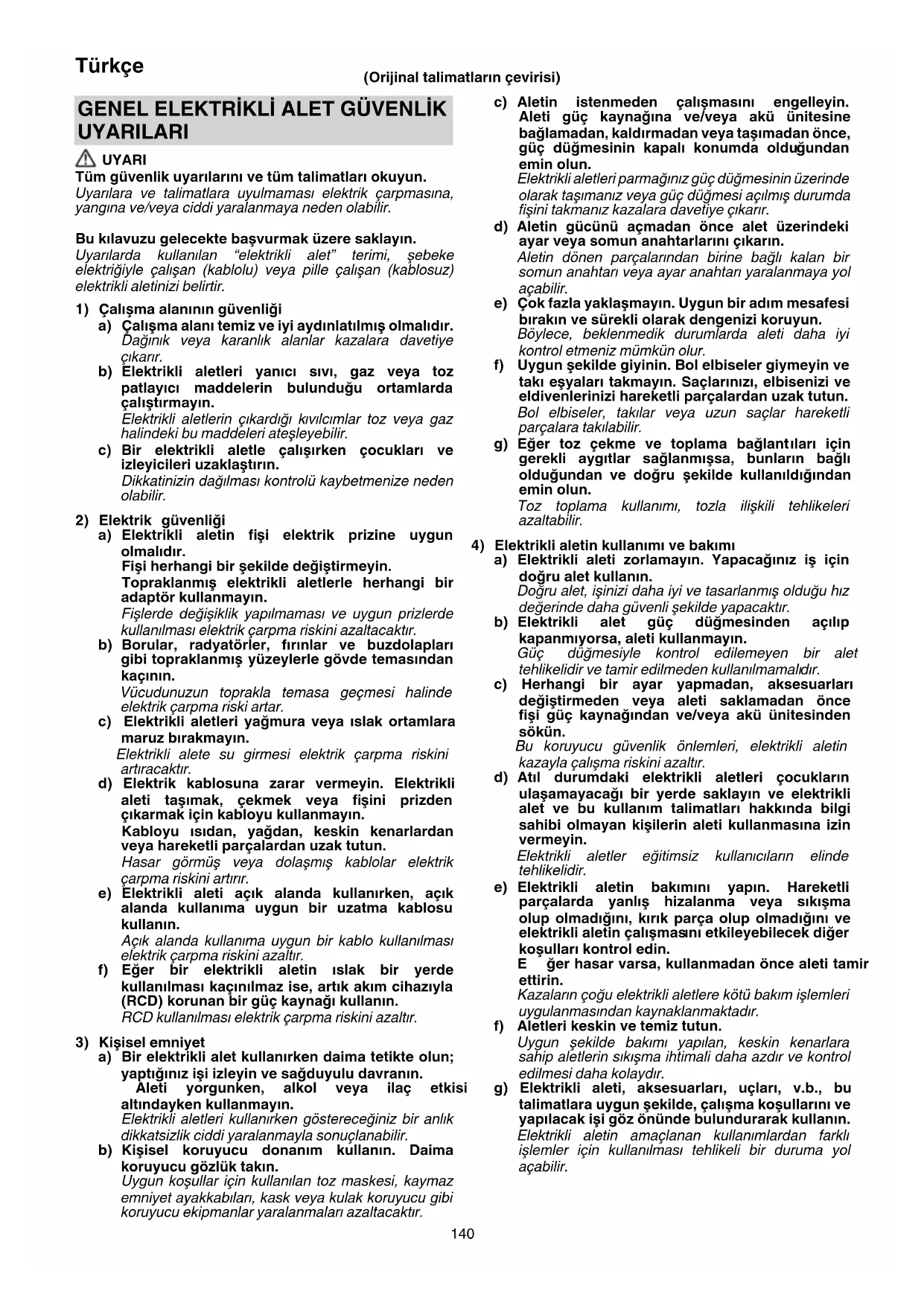 Čeština 0000BookN14DSL.indb1390000BookN14DSL.indb139 2021/10/2914:13:102021/10/2914:13:10GENEL ELEKTRİKLİ ALET GÜVENLİK UYARILARI UYARI Tüm güvenlik uyarılarını ve tüm talimatları okuyun. Uyarılara ve talimatlara uyulmaması elektrik çarpmasına, yangına ve/veya ciddi yaralanmaya neden olabilir. Bu kılavuzu gelecekte başvurmak üzere saklayın. Uyarılarda kullanılan “elektrikli alet” terimi, şebeke elektriğiyle çalışan (kablolu) veya pille çalışan (kablosuz) elektrikli aletinizi belirtir.
