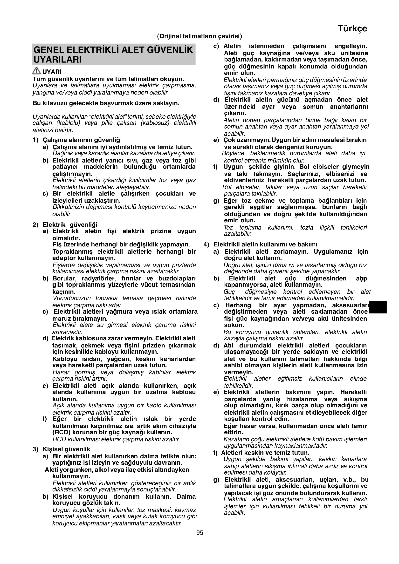 a) Elektrikli aleti zorlamayın. Uygulamanız için doğru alet kullanın. Doğru alet, işinizi daha iyi ve tasarlanmış olduğu hız değerinde daha güvenli şekilde yapacaktır. b) Elektrikli alet güç düğmesinden açı lıp kapanmıyorsa, aleti kullanmayın. Güç düğmesiyle kontrol edilemeyen bir alet tehlikelidir ve tamir edilmeden kullanılmamalıdır. c) Herhangi bir ayar yapmadan, aksesuarları değiştirmeden veya aleti saklamadan önce fi şi güç kaynağından ve/veya akü ünitesinden sökün. Bu koruyucu güvenlik önlemleri, elektrikli aletin kazayla çalışma riskini azaltır. d) Atıl durumdaki elektrikli aletleri çocukların ulaşamayacağı bir yerde saklayın ve elektrikli alet ve bu kullanım talimatları hakkında bilgi sahibi olmayan kişilerin aleti kullanmasına izin vermeyin. Elektrikli aletler eğitimsiz kullanıcıların elinde tehlikelidir. e) Elektrikli aletlerin bakımını yapın. Hareketli parçalarda yanlış hizalanma veya sıkışma olup olmadığını , kırık parça olup olmadığını ve elektrikli aletin çalışmasını etkileyebilecek diğer koşulları kontrol edin. Eğer hasar varsa, kullanmadan önce aleti tamir ettirin. Kazaların çoğu elektrikli aletlere kötü bakım işlemleri uygulanmasından kaynaklanmaktadır. f) Aletleri keskin ve temiz tutun. Uygun şekilde bakımı yapılan, keskin kenarlara sahip aletlerin sıkışma ihtimali daha azdır ve kontrol edilmesi daha kolaydır. g) Elektrikli aleti, aksesuarları, uçları, v.b., bu talimatlara uygun şekilde, çalışma koşullarını ve yapılacak işi göz önünde bulundurarak kullanın. Elektrikli aletin amaçlanan kullanımlardan farklı işlemler için kullanılması tehlikeli bir duruma yol açabilir. GENEL ELEKTRİKLİ ALET GÜVENLİK UYARILARI UYARI Tüm güvenlik uyarılarını ve tüm talimatları okuyun. Uyarılara ve talimatlara uyulmaması elektrik çarpmasına, yangına ve/veya ciddi yaralanmaya neden olabilir. Bu kılavuzu gelecekte başvurmak üzere saklayın. Uyarılarda kullanılan “elektrikli alet” terimi, şebeke elektriğiyle çalışan (kablolu) veya pille çalışan (kablosuz) elektrikli aletinizi belirtir.