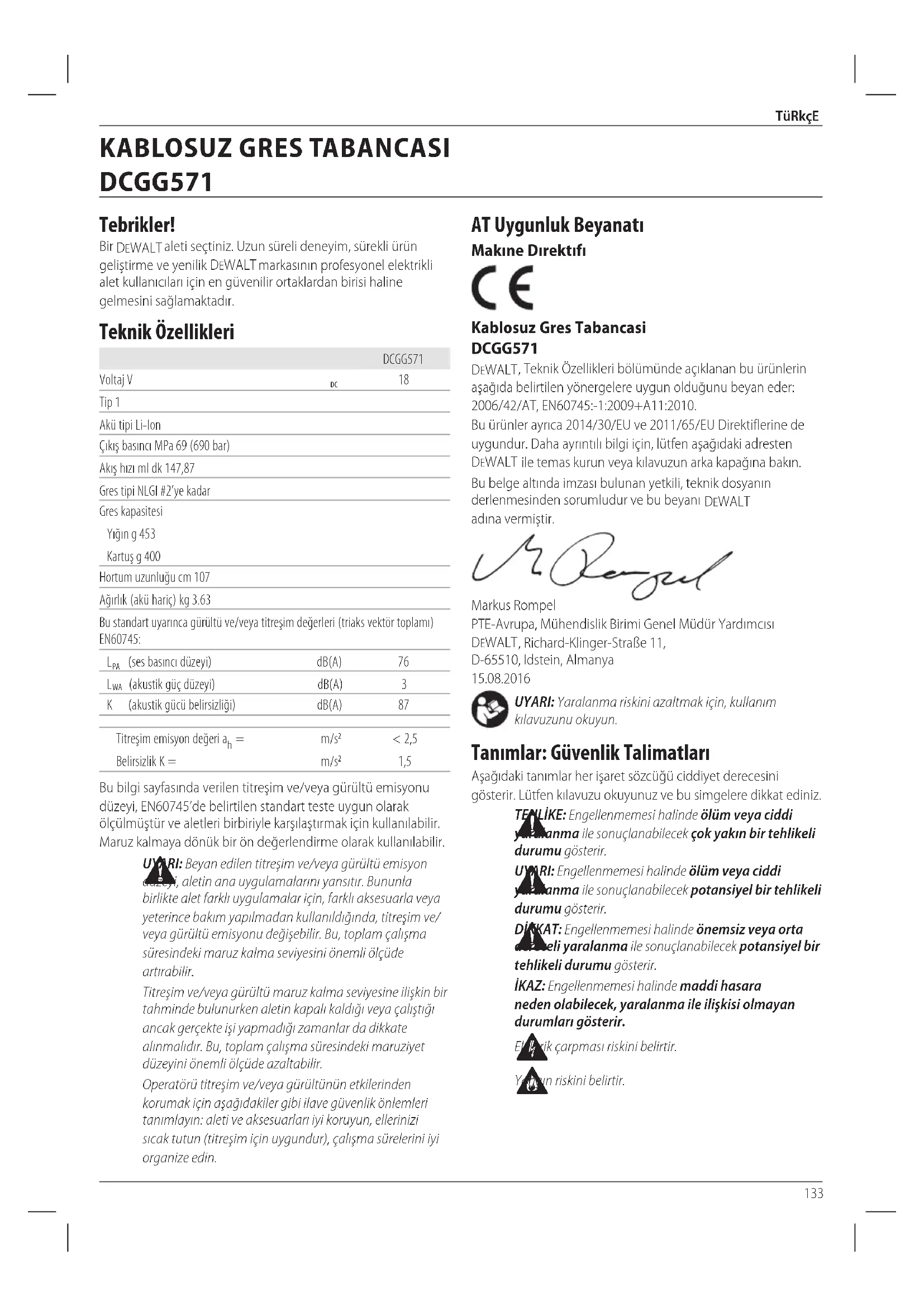 Yangın riskinibelirtir. Tebrikler! Bir DeWALT aleti seçtiniz. Uzun süreli deneyim, sürekli ürün geliştirme ve yenilik DeWALT markasının profesyonel elektrikli alet kullanıcıları için en güvenilir ortaklardan birisi haline gelmesinisağlamaktadır. Teknik Özellikleri DCGG571 Voltaj V