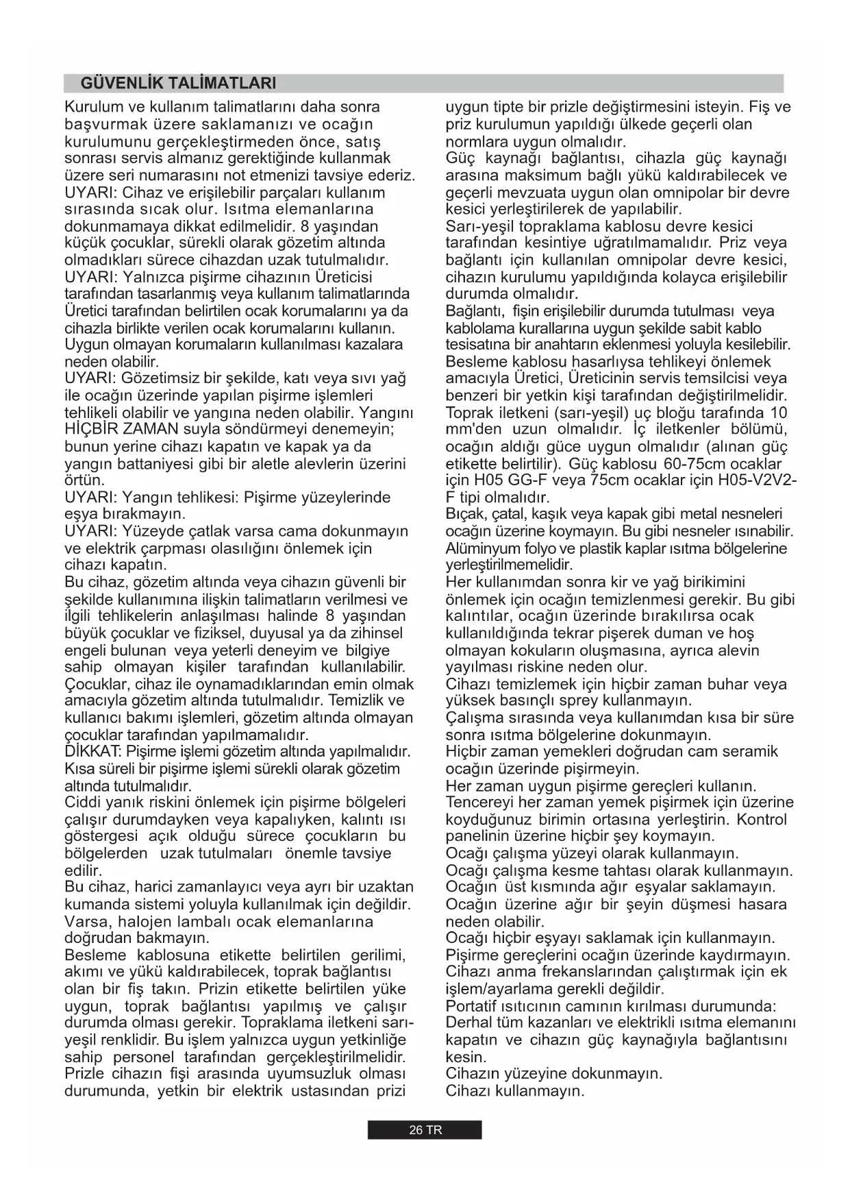 560 g/h 220-240V 50/60Hz -26 TR Kurulum ve kullanım talimatlarını daha sonra başvurmak üzere saklamanızı ve ocağın kurulumunu gerçekleştirmeden önce, satış sonrası servis almanız gerektiğinde kullanmak üzere seri numarasını not etmenizi tavsiye ederiz. UYARI: Cihaz ve erişilebilir parçaları kullanım sırasında sıcak olur. Isıtma elemanlarına dokunmamaya dikkat edilmelidir. 8 yaşından küçük çocuklar, sürekli olarak gözetim altında olmadıkları sürece cihazdan uzak tutulmalıdır. UYARI: Yalnızca pişirme cihazının Üreticisi tarafından tasarlanmış veya kullanım talimatlarında Üretici tarafından belirtilen ocak korumalarını ya da cihazla birlikte verilen ocak korumalarını kullanın. Uygun olmayan korumaların kullanılması kazalara neden olabilir. UYARI: Gözetimsiz bir şekilde, katı veya sıvı yağ ile ocağın üzerinde yapılan pişirme işlemleri tehlikeli olabilir ve yangına neden olabilir. Yangını HİÇBİR ZAMAN suyla söndürmeyi denemeyin; bunun yerine cihazı kapatın ve kapak ya da yangın battaniyesi gibi bir aletle alevlerin üzerini örtün. UYARI: Yangın tehlikesi: Pişirme yüzeylerinde eşya bırakmayın. UYARI: Yüzeyde çatlak varsa cama dokunmayın ve elektrik çarpması olasılığını önlemek için cihazı kapatın. Bu cihaz, gözetim altında veya cihazın güvenli bir şekilde kullanımına ilişkin talimatların verilmesi ve ilgili tehlikelerin anlaşılması halinde 8 yaşından büyük çocuklar ve fiziksel, duyusal ya da zihinsel engeli bulunan veya yeterli deneyim ve bilgiye sahip olmayan kişiler tarafından kullanılabilir. Çocuklar, cihaz ile oynamadıklarından emin olmak amacıyla gözetim altında tutulmalıdır. Temizlik ve kullanıcı bakımı işlemleri, gözetim altında olmayan çocuklar tarafından yapılmamalıdır. DİKKAT: Pişirme işlemi gözetim altında yapılmalıdır. Kısa süreli bir pişirme işlemi sürekli olarak gözetim altında tutulmalıdır. Ciddi yanık riskini önlemek için pişirme bölgeleri çalışır durumdayken veya kapalıyken, kalıntı ısı göstergesi açık olduğu sürece çocukların bu bölgelerden uzak tutulmaları önemle tavsiye edilir. Bu cihaz, harici zamanlayıcı veya ayrı bir uzaktan kumanda sistemi yoluyla kullanılmak için değildir. Varsa, halojen lambalı ocak elemanlarına doğrudan bakmayın. Besleme kablosuna etikette belirtilen gerilimi, akımı ve yükü kaldırabilecek, toprak bağlantısı olan bir fiş takın. Prizin etikette belirtilen yüke uygun, toprak bağlantısı yapılmış ve çalışır durumda olması gerekir. Topraklama iletkeni sarı- yeşil renklidir. Bu işlem yalnızca uygun yetkinliğe sahip personel tarafından gerçekleştirilmelidir. Prizle cihazın fişi arasında uyumsuzluk olması durumunda, yetkin bir elektrik ustasından prizi