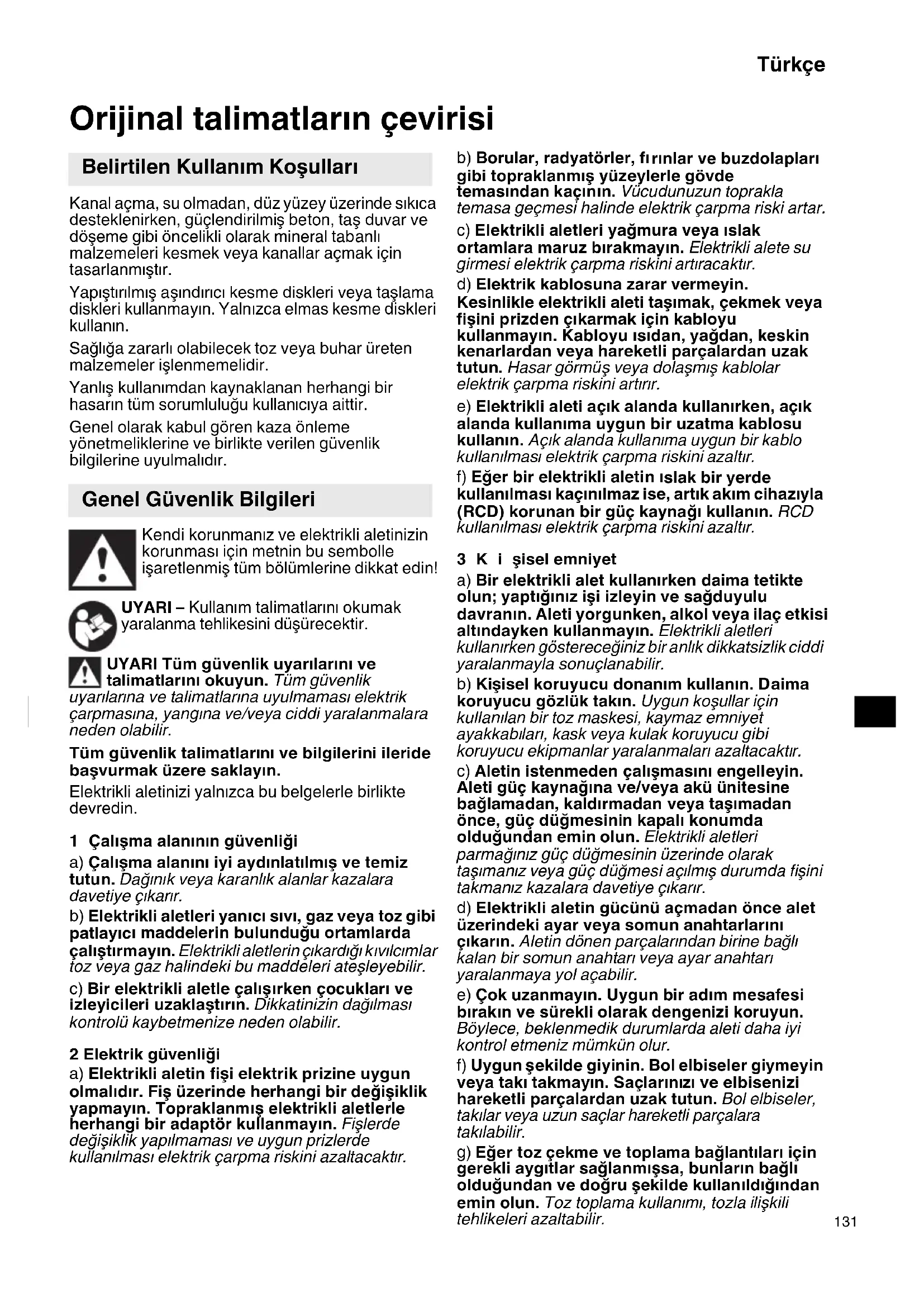 Orijinal talimatların çevirisi Kanal açma, su olmadan, düz yüzey üzerinde sıkıca desteklenirken, güçlendirilmiş beton, taş duvar ve döşeme gibi öncelikli olarak mineral tabanlı malzemeleri kesmek veya kanallar açmak için tasarlanmıştır. Yapıştırılmış aşındırıcı kesme diskleri veya taşlama diskleri kullanmayın. Yalnızca elmas kesme diskleri kullanın. Sağlığa zararlı olabilecek toz veya buhar üreten malzemeler işlenmemelidir. Yanlış kullanımdan kaynaklanan herhangi bir hasarın tüm sorumluluğu kullanıcıya aittir. Genel olarak kabul gören kaza önleme yönetmeliklerine ve birlikte verilen güvenlik bilgilerine uyulmalıdır. Kendi korunmanız ve elektrikli aletinizin korunması için metnin bu sembolle işaretlenmiş tüm bölümlerine dikkat edin! UYARI – Kullanım talimatları nı okumak yaralanma tehlikesini düşürecektir. UYARI Tüm güvenlik uyarılarını ve talimatlarını okuyun. Tüm güvenlik uyarılarına ve talimatlarına uyulmaması elektrik çarpmasına, yangına ve/veya ciddi yaralanmalara neden olabilir. Tüm güvenlik talimatlarını ve bilgilerini ileride başvurmak üzere saklayın. Elektrikli aletinizi yalnızca bu belgelerle birlikte devredin. 1Çalışma alanının güvenliği a) Çalışma alanını iyi aydınlatılmış ve temiz tutun. Dağınık veya karanlık alanlar kazalara davetiye çıkarır. b) Elektrikli aletleri yanıcı sıvı, gaz veya toz gibi patlayıc ı maddelerin bulunduğu ortamlarda çalıştırmayın. Elektrikli aletlerin çıkardığı k ıvılcımlar toz veya gaz halindeki bu maddeleri ateşleyebilir. c) Bir elektrikli aletle çalışırken çocukları ve izleyicileri uzaklaştırın. Dikkatinizin dağılması kontrolü kaybetmenize neden olabilir. 2 Elektrik güvenliği a) Elektrikli aletin fişi elektrik prizine uygun olmalıdır. Fiş üzerinde herhangi bir değişiklik yapmayın. Topraklanmış elektrikli aletlerle herhangi bir adaptör kullanmayın. Fişlerde değişiklik yapılmaması ve uygun prizlerde kullanılması elektrik çarpma riskini azaltacaktır. b) Borular, radyatörler, fı rınlar ve buzdolapları gibi topraklanmış yüzeylerle gövde temasından kaçının. Vücudunuzun toprakla temasa geçmesi halinde elektrik çarpma riski artar. c) Elektrikli aletleri yağmura veya ıslak ortamlara maruz bırakmayın. Elektrikli alete su girmesi elektrik çarpma riskini artıracaktır. d) Elektrik kablosuna zarar vermeyin. Kesinlikle elektrikli aleti taşımak, çekmek veya fişini prizden çıkarmak için kabloyu kullanmayın. Kabloyu ısıdan, yağdan, keskin kenarlardan veya hareketli parçalardan uzak tutun. Hasar görmüş veya dolaşmış kablolar elektrik çarpma riskini artırır. e) Elektrikli aleti açık alanda kullanırken, açık alanda kullanıma uygun bir uzatma kablosu kullanın. Açık alanda kullanıma uygun bir kablo kullanılması elektrik çarpma riskini azaltır. f) Eğer bir elektrikli aletin ı slak bir yerde kullanılması kaçınılmaz ise, artık akım cihazıyla (RCD) korunan bir güç kaynağı kullanın. RCD kullanılması elektrik çarpma riskini azaltır. 3Kişisel emniyet a) Bir elektrikli alet kullanırken daima tetikte olun; yaptığınız işi izleyin ve sağduyulu davranın. Aleti yorgunken, alkol veya ilaç etkisi altındayken kullanmayın. Elektrikli aletleri kullanırken göstereceğiniz bir anlık dikkatsizlik ciddi yaralanmayla sonuçlanabilir. b) Kişisel koruyucu donanım kullanın. Daima koruyucu gözlük takın. Uygun koşullar için kullanılan bir toz maskesi, kaymaz emniyet ayakkabıları, kask veya kulak koruyucu gibi koruyucu ekipmanlar yaralanmaları azaltacaktır. c) Aletin istenmeden çalışmasını engelleyin. Aleti güç kaynağına ve/veya akü ünitesine bağlamadan, kaldırmadan veya taşımadan önce, güç düğmesinin kapalı konumda olduğundan emin olun. Elektrikli aletleri parmağınız güç düğmesinin üzerinde olarak taşımanız veya güç düğmesi açılmış durumda fişini takmanız kazalara davetiye çıkarır. d) Elektrikli aletin gücünü açmadan önce alet üzerindeki ayar veya somun anahtarlarını çıkarın. Aletin dönen parçalarından birine bağlı kalan bir somun anahtarı veya ayar anahtarı yaralanmaya yol açabilir. e) Çok uzanmayın. Uygun bir adım mesafesi bırakın ve sürekli olarak dengenizi koruyun. Böylece, beklenmedik durumlarda aleti daha iyi kontrol etmeniz mümkün olur. f) Uygun şekilde giyinin. Bol elbiseler giymeyin veya takı takmayın. Saçlarını zı ve elbisenizi hareketli parçalardan uzak tutun. Bol elbiseler, takılar veya uzun saçlar hareketli parçalara takılabilir. g) Eğer toz çekme ve toplama bağlantıları için gerekli aygıtlar sağlanmışsa, bunların bağlı olduğundan ve doğru şekilde kullanıldığından emin olun. Toz toplama kullanımı, tozla ilişkili tehlikeleri azaltabilir. Belirtilen Kullanım Koşulları Genel Güvenlik Bilgileri 000book_CM5MA.book 131 ページ 2022年7月20日 水曜日 午後4時50分Türkçe