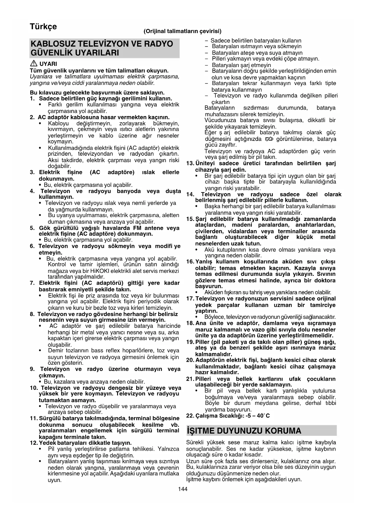 Alet normal şekilde çalışmazsa, aşağıdaki tabloda belirtilen kontrolleri uygulayın. Bu kontroller sorunu çözmezse, satıcınıza veya HiKOKI Yetkili Servis Merkezine danışın. Belirti Olası Nedeni Çözüm Güç açılmıyor AC adaptörünün bağlantısı kesik veya prize tam olarak takılı değil. AC adaptörünü sıkı bir şekilde prize tam olarak yerleştirin. Pil gücü kalmamıştır Pili şarj edin. Ses yok Ses düzeyi çok düşüktür. Ses düzeyini ayarlayın. Güç otomatik olarak kapandı Uyku işlevi etkinleştirilmiştir. Uyku işlevini devre dışı bırakın. Tarih ve/veya saat hatalı Yedek pil bitmiştir. Yedek pili yenisi ile değiştirin. Televizyon sinyal alamıyor. Kanallar yapılandırılmamıştır. Kanalları yapılandırın. TV kanalları ayarlanamıyor Ülke ayarı yanl ış. Lütfen Ülke ayarını kontrol edin. Bazı televizyon yayın sinyalleri alınamıyor Karasal dijital sinyaller yayınlanmamaktadır. Size en yakın yayın istasyonuna karasal dijital sinyalleri yayınlayıp yayınlamadıklarını sorun. Alt yazılar görüntülenmiyor veya Multichannel Television Sound çalışmıyor İzlediğiniz televizyon programı alt yazıları ve/veya Multichannel Television Sound desteklemiyor. Alt yazıları veya Multichannel Television Sound destekleyen bir televizyon programını kullanmayı deneyin. Televizyonun görüntüsü bozuk veya durmuş halde Anten yanlış yöne doğru dönük veya anten kablosunun bağlantısı kesik veya anten kablosu bozuk. Antenin dönük olduğu yönde veya anten kablo bağlantı sında hiçbir sorun olmadığından emin olun. Güç verildikten veya kanal değiştirildikten kısa bir süre sonra televizyon görüntü göstermeyi durduruyor Bu bir arıza değildir. Çünkü ekranda görüntülenmek üzere hazırlanması için sinyalin işlenmesi gerekir, kanalın değiştirilmesi birkaç saniye alır. Bir Bluetooth cihazı bağlanamıyor veya sesi aralıklarla kesiliyor. Cihaz eşleştirilmemiştir. Cihazı eşleştirin. Yakında kablosuz yönlendirici gibi karışan radyo sinyalleri yayan başka bir cihaz vardır. Karışmaya sebep olan cihazı ve televizyon ve radyoyu birbirlerinden uzağa taşımayı deneyin. Bluetooth cihazı, televizyon ve radyodan çok uzaktadır. Cihazı televizyon ve radyoya yakınlaş tırmayı deneyin. Harici bir cihazdan video, müzik veya fotoğrafl ar görüntülenemiyor veya oynatılamıyor ya da cihazın klasörleri ve dosyaları görüntülenemiyor. Bağlantı düzgün bir şekilde tanınmamaktadır. Harici cihazın bağlantısını kesmeyi ve yeniden bağlamayı deneyin. Halen tanınmıyorsa, televizyonun ve radyonun gücünü yeniden kapatıp açın. Uzaktan kumanda çalışmıyor Uzaktan kumanda, uzaktan kumanda sensörüne dönük değildir. Çalıştırırken uzaktan kumandayı televizyon ve radyo üzerindeki uzaktan kumanda sensörüne doğrultun. Uzaktan kumanda, uzaktan kumanda sensöründen çok uzaktadır. Uzaktan kumandayı, 3 m veya daha yakın mesafeden çalıştırın. Televizyon ve radyonun uzaktan kumanda sensörü, do ğrudan güneş ışığı gibi parlak bir ışığın altındadır. Televizyon ve radyoyu, doğrudan güneş ışığı veya diğer parlak bir ışığın olmadığı bir yerde tutun. Uzaktan kumandanın pilleri bitmiştir. Uzaktan kumandanın pillerini yenileriyle değiştirin. 0000BookUR18DSML.indb1520000BookUR18DSML.indb152 2019/07/0310:39:482019/07/0310:39:48153 Română (Traducerea instrucţiunilor originale) AVERTISMENTE PRIVIND