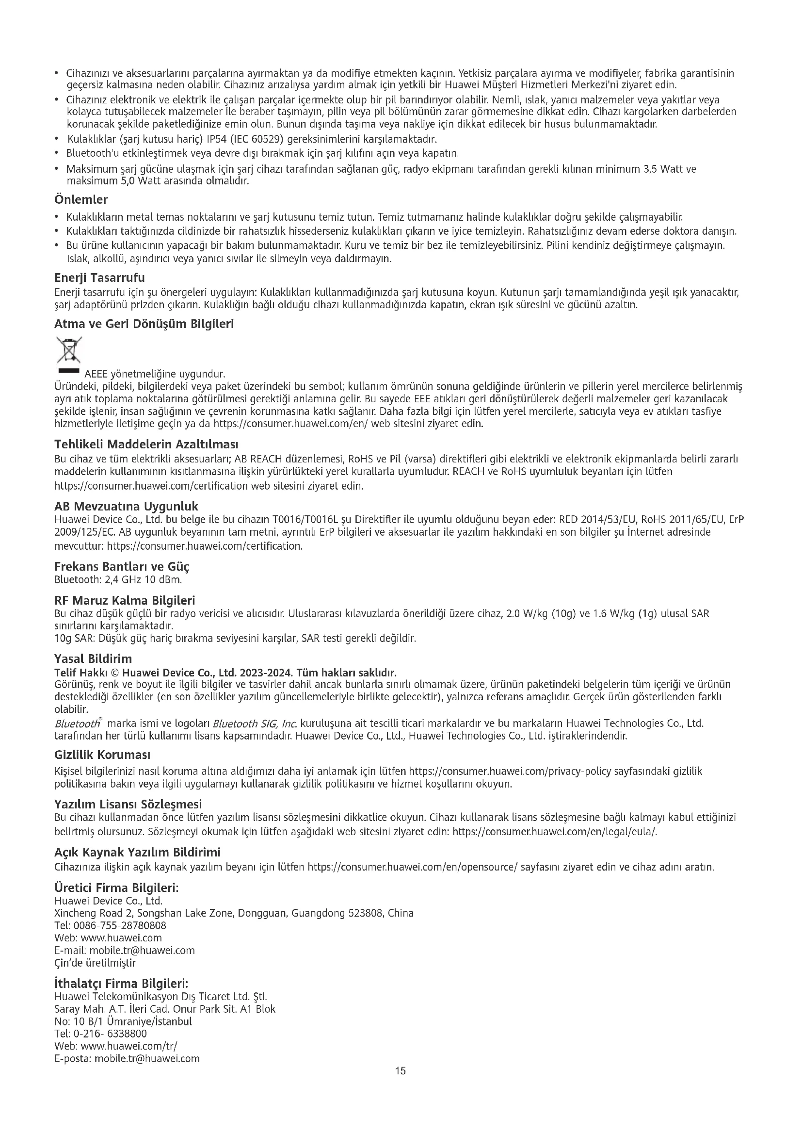 - Bu ürüne kullanıcının yapacağı bir bakım bulunmamaktadır. Kuru ve temiz bir bez ile temizleyebilirsiniz. Pilini kendiniz değiştirmeye çalışmayın. Islak, alkollü, aşındırıcı veya yanıcı sıvılar ile silmeyin veya daldırmayın. Enerji Tasarrufu Enerji tasarrufu için şu önergeleri uygulayın: Kulaklıkları kullanmadığınızda şarj kutusuna koyun. Kutunun şarjı tamamlandığında yeşil ışık yanacaktır, şarj adaptörünü prizden çıkarın. Kulaklığın bağlı olduğu cihazı kullanmadığınızda kapatın, ekran ışık süresini ve gücünü azaltın. Atma ve Geri Dönüşüm Bilgileri AEEE yönetmeliğine uygundur. Üründeki, pildeki, bilgilerdeki veya paket üzerindeki bu sembol; kullanım ömrünün sonuna geldiğinde ürünlerin ve pillerin yerel mercilerce belirlenmiş ayrı atık toplama noktalarına götürülmesi gerektiği anlamına gelir. Bu sayede EEE atıkları geri dönüştürülerek değerli malzemeler geri kazanılacak şekilde işlenir, insan sağlığının ve çevrenin korunmasına katkı sağlanır. Daha fazla bilgi için lütfen yerel mercilerle, satıcıyla veya ev atıkları tasye hizmetleriyle iletişime geçin ya da https://consumer.huawei.com/en/ web sitesini ziyaret edin. Tehlikeli Maddelerin Azaltılması Bu cihaz ve tüm elektrikli aksesuarları; AB REACH düzenlemesi, RoHS ve Pil (varsa) direktieri gibi elektrikli ve elektronik ekipmanlarda belirli zararlı maddelerin kullanımının kısıtlanmasına ilişkin yürürlükteki yerel kurallarla uyumludur. REACH ve RoHS uyumluluk beyanları için lütfen https://consumer.huawei.com/certication web sitesini ziyaret edin. AB Mevzuatına Uygunluk Huawei Device Co., Ltd. bu belge ile bu cihazın T0016/T0016L şu Direktier ile uyumlu olduğunu beyan eder: RED 2014/53/EU, RoHS 2011/65/EU, ErP 2009/125/EC. AB uygunluk beyanının tam metni, ayrıntılı ErP bilgileri ve aksesuarlar ile yazılım hakkındaki en son bilgiler şu İnternet adresinde mevcuttur: https://consumer.huawei.com/certication. Frekans Bantları ve Güç Bluetooth: 2,4 GHz 10 dBm. RF Maruz Kalma Bilgileri Bu cihaz düşük güçlü bir radyo vericisi ve alıcısıdır. Uluslararası kılavuzlarda önerildiği üzere cihaz, 2.0 W/kg (10g) ve 1.6 W/kg (1g) ulusal SAR sınırlarını karşılamaktadır. 10g SAR: Düşük güç hariç bırakma seviyesini karşılar, SAR testi gerekli değildir. Yasal Bildirim Telif Hakkı © Huawei Device Co., Ltd. 2023-2024. Tüm hakları saklıdır. Görünüş, renk ve boyut ile ilgili bilgiler ve tasvirler dahil ancak bunlarla sınırlı olmamak üzere, ürünün paketindeki belgelerin tüm içeriği ve ürünün desteklediği özellikler (en son özellikler yazılım güncellemeleriyle birlikte gelecektir), yalnızca referans amaçlıdır. Gerçek ürün gösterilenden farklı olabilir. Bluetooth
