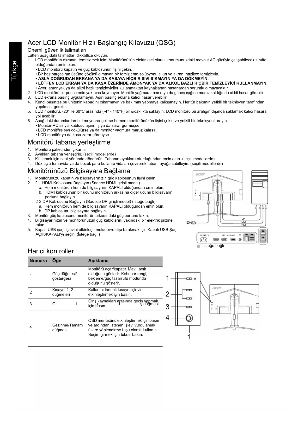 4Türkçe Düzenlemeler ve güvenlik bildirimleri FCC bildirimi Bu aygıt test edilmiş ve FCC kurallarının 15. maddesi uyarınca B Sınıfı dijital aygıt olarak kabul edilmiştir. Bu sınırlar evde kurulumda meydana gelebilecek zararlı bir müdahaleye karşı koruma sağlamak için geliştirilmiştir. Bu aygıt radyo frekansı enerjisi yaratır, kullanır ve hatta saçabilir; ayrıca, talimatlara uygun olarak kurulmaz ve kullanılmazsa radyo iletişiminde zararlı bir müdahalede bulunabilir. Bununla birlikte, bu müdahalenin talimatlara uygun kurulumda meydana gelmeyeceğinin garantisi yoktur. Aygıt, radyo ya da televizyonun sinyal alımına aygıtı kapatıp açarak tespit edilebilen zararlı bir müdahalede bulunursa kullanıcı aşağıdaki önlemlerin birini ya da birden fazlasını alarak bu müdahaleyi düzeltmeyi deneyebilir: Alıcı antenin yerini ya da yönünü değiştirin. Aygıt ile alıcıyı birbirinden biraz daha uzaklaştırın. Aygıtı, alıcının bağlı olduğundan faklı bir devrede bulunan çıkışa bağlayın. Yardım için satıcınıza ya da tecrübeli bir radyo/televizyon teknisyenine danışın. CE Uygunluk beyanı Bu belge ile Acer Inc. bu LCD monitörün EMC Yönetmeliği 2014/30/AB, Alçak Gerilim Yönetmeliği 2014/35/AB ve RoHS Yönetmeliği 2011/65/AB ile Yönetmeliği 2009/125/AT yasalarının enerji ürünleri için çevreci bir tasarım yapacak bir sistem kurmayı gerektiren temel gerekliliklerine ve diğer maddelerine uyduğunu beyan eder. Uyarı: Monitörün zarar görmesini önlemek için monitörü tabanından tutarak kaldırmayın. Uyarı: Blendajlı kablolar Diğer bilişim aygıtlarıyla yapılacak tüm bağlantılar EMC düzenlemelerine uyum sağlamak için blendajlı kablolar kullanılarak yapılmalıdır. Uyarı: Çevresel aygıtlar Bu ekipmana sadece B Sınıfı sınırlarına uygun olduğu sertifikayla belirtilmiş çevresel aygıtlar (giriş/çıkış aygıtları, terminaller, yazıcılar vb.) eklenebilir. Sertifikasız çevresel aygıtlarla çalıştırılırsa radyo ve TV alıcılarına müdahale meydana gelebilir. Dikkat Üretici tarafından açıkça onaylanmamış değişiklikler ve düzenlemeler, kullanıcının Federal İletişim Komisyonu tarafından verilen bu ürünü çalıştırma hakkının feshedilmesine neden olabilir. Çalışma koşulları Bu aygıt FCC Hükümlerinin 15. maddesine uygundur. Çalışma şu iki şarta uygunluk gerektirir: (1) bu aygıt zararlı bir müdahaleye neden olmamalıdır ve (2) istem dışı çalıştırma da dahil olmak üzere bu aygıt alınan her müdahaleyi üstlenmek durumundadır. Uyarı: Kanadalı kullanıcılar Bu B Sınıfı tertibat, Kanada ICES-003 yasasına uygundur. Remarque à l'intention des utilisateurs canadiens Cet appareil numérique de la classe B est conforme à la norme NMB-003 du Canada. Atılacak Ekipmanın Avrupa Birliği Üyesi Ülkelerde Özel Mekanda Kullanıcılarca Atılması Üründe ve ürünün paketinde bulunan bu simge, bu ürünün diğer ev atıklarınızla atılmaması gerektiğini gösterir. Bunun yerine, atılacak ekipmanınızı atık elektrikli cihaz toplama noktasına teslim etmek sizin sorumluluğunuzdur. Ürününüzün bu şekilde ayrı atılması ve geri dönüştürülmesi doğal kaynakları koruyacak ve ürünün insan sağlığını ve çevreyi koruyacak şekilde geri dönüştürülmesini sağlayacaktır. Atık ürününüzü nereye teslim edebileceğiniz hakkında daha fazla bilgi alabilmek için lütfen yerel belediyeyle, çöp hizmetlerinizi sunan birimle ya da ürünü aldığınız mağazayla iletişime geçin.Türkçe