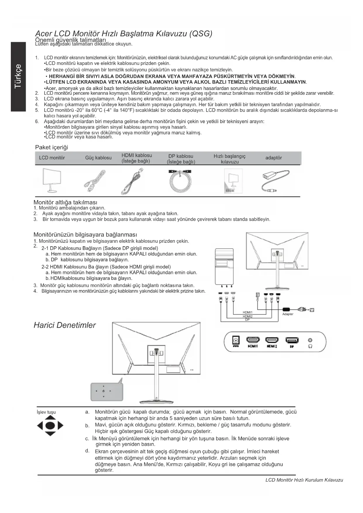 - LCD monitör üzerine sıvı dökülmüş veya monitör yağmura maruz kalmış. LCD monitör veya kasa hasarlı.LCD monitör Güç kablosuDP kablosu (İsteğe bağlı)HDMI kablosu (İsteğe bağlı)Hızlı başlangıç kılavuzu Monitör altlığa takılması