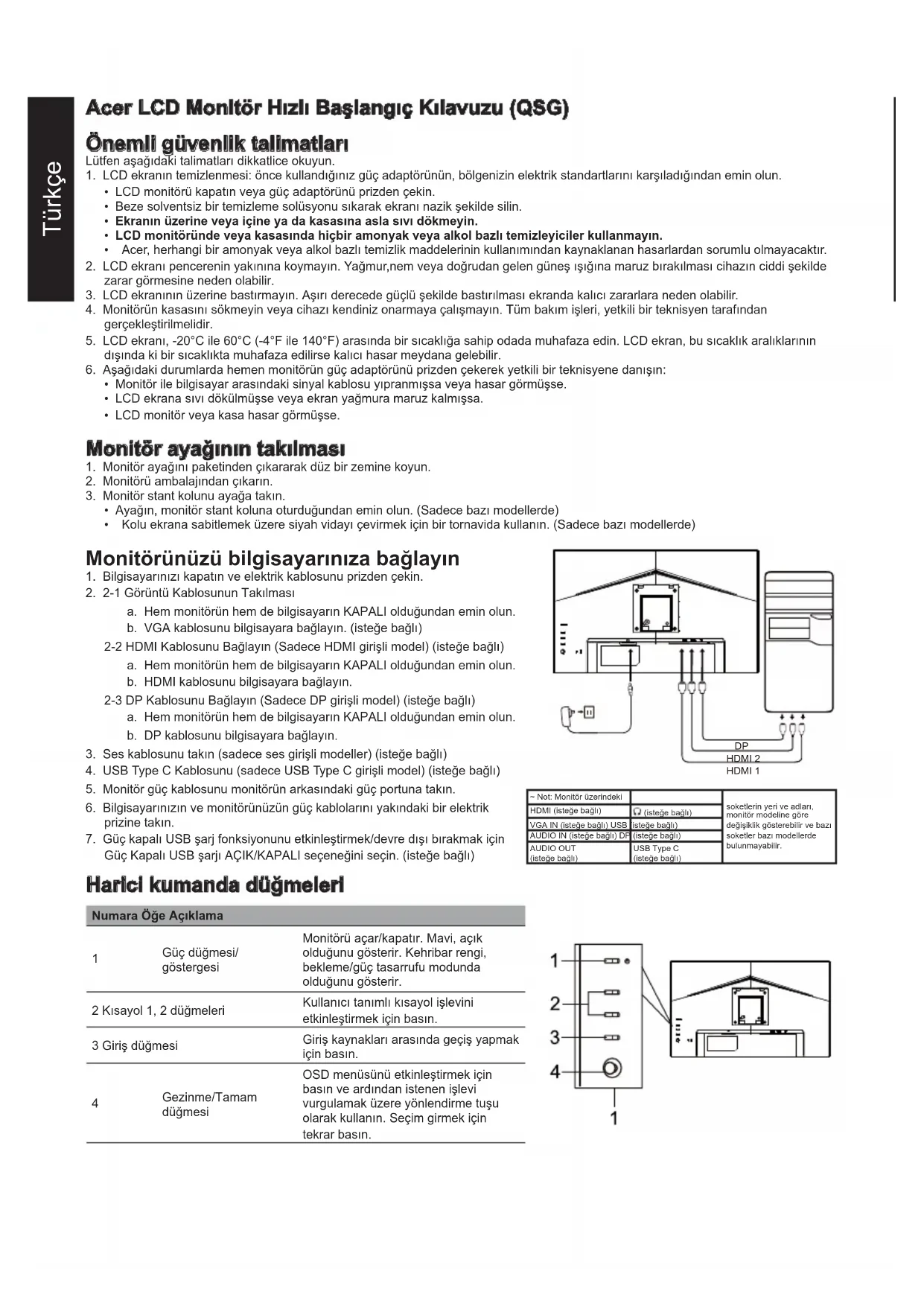 (Genellikle) Kontrast 100.000.000:1 Maks (ACM) Görüş Açısı 178° (Y) 178° (D) (CR=10) Tepki Süresi 1 ms (VRB) Panel Tipi VA Y-Frekans D-Frekans Ekran Renkleri Noktalı Saat Maksimum Çözünürlük Tak ve Çalıştır VESA DDCCI/DDC2B Güç Tüketimi Açık Mod 22 W (Genellikle) Uyku Modu 0,5 W (Genellikle) Kapalı Mod 0,3 W (Genellikle) Giriş Bağlayıcısı HDMI (Sadece HDMI Girişli Model) (İsteğe bağlı) DP (Sadece DP Girişli Model) (İsteğe Bağlı) Giriş Video Sinyali HDMI (Sadece HDMI Girişli Model) (İsteğe bağlı) DP (Sadece DP Girişli Model) (İsteğe Bağlı) Hoparlörler 2 W x 2 (Sadece Ses Girişi Olan Model) (İsteğe Bağlı) Maksimum Ekran Büyüklüğü Yatay: 544 mm Dikey: 303 mm Güç Kaynağı GİRİŞ: 100-240 V~ 50/60 Hz Çevresel Konular Çalışma Sıcaklığı: 0° ila 40°C Depolama Sıcaklığı: -20° ila 60°C Çalışma Nemi: %20 ila %80 Boyutlar Ağırlık (Net Ağırlık) Mekanik Özellikler Eğim: -5° ila +25° Dönme: +/-360° Yükseklik ayarı: 120mm Eksen: +/-90° Çıkarılabilir ayak standı: Evet Harici Denetimler Anahtarlar/Düğmeler Güç düğmesi Kısayol tuşu 1 Kısayol tuşu 2 Giriş Menü/Gezinme/Tamam İşlevler Parlaklık Kontrast Düşük Mavi Işık Siyah Güçlendir ACM HDR Süper Keskinlik Gama Renk Sıcaklığı Modlar Renk Alanı Gri Tonlama Modu 6 eks. Ton 6 eks. Doygun. Ses Seviyesi Sessiz Aşırı Hız FreeSync Premium VRB Yenileme hızı Son Derece Düşük Gecikme Nişan noktası Dil OSD zaman aşımı Şeffaflık OSD Kilidi Giriş Otomatik Kaynak Geniş Mod Kısayol Atama DDC/CI HDMI Siyah düzey Hızlı Başlat Modu Bilgi Tüm Ayarları Sıfırla Teknik özellikler, modele ve/veya bölgeye göre değişiklik gösterir. Resmi Acer destek sitesinde, Acer ürününüze yönelik kılavuzları ve diğer belgeleri bulun. 557,0 (G) x 384,1-504,1 (Y) x 234,0 (D) mm 4,45 Kg (net) HDMI: 31,469-270,000KHz DP: 31,469-281,250KHz (Saat üstünde) DP: 1920x1080 @250Hz 16,7 M Renk HDMI: 48-240Hz HDMI: 594,000MHz DP: 48-250Hz (Saat üstünde) DP: 618,750MHz (Saat üstünde) HDMI: 1920x1080 @240HzRomână Ghid de iniţiere rapidă pentru monitorul LCD Acer (QSG) Instrucţiuni de siguranţă importante Vă rugăm să citiţi cu atenţie instrucţiunile următoare. 1. Curățarea ecranului afișajului LCD: mai întâi, asigurați-vă că adaptorul de alimentare pe care îl utilizați corespunde standardelor electrice pentru regiunea dvs.
