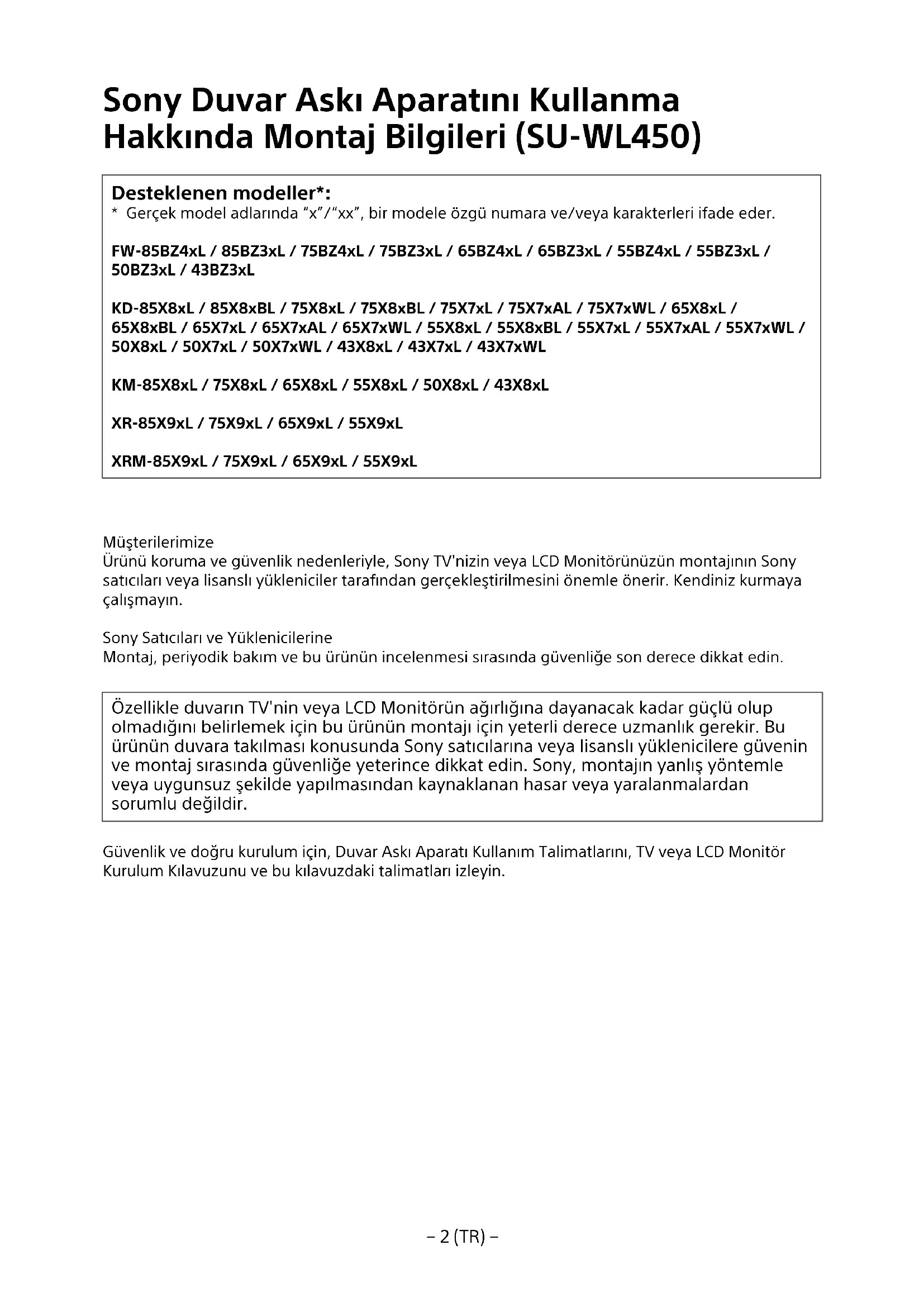 - Gerçek model adlarında “x”/“xx”, bir modele özgü numara ve/veya karakterleri ifade eder. FW-85BZ4xL / 85BZ3xL / 75BZ4xL / 75BZ3xL / 65BZ4xL / 65BZ3xL / 55BZ4xL / 55BZ3xL / 50BZ3xL / 43BZ3xL KD-85X8xL / 85X8xBL / 75X8xL / 75X8xBL / 75X7xL / 75X7xAL / 75X7xWL / 65X8xL / 65X8xBL / 65X7xL / 65X7xAL / 65X7xWL / 55X8xL / 55X8xBL / 55X7xL / 55X7xAL / 55X7xWL / 50X8xL / 50X7xL / 50X7xWL / 43X8xL / 43X7xL / 43X7xWL KM-85X8xL / 75X8xL / 65X8xL / 55X8xL / 50X8xL / 43X8xL XR-85X9xL / 75X9xL / 65X9xL / 55X9xL XRM-85X9xL / 75X9xL / 65X9xL / 55X9xL Müşterilerimize Ürünü koruma ve güvenlik nedenleriyle, Sony TV'nizin veya LCD Monitörünüzün montajının Sony satıcıları veya lisanslı yükleniciler tarafından gerçekleştirilmesini önemle önerir. Kendiniz kurmaya çalışmayın. Sony Satıcıları ve Yüklenicilerine Montaj, periyodik bakım ve bu ürünün incelenmesi sırasında güvenliğe son derece dikkat edin. Özellikle duvarın TV'nin veya LCD Monitörün ağırlığına dayanacak kadar güçlü olup olmadığını belirlemek için bu ürünün montajı için yeterli derece uzmanlık gerekir. Bu ürünün duvara takılması konusunda Sony satıcılarına veya lisanslı yüklenicilere güvenin ve montaj sırasında güvenliğe yeterince dikkat edin. Sony, montajın yanlış yöntemle veya uygunsuz şekilde yapılmasından kaynaklanan hasar veya yaralanmalardan sorumlu değildir. Güvenlik ve doğru kurulum için, Duvar Askı Aparatı Kullanım Talimatlarını, TV veya LCD Monitör Kurulum Kılavuzunu ve bu kılavuzdaki talimatları izleyin.− 3 (TR) −