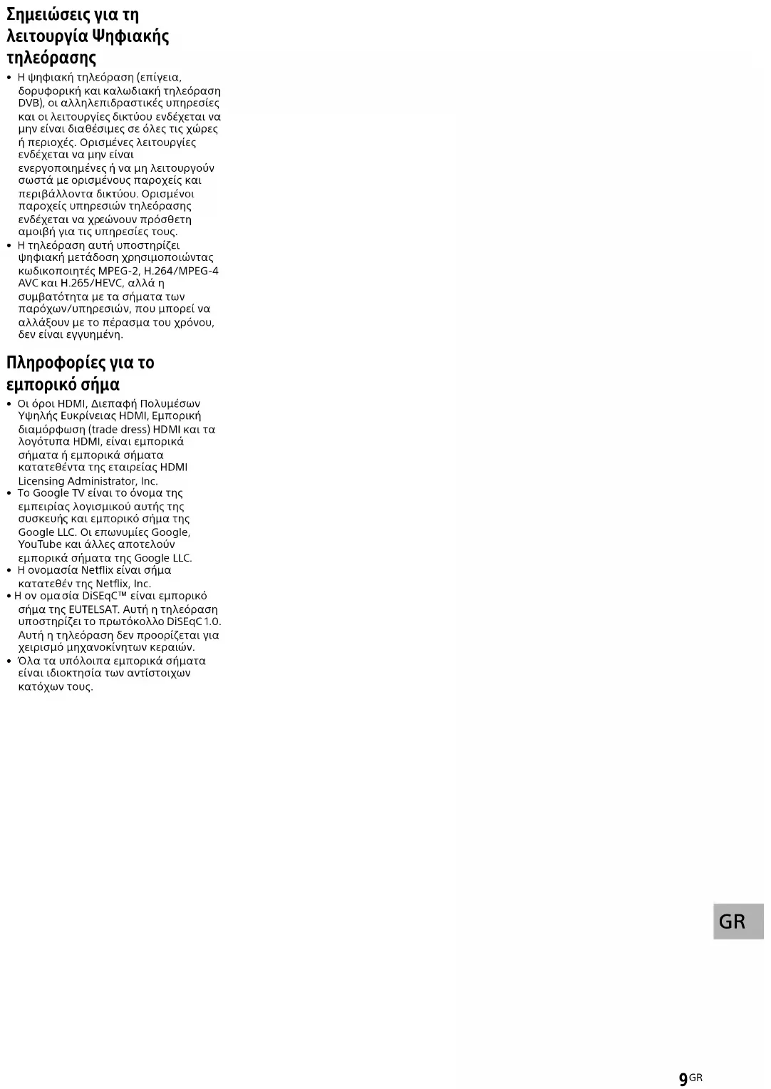 - Bu TV, MPEG-2, H.264/MPEG-4 AVC ve H.265/HEVC kodlayıcı-kod çözücülerini kullanarak dijital yayını desteklemektedir; ancak, zaman içinde değişebilecek olan tüm operatör/servis sinyalleriyle uyumluluk garanti edilemez. Ticari markaya ilişkin bilgi