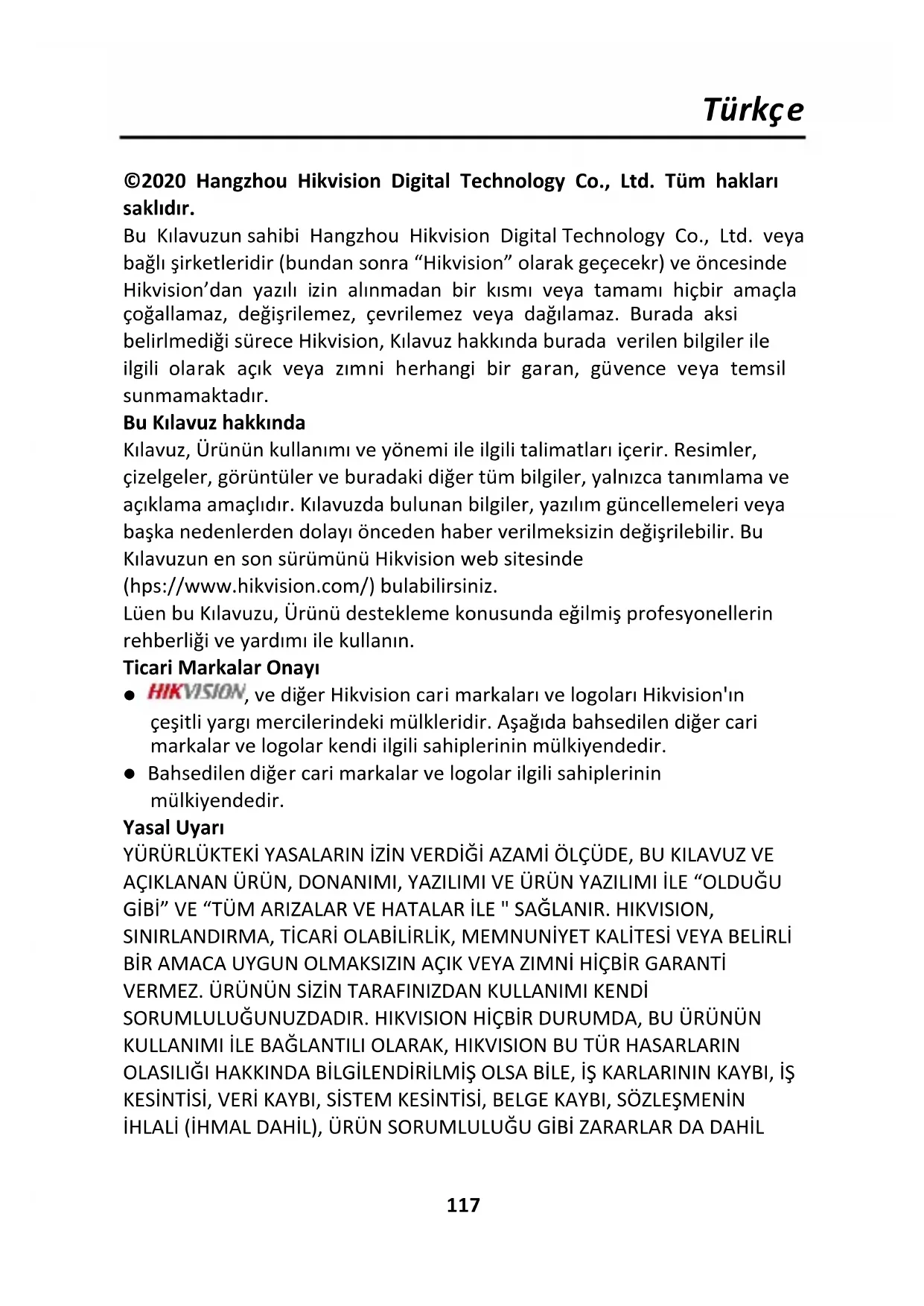©2020 Hangzhou Hikvision Digital Technology Co., Ltd. Tüm hakları saklıdır. Bu Kılavuzun sahibi Hangzhou Hikvision Digital Technology Co., Ltd. veya bağlı şirketleridir (bundan sonra “Hikvision” olarak geçecektir) ve öncesinde Hikvision’dan yazılı izin alınmadan bir kısmı veya tamamı hiçbir amaçla çoğaltılamaz, değiştirilemez, çevrilemez veya dağıtılamaz. Burada aksi belirtilmediği sürece Hikvision, Kılavuz hakkında burada verilen bilgiler ile ilgili olarak açık veya zımni herhangi bir garanti, güvence veya temsil sunmamaktadır. Bu Kılavuz hakkında Kılavuz, Ürünün kullanımı ve yönetimi ile ilgili talimatları içerir. Resimler, çizelgeler, görüntüler ve buradaki diğer tüm bilgiler, yalnızca tanımlama ve açıklama amaçlıdır. Kılavuzda bulunan bilgiler, yazılım güncellemeleri veya başka nedenlerden dolayı önceden haber verilmeksizin değiştirilebilir. Bu Kılavuzun en son sürümünü Hikvision web sitesinde (https://www.hikvision.com/) bulabilirsiniz. Lütfen bu Kılavuzu, Ürünü destekleme konusunda eğitilmiş profesyonellerin rehberliği ve yardımı ile kullanın. Ticari Markalar Onayı , ve diğer Hikvision ticari markaları ve logoları Hikvision'ın çeşitli yargı mercilerindeki mülkleridir. Aşağıda bahsedilen diğer ticari markalar ve logolar kendi ilgili sahiplerinin mülkiyetindedir. Bahsedilen diğer ticari markalar ve logolar ilgili sahiplerinin mülkiyetindedir. Yasal Uyarı YÜRÜRLÜKTEKİ YASALARIN İZİN VERDİĞİ AZAMİ ÖLÇÜDE, BU KILAVUZ VE AÇIKLANAN ÜRÜN, DONANIMI, YAZILIMI VE ÜRÜN YAZILIMI İLE “OLDUĞU GİBİ” VE “TÜM ARIZALAR VE HATALAR İLE " SAĞLANIR. HIKVISION, SINIRLANDIRMA, TİCARİ OLABİLİRLİK, MEMNUNİYET KALİTESİ VEYA BELİRLİ BİR AMACA UYGUN OLMAKSIZIN AÇIK VEYA ZIMNİ HİÇBİR GARANTİ VERMEZ. ÜRÜNÜN SİZİN TARAFINIZDAN KULLANIMI KENDİ SORUMLULUĞUNUZDADIR. HIKVISION HİÇBİR DURUMDA, BU ÜRÜNÜN KULLANIMI İLE BAĞLANTILI OLARAK, HIKVISION BU TÜR HASARLARIN OLASILIĞI HAKKINDA BİLGİLENDİRİLMİŞ OLSA BİLE, İŞ KARLARININ KAYBI, İŞ KESİNTİSİ, VERİ KAYBI, SİSTEM KESİNTİSİ, BELGE KAYBI, SÖZLEŞMENİN İHLALİ (İHMAL DAHİL), ÜRÜN SORUMLULUĞU GİBİ ZARARLAR DA DAHİLTürkçe