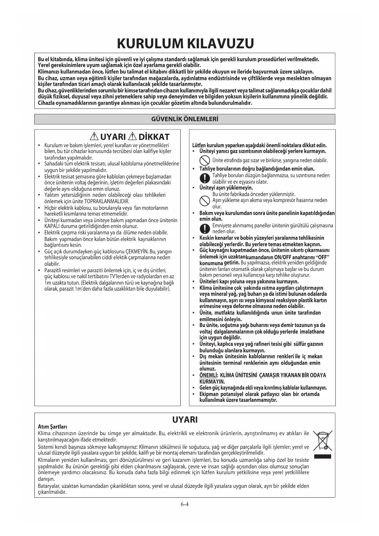 Lütfen kurulum yaparken aşağıdaki önemli noktalara dikkat edin. Üniteyi yanıcı gaz sızıntısının olabileceği yerlere kurmayın. Ünite etrafında gaz sızar ve birikirse, yangına neden olabilir. Tahliye borularının doğru bağlandığından emin olun. Tahliye boruları düzgün bağlanmazsa, su sızıntısına neden olabilir ve ev eşyasını ıslatır. Üniteyi aşırı yüklemeyin. Bu ünite fabrikada önceden yüklenmiştir. Aşırı yükleme aşırı akıma veya kompresör hasarına neden olur. Bakım veya kurulumdan sonra ünite panelinin kapatıldığından emin olun. Emniyete alınmamış paneller ünitenin gürültülü çalışmasına neden olur. Keskin kenarlar ve bobin yüzeyleri yaralanma tehlikesinin olabileceği yerlerdir. Bu yerlere temas etmekten kaçının. Güç kaynağnı kapatmadan önce, ünitenin sıkıntı çıkarmasını önlemek için uzaktan kumandanın ON/OFF anahtarını “OFF” konumuna getirin. Bu yapılmazsa, elektrik yeniden geldiğinde ünitenin fanları otomatik olarak çalışmaya başlar ve bu durum bakım personeli veya kullanıcıya karşı tehlike oluşturur. Üniteleri kapı yoluna veya yakınına kurmayın. Klima ünitesine çok yakında ısıtma aygıtları çalıştırmayın veya mineral yağ, yağ buharı ya da istimi bulunan odalarda kullanmayın, aşırı ısı veya kimyasal reaksiyon plastik kartın erimesine veya deforme olmasına neden olabilir. Ünite, mutfakta kullanıldığında unun ünite tarafından emilmesini önleyin. Bu ünite, soğutma yağı buharını veya demir tozunun ya da voltaj dalgalanmalarının çok olduğu yerlerde imalathane için uygun değildir. Üniteyi, kaplıca veya yağ rafineri tesisi gibi sülfür gazının bulunduğu alanlara kurmayın. Dış mekan ünitesinin kablolarının renkleri ile iç mekan ünitesinin terminal renklerinin aynı olduğundan emin olunuz. ÖNEMLİ: KLİMA ÜNİTESİNİ ÇAMAŞIR YIKANAN BİR ODAYA KURMAYIN. Gelen güç kaynağında ekli veya kıvrılmış kablolar kullanmayın. Ekipman potansiyel olarak patlayıcı olan bir ortamda kullanılmak üzere tasarlanmamıştır.