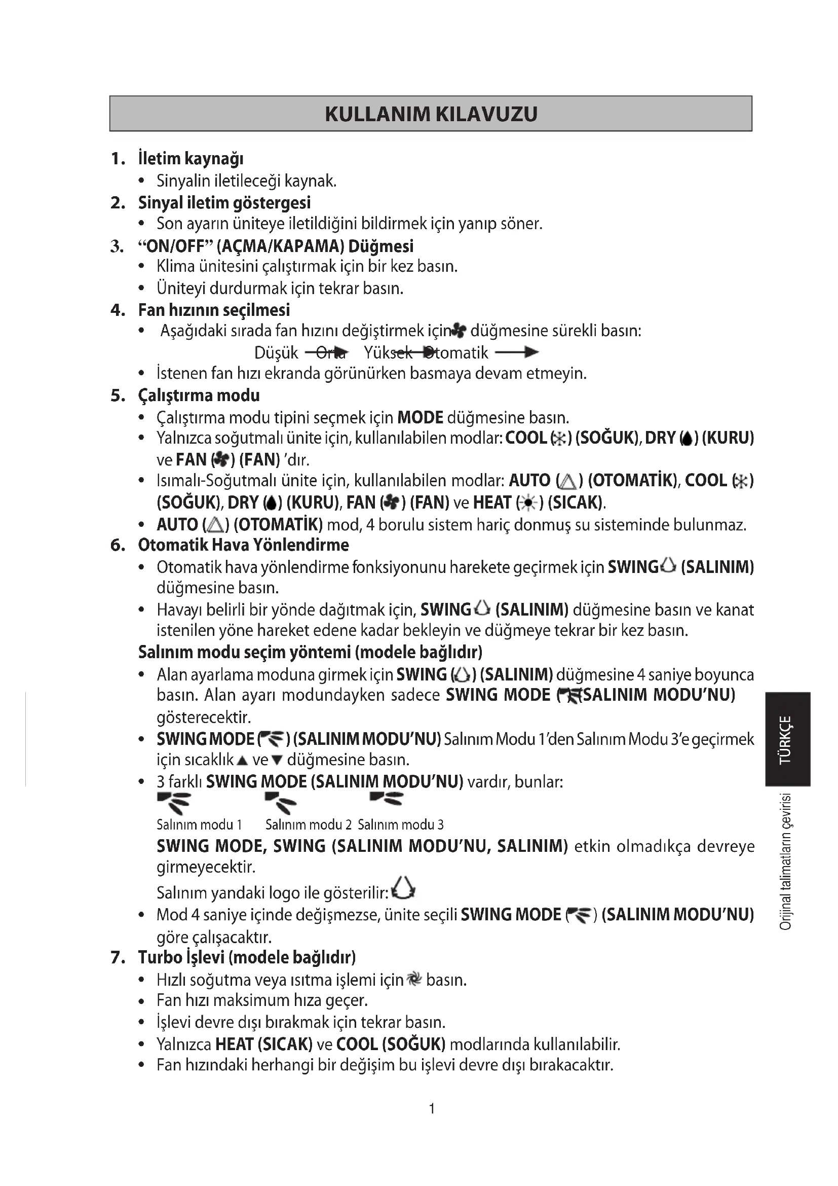 L8 ПЕРЕГРУЗКА ПО ТОКУ ПРЕОБРАЗОВАТЕЛЯ КОМПРЕССОРА L9 ПРЕДОТВРАЩЕНИЕ ПЕРЕГРУЗКИ ПО ТОКУ КОМПРЕССОРА LC ОШИБКА СВЯЗИ (ПЛАТ УПРАВЛЕНИЯ НАРУЖНОГО БЛОКА И ПЛАТА ПРЕОБРАЗОВАТЕЛЯ) P1 ОБРЫВ ФАЗЫ ИЛИ НЕСБАЛАНСИРОВАННОСТЬ НАПРЯЖЕНИЯ P4 ТЕРМИСТОР РАДИАТОРА ЗАМКНУТ/ОТКРЫТ PJ ОШИБКА УСТАНОВКИ ПРОИЗВОДИТЕЛЬНОСТИ U0 НЕДОСТАТОЧНО ГАЗА U2 НЕДОПУСТИМОЕ ЗНАЧЕНИЕ НАПРЯЖЕНИЯ ПОСТОЯННОГО ТОКА U4 ОШИБКА КОММУНИКАЦИИ U7 ОШИБКА КОММУНИКАЦИИ (ПЕЧАТНАЯ ПЛАТА И ПЕЧАТНАЯ ПЛАТА ИСМ НАРУЖНОГО УПРАВЛЕНИЯ) UA ОШИБКА УСТАНОВКИ UF НЕСООТВЕТСТВИЕ ТРУБОПРОВОДА И ПРОВОДКИ / НЕСООТВЕТСТВУЮЩАЯ ПРОВОДКА НЕДОСТАТОЧНО ГАЗА UH АНТИФРИЗ (ДРУГИЕ ПОМЕЩЕНИЯ) 6 OM-GS02-1111(3)Dk(siesta)RU.inSec1:4 Sec1:46 OM-GS02-1111(3)Dk(siesta)RU.inSec1:4 Sec1:4 4/8/14 1:33:40 PM4/8/14 1:33:40 PM1 KULLANIM KILAVUZU İletim kaynağı Sinyalin iletileceği kaynak. Sinyal iletim göstergesi Son ayarın üniteye iletildiğini bildirmek için yanıp söner. “ON/OFF” (AÇMA/KAPAMA) Düğmesi Klima ünitesini çalıştırmak için bir kez basın. Üniteyi durdurmak için tekrar basın. Fan hızının seçilmesi Aşağıdaki sırada fan hızını değiştirmek için düğmesine sürekli basın: Düşük Orta Yüksek Otomatik İstenen fan hızı ekranda görünürken basmaya devam etmeyin. Çalıştırma modu Çalıştırma modu tipini seçmek için MODE düğmesine basın. Yalnızca soğutmalı ünite için, kullanılabilen modlar: COOL ( ) (SOĞUK), DRY ( ) (KURU) ve FAN ( ) (FAN) ’dır. Isımalı-Soğutmalı ünite için, kullanılabilen modlar: AUTO ( ) (OTOMATİK), COOL ( ) (SOĞUK), DRY ( ) (KURU), FAN ( ) (FAN) ve HEAT ( ) (SICAK). AUTO ( ) (OTOMATİK) mod, 4 borulu sistem hariç donmuş su sisteminde bulunmaz. Otomatik Hava Yönlendirme Otomatik hava yönlendirme fonksiyonunu harekete geçirmek için SWING (SALINIM) düğmesine basın. Havayı belirli bir yönde dağıtmak için, SWING (SALINIM) düğmesine basın ve kanat istenilen yöne hareket edene kadar bekleyin ve düğmeye tekrar bir kez basın. Salınım modu seçim yöntemi (modele bağlıdır) Alan ayarlama moduna girmek için SWING ( ) (SALINIM) düğmesine 4 saniye boyunca basın. Alan ayarı modundayken sadece SWING MODE ( ) (SALINIM MODU’NU) gösterecektir. SWING MODE ( ) (SALINIM MODU’NU) Salınım Modu 1’den Salınım Modu 3’e geçirmek için sıcaklık ve düğmesine basın. 3 farklı SWING MODE (SALINIM MODU’NU) vardır, bunlar: Salınım modu 1 Salınım modu 2 Salınım modu 3 SWING MODE, SWING (SALINIM MODU’NU, SALINIM) etkin olmadıkça devreye girmeyecektir. Salınım yandaki logo ile gösterilir: Mod 4 saniye içinde değişmezse, ünite seçili SWING MODE ( ) (SALINIM MODU’NU) göre çalışacaktır. Turbo İşlevi (modele bağlıdır) Hızlı soğutma veya ısıtma işlemi için basın. Fan hızı maksimum hıza geçer. İşlevi devre dışı bırakmak için tekrar basın. Yalnızca HEAT (SICAK) ve COOL (SOĞUK) modlarında kullanılabilir. Fan hızındaki herhangi bir değişim bu işlevi devre dışı bırakacaktır.