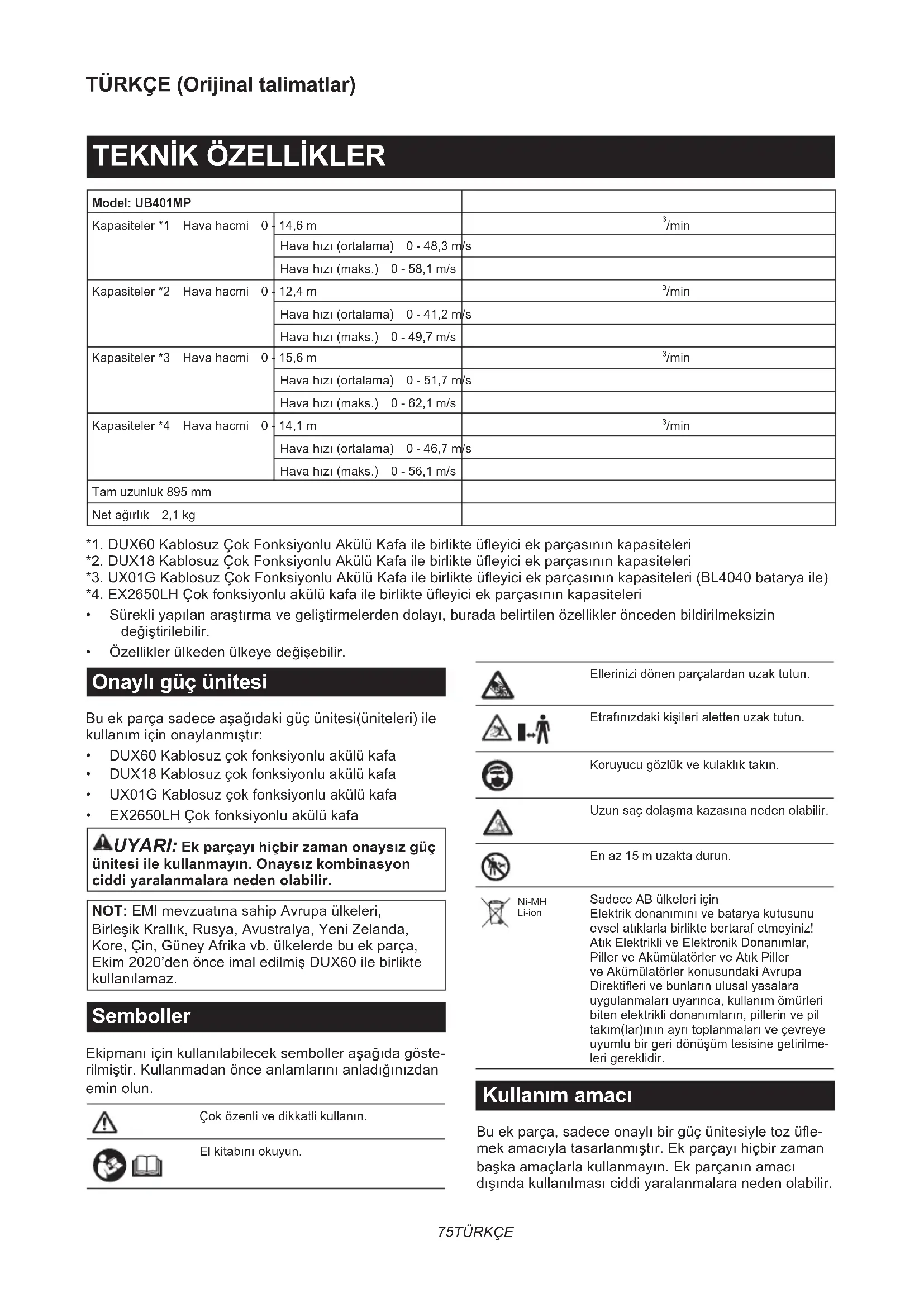 - EX2650LHÇokfonksiyonluakülükafa UYARI: Ek parçayı hiçbir zaman onaysız güç ünitesi ile kullanmayın. Onaysız kombinasyon ciddi yaralanmalara neden olabilir. NOT:EMImevzuatınasahipAvrupaülkeleri, BirleşikKrallık,Rusya,Avustralya,YeniZelanda, Kore,Çin,GüneyAfrikavb.ülkelerdebuekparça, Ekim2020’denönceimaledilmişDUX60ilebirlikte kullanılamaz. Semboller Ekipmanıiçinkullanılabileceksembolleraşağıdagöste- rilmiştir.Kullanmadanönceanlamlarınıanladığınızdan eminolun. Çoközenlivedikkatlikullanın. Elkitabınıokuyun. Ellerinizidönenparçalardanuzaktutun. Etrafınızdakikişilerialettenuzaktutun. Koruyucugözlükvekulaklıktakın. Uzunsaçdolaşmakazasınanedenolabilir. En az 15 m uzakta durun. Ni-MH Li-ion SadeceABülkeleriiçin Elektrikdonanımınıvebataryakutusunu evselatıklarlabirliktebertarafetmeyiniz! AtıkElektrikliveElektronikDonanımlar, PillerveAkümülatörlerveAtıkPiller veAkümülatörlerkonusundakiAvrupa Direktierivebunlarınulusalyasalara uygulanmalarıuyarınca,kullanımömürleri bitenelektriklidonanımların,pillerinvepil takım(lar)ınınayrıtoplanmalarıveçevreye uyumlubirgeridönüşümtesisinegetirilme- lerigereklidir. Kullanım amacı Buekparça,sadeceonaylıbirgüçünitesiyletozüe- mekamacıylatasarlanmıştır.Ekparçayıhiçbirzaman başkaamaçlarlakullanmayın.Ekparçanınamacı dışındakullanılmasıciddiyaralanmalaranedenolabilir.76 TÜRKÇE EC Uygunluk Beyanı Sadece Avrupa ülkeleri için Üreticifirma:Makita Europe N.V.,İşadresi:Jan- Baptist Vinkstraat 2 3070 Kortenberg BELÇİKA olarak Hiroshi Tsujimura’yateknikdosyayıderleme yetkisiverirveyeganebizimsorumluluğumuzdaaşa- ğıdaadıverilenürünün/ürünlerin: Adı:Üeyici Ek Parçası.TipAdı:UB401MP. 2006/42/EC’ninilgilitümhükümlerinikarşıladığınıve ayrıcaaşağıdakiEC/EUDirektierinin:2000/14/ECilgili hükümlerinikarşıladığınıveaşağıdakiUyumluHale GetirilmişStandartlarauygunolarakimaledildiğini beyanederiz:EN 15503:2009+A1:2013+A2:2015, EN 50636-2-100:2014. Beyanyerivetarihi:Kortenberg, Belçika. 29. 10. 2020 Sorumlukişi:Hiroshi Tsujimura, Direktör - Makita Europe N.V.