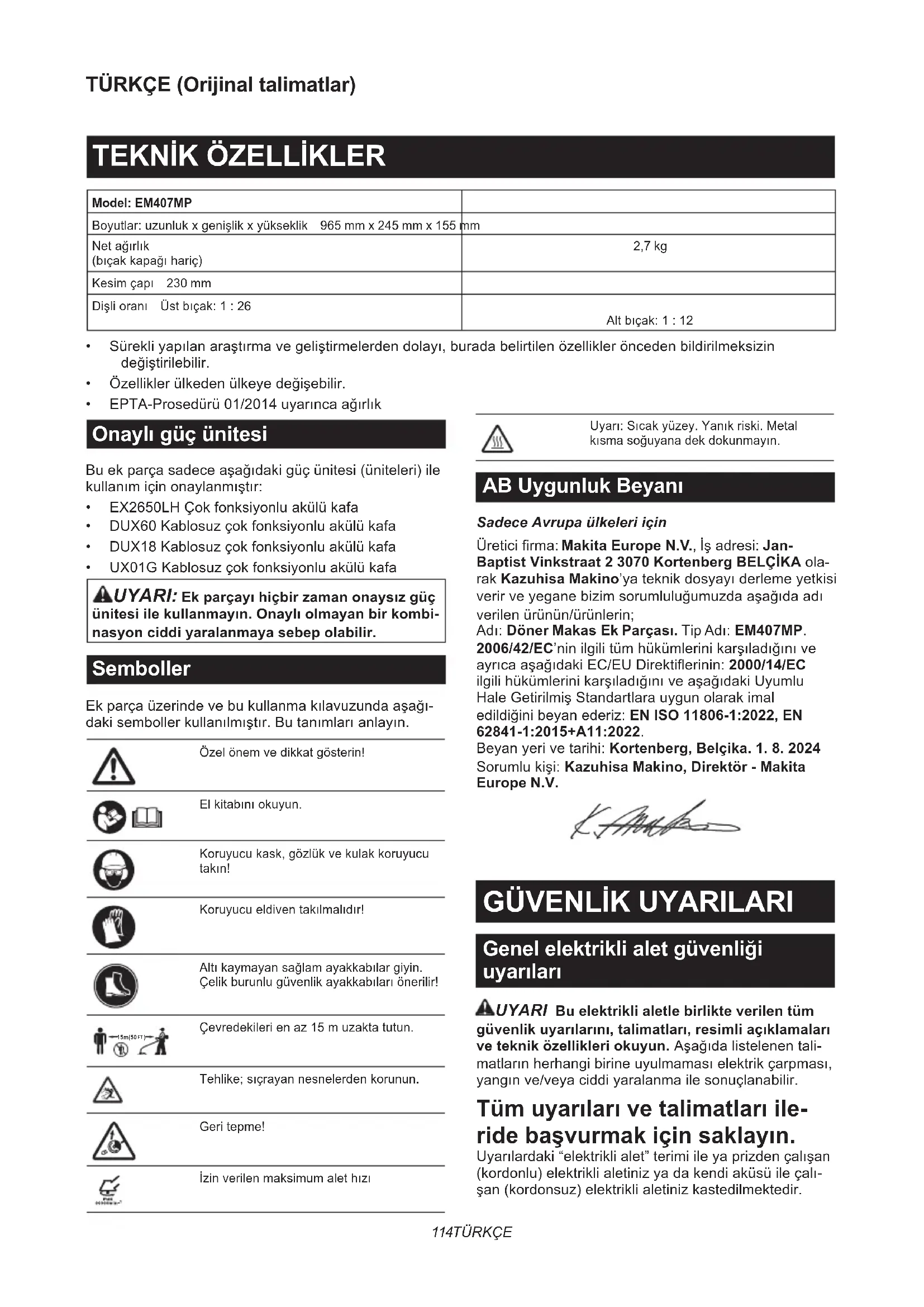Model: EM407MPBoyutlar:uzunlukxgenişlikxyükseklik 965 mm x 245 mm x 155 mmNetağırlık(bıçakkapağıhariç)2,7 kgKesimçapı 230 mmDişlioranı Üstbıçak:1:26 Altbıçak:1:12• Sürekliyapılanaraştırmavegeliştirmelerdendolayı,buradabelirtilenözellikleröncedenbildirilmeksizindeğiştirilebilir.• Özelliklerülkedenülkeyedeğişebilir.• EPTA-Prosedürü01/2014uyarıncaağırlık Onaylı güç ünitesi Buekparçasadeceaşağıdakigüçünitesi(üniteleri)ilekullanımiçinonaylanmıştır:• EX2650LHÇokfonksiyonluakülükafa• DUX60Kablosuzçokfonksiyonluakülükafa• DUX18Kablosuzçokfonksiyonluakülükafa• UX01GKablosuzçokfonksiyonluakülükafa UYARI: Ek parçayı hiçbir zaman onaysız güç ünitesi ile kullanmayın. Onaylı olmayan bir kombi-nasyon ciddi yaralanmaya sebep olabilir. Semboller Ekparçaüzerindevebukullanmakılavuzundaaşağı-dakisembollerkullanılmıştır.Butanımlarıanlayın.Özelönemvedikkatgösterin! Elkitabınıokuyun.Koruyucukask,gözlükvekulakkoruyucutakın!Koruyucueldiventakılmalıdır!Altıkaymayansağlamayakkabılargiyin.Çelikburunlugüvenlikayakkabılarıönerilir!15m(50