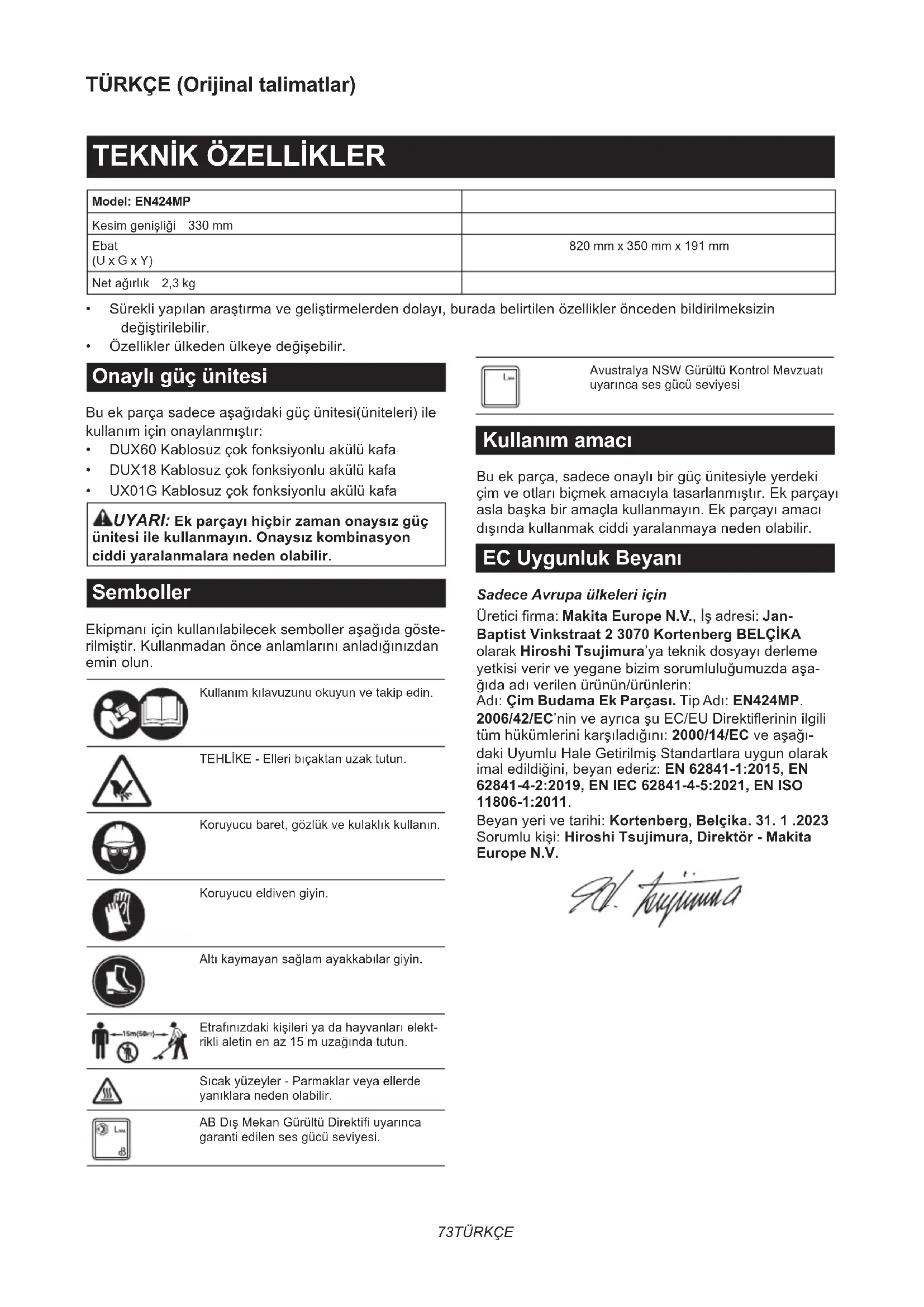- UX01GKablosuzçokfonksiyonluakülükafa UYARI: Ek parçayı hiçbir zaman onaysız güç ünitesi ile kullanmayın. Onaysız kombinasyon ciddi yaralanmalara neden olabilir. Semboller Ekipmanıiçinkullanılabileceksembolleraşağıdagöste- rilmiştir.Kullanmadanönceanlamlarınıanladığınızdan eminolun. Kullanımkılavuzunuokuyunvetakipedin. TEHLİKE-Elleribıçaktanuzaktutun. Koruyucubaret,gözlükvekulaklıkkullanın. Koruyucueldivengiyin. Altıkaymayansağlamayakkabılargiyin. Etrafınızdakikişileriyadahayvanlarıelekt- riklialetinenaz15muzağındatutun. Sıcakyüzeyler-Parmaklarveyaellerde yanıklaranedenolabilir. ABDışMekanGürültüDirektifiuyarınca garantiedilensesgücüseviyesi. AvustralyaNSWGürültüKontrolMevzuatı uyarıncasesgücüseviyesi Kullanım amacı Buekparça,sadeceonaylıbirgüçünitesiyleyerdeki çimveotlarıbiçmekamacıylatasarlanmıştır.Ekparçayı aslabaşkabiramaçlakullanmayın.Ekparçayıamacı dışındakullanmakciddiyaralanmayanedenolabilir. EC Uygunluk Beyanı Sadece Avrupa ülkeleri için Üreticifirma:Makita Europe N.V.,İşadresi:Jan- Baptist Vinkstraat 2 3070 Kortenberg BELÇİKA olarak Hiroshi Tsujimura’yateknikdosyayıderleme yetkisiverirveyeganebizimsorumluluğumuzdaaşa- ğıdaadıverilenürünün/ürünlerin: Adı:Çim Budama Ek Parçası.TipAdı:EN424MP. 2006/42/EC’ninveayrıcaşuEC/EUDirektierininilgili tümhükümlerinikarşıladığını:2000/14/ECveaşağı- dakiUyumluHaleGetirilmişStandartlarauygunolarak imaledildiğini,beyanederiz:EN 62841-1:2015, EN 62841-4-2:2019, EN IEC 62841-4-5:2021, EN ISO 11806-1:2011. Beyanyerivetarihi:Kortenberg, Belçika. 31. 1 .2023 Sorumlukişi:Hiroshi Tsujimura, Direktör - Makita Europe N.V.74 TÜRKÇE