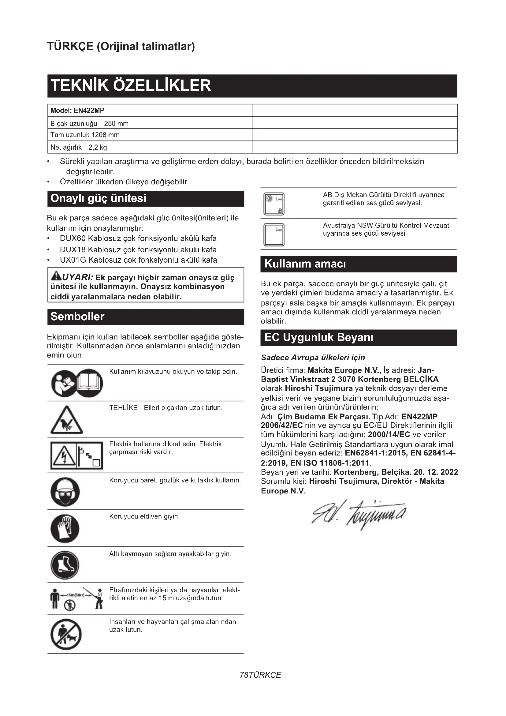 - UX01GKablosuzçokfonksiyonluakülükafa UYARI: Ek parçayı hiçbir zaman onaysız güç ünitesi ile kullanmayın. Onaysız kombinasyon ciddi yaralanmalara neden olabilir. Semboller Ekipmanıiçinkullanılabileceksembolleraşağıdagöste- rilmiştir.Kullanmadanönceanlamlarınıanladığınızdan eminolun. Kullanımkılavuzunuokuyunvetakipedin. TEHLİKE-Elleribıçaktanuzaktutun. Elektrikhatlarınadikkatedin.Elektrik çarpmasıriskivardır. Koruyucubaret,gözlükvekulaklıkkullanın. Koruyucueldivengiyin. Altıkaymayansağlamayakkabılargiyin. Etrafınızdakikişileriyadahayvanlarıelekt- riklialetinenaz15muzağındatutun. İnsanlarıvehayvanlarıçalışmaalanından uzak tutun. ABDışMekanGürültüDirektifiuyarınca garantiedilensesgücüseviyesi. AvustralyaNSWGürültüKontrolMevzuatı uyarıncasesgücüseviyesi Kullanım amacı Buekparça,sadeceonaylıbirgüçünitesiyleçalı,çit veyerdekiçimleribudamaamacıylatasarlanmıştır.Ek parçayıaslabaşkabiramaçlakullanmayın.Ekparçayı amacıdışındakullanmakciddiyaralanmayaneden olabilir. EC Uygunluk Beyanı Sadece Avrupa ülkeleri için Üreticifirma:Makita Europe N.V.,İşadresi:Jan- Baptist Vinkstraat 2 3070 Kortenberg BELÇİKA olarak Hiroshi Tsujimura’yateknikdosyayıderleme yetkisiverirveyeganebizimsorumluluğumuzdaaşa- ğıdaadıverilenürünün/ürünlerin: Adı:Çim Budama Ek Parçası.TipAdı:EN422MP. 2006/42/EC’ninveayrıcaşuEC/EUDirektierininilgili tümhükümlerinikarşıladığını:2000/14/ECveverilen UyumluHaleGetirilmişStandartlarauygunolarakimal edildiğinibeyanederiz:EN62841-1:2015, EN 62841-4- 2:2019, EN ISO 11806-1:2011. Beyanyerivetarihi:Kortenberg, Belçika. 20. 12. 2022 Sorumlukişi:Hiroshi Tsujimura, Direktör - Makita Europe N.V.79 TÜRKÇE