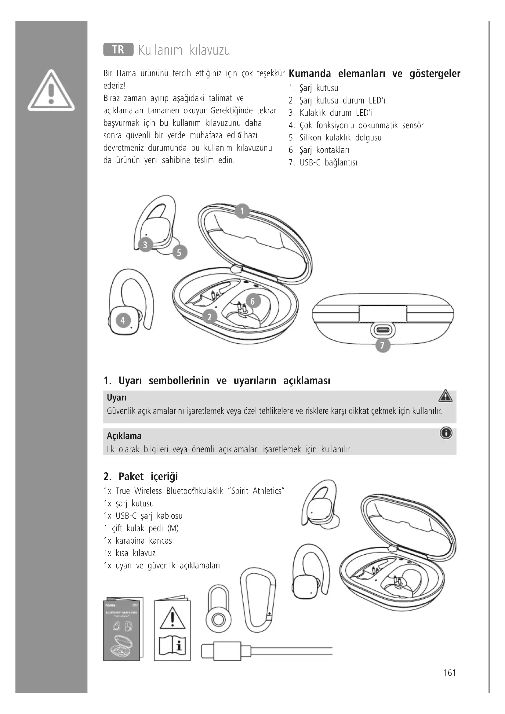 kulaklık “Spirit Athletics” 1x şarj kutusu 1x USB-C şarj kablosu 1 çift kulak pedi (M) 1x karabina kancası 1x kısa kılavuz 1x uyarı ve güvenlik açıklamaları T Kullanım kılavuzu
