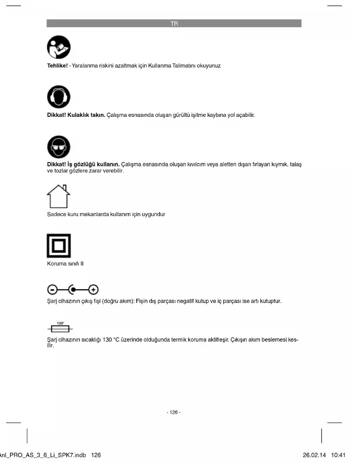 Tehlike! - Yaralanma riskini azaltmak için Kullanma Talimatını okuyunuz Dikkat! Kulaklık takın. Çalışma esnasında oluşan gürültü işitme kaybına yol açabilir. Dikkat! İş gözlüğü kullanın. Çalışma esnasında oluşan kıvılcım veya aletten dışarı fırlayan kıymık, talaş ve tozlar gözlere zarar verebilir. Sadece kuru mekanlarda kullanım için uygundur Koruma sınıfı II Şarj cihazının çıkış fi şi (doğru akım): Fişin dış parçası negatif kutup ve iç parçası ise artı kutuptur. 130° Şarj cihazının sıcaklığı 130 °C üzerinde olduğunda termik koruma aktifl eşir. Çıkışın akım beslemesi kes- ilir. Anl_PRO_AS_3_6_Li_SPK7.indb 126Anl_PRO_AS_3_6_Li_SPK7.indb 126 26.02.14 10:4126.02.14 10:41TR