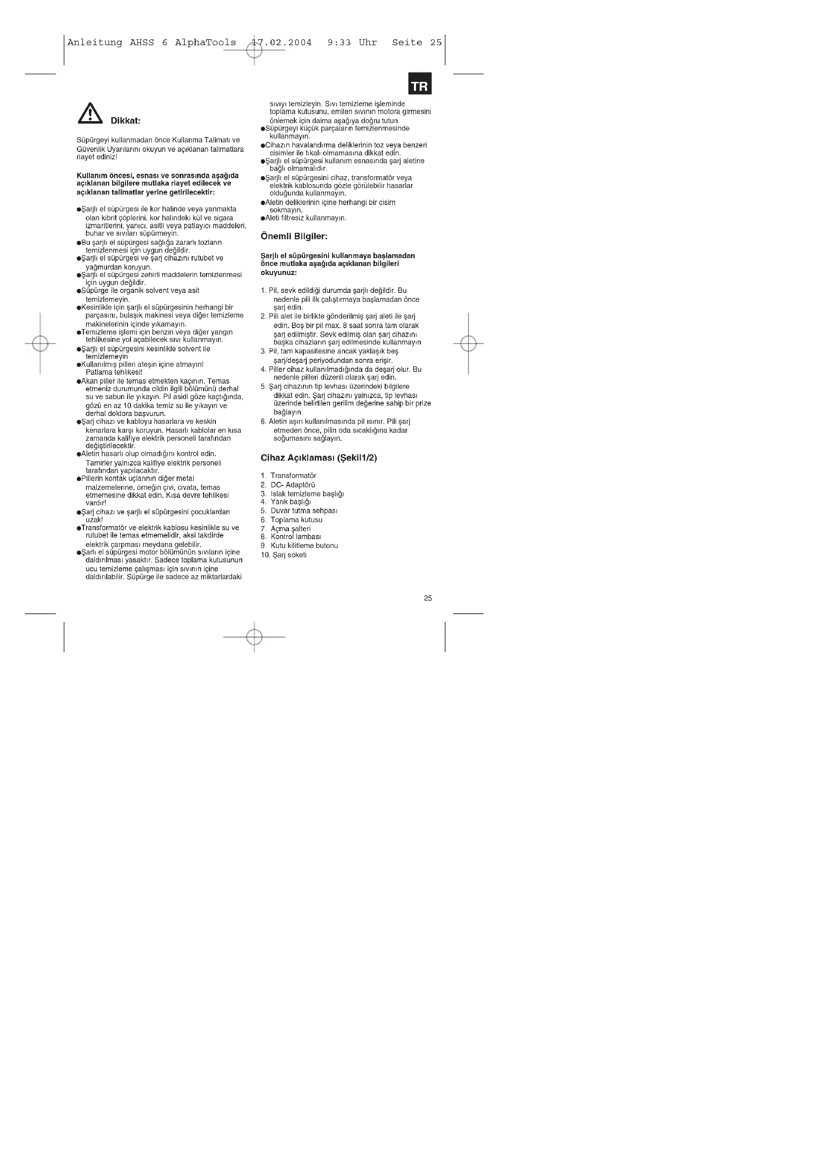 Baterije i elektrouredjaji pogonjeni baterijamasadrže materijale opasne za okoliš. Uredjaje sbaterijama ne bacajte u smeće. Nakon što seuredjaj pokvari ili istroši izvadite bateriju i pošaljitega na adresu iSC GmbH, Eschenstraße 6 in D-94405 Landau, ili, u slučaju, da se baterija nemože izvaditi, pošaljite cijeli uredjaj. Samo takoproizvodjač može jamčiti stručno zbrinjavanje baterija. Anleitung AHSS 6 AlphaTools 17.02.2004 9:33 Uhr Seite 24 Dikkat: Süpürgeyi kullanmadan önce Kullanma Talimat∂ ve Güvenlik Uyar∂lar∂n∂ okuyun ve aç∂klanan talimatlara riayet ediniz! Kullan∂m öncesi, esnas∂ ve sonras∂nda aµa©∂da aç∂klanan bilgilere mutlaka riayet edilecek ve aç∂klanan talimatlar yerine getirilecektir: Ωarjl∂ el süpürgesi ile kor halinde veya yanmakta olan kibrit çöplerini, kor halindeki kül ve sigara izmaritlerini, yan∂c∂, asitli veya patlay∂c∂ maddeleri, buhar ve s∂v∂lar∂ süpürmeyin. Bu µarjl∂ el süpürgesi sa©l∂©a zararl∂ tozlar∂n temizlenmesi için uygun de©ildir. Ωarjl∂ el süpürgesi ve µarj cihaz∂n∂ rutubet ve ya©murdan koruyun. Ωarjl∂ el süpürgesi zehirli maddelerin temizlenmesi için uygun de©ildir. Süpürge ile organik solvent veya asit temizlemeyin. Kesinlikle için µarjl∂ el süpürgesinin herhangi bir parças∂n∂, bulaµ∂k makinesi veya di©er temizleme makinelerinin içinde y∂kamay∂n. Temizleme iµlemi için benzin veya di©er yang∂n tehlikesine yol açabilecek s∂v∂ kullanmay∂n. Ωarjl∂ el süpürgesini kesinlikle solvent ile temizlemeyin Kullan∂lm∂µ pilleri ateµin içine atmay∂n! Patlama tehlikesi! Akan piller ile temas etmekten kaç∂n∂n. Temas etmeniz durumunda cildin ilgili bölümünü derhal su ve sabun ile y∂kay∂n. Pil asidi göze kaçt∂©∂nda, gözü en az 10 dakika temiz su ile y∂kay∂n ve derhal doktora baµvurun. Ωarj cihaz∂ ve kabloyu hasarlara ve keskin kenarlara karµ∂ koruyun. Hasarl∂ kablolar en k∂sa zamanda kalifiye elektrik personeli taraf∂ndan de©iµtirilecektir. Aletin hasarl∂ olup olmad∂©∂n∂ kontrol edin. Tamirler yaln∂zca kalifiye elektrik personeli taraf∂ndan yap∂lacakt∂r. Pillerin kontak uçlar∂n∂n di©er metal malzemelerine, örne©in çivi, civata, temas etmemesine dikkat edin. K∂sa devre tehlikesi vard∂r! Ωarj cihaz∂ ve µarjl∂ el süpürgesini çocuklardan uzak! Transformatör ve elektrik kablosu kesinlikle su ve rutubet ile temas etmemelidir, aksi takdirde elektrik çarpmas∂ meydana gelebilir. Ωarl∂ el süpürgesi motor bölümünün s∂v∂lar∂n içine dald∂r∂lmas∂ yasakt∂r. Sadece toplama kutusunun ucu temizleme çal∂µmas∂ için s∂v∂n∂n içine dald∂r∂labilir. Süpürge ile sadece az miktarlardaki s∂v∂y∂ temizleyin. S∂v∂ temizleme iµleminde toplama kutusunu, emilen s∂v∂n∂n motora girmesini önlemek için daima aµa©∂ya do©ru tutun. Süpürgeyi küçük parçalar∂n temizlenmesinde kullanmay∂n. Cihaz∂n havaland∂rma deliklerinin toz veya benzeri cisimler ile t∂kal∂ olmamas∂na dikkat edin. Ωarjl∂ el süpürgesi kullan∂m esnas∂nda µarj aletine ba©l∂ olmamal∂d∂r. Ωarjl∂ el süpürgesini cihaz, transformatör veya elektrik kablosunda gözle görülebilir hasarlar oldu©unda kullanmay∂n. Aletin deliklerinin içine herhangi bir cisim sokmay∂n. Aleti filtresiz kullanmay∂n. Önemli Bilgiler: Ωarjl∂ el süpürgesini kullanmaya baµlamadan önce mutlaka aµa©∂da aç∂klanan bilgileri okuyunuz: