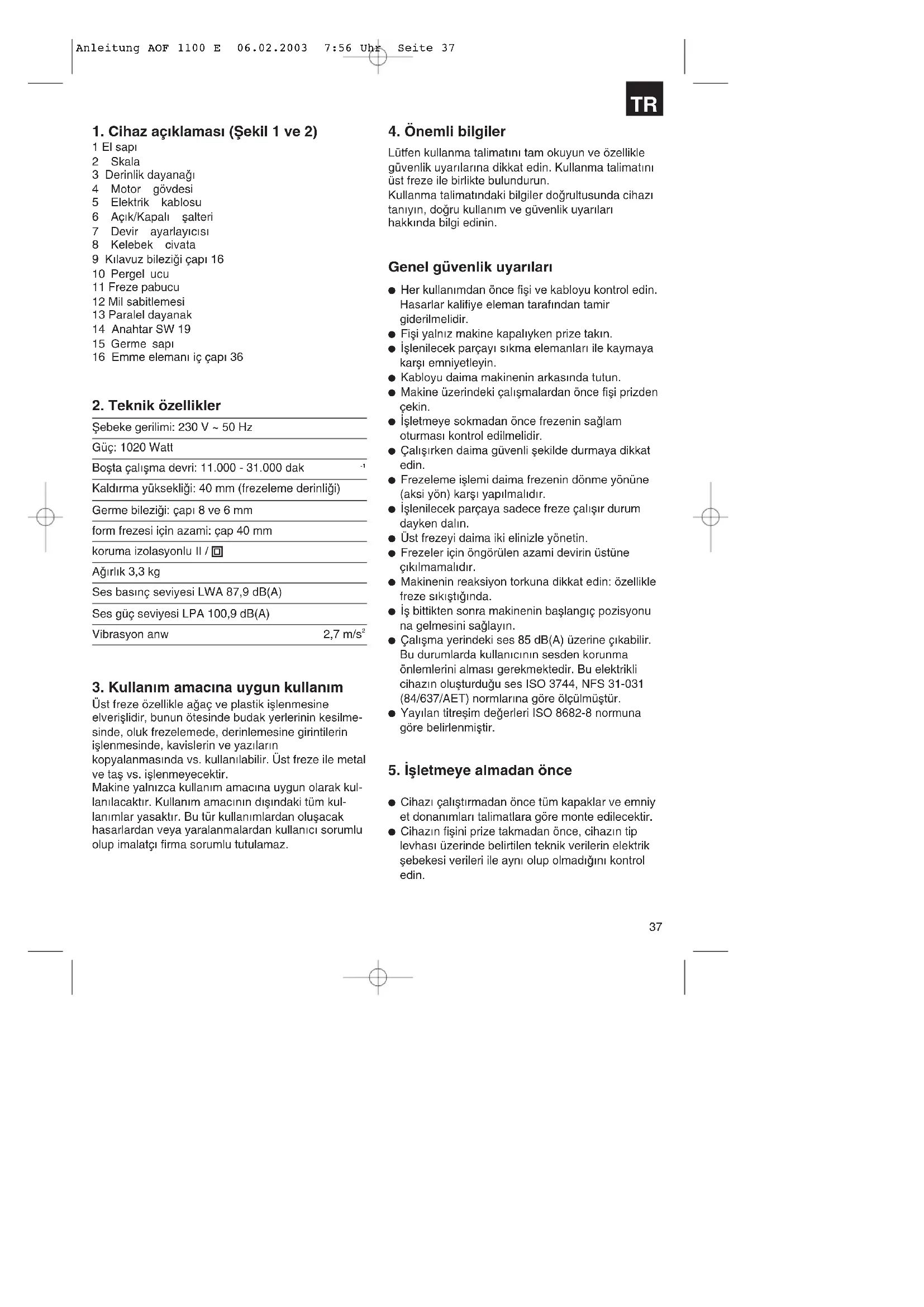Lütfen kullanma talimat∂n∂ tam okuyun ve özellikle güvenlik uyar∂lar∂na dikkat edin. Kullanma talimat∂n∂ üst freze ile birlikte bulundurun. Kullanma talimat∂ndaki bilgiler do©rultusunda cihaz∂ tan∂y∂n, do©ru kullan∂m ve güvenlik uyar∂lar∂ hakk∂nda bilgi edinin. Genel güvenlik uyar∂lar∂ Her kullan∂mdan önce fiµi ve kabloyu kontrol edin. Hasarlar kalifiye eleman taraf∂ndan tamir giderilmelidir. Fiµi yaln∂z makine kapal∂yken prize tak∂n. ∑µlenilecek parçay∂ s∂kma elemanlar∂ ile kaymaya karµ∂ emniyetleyin. Kabloyu daima makinenin arkas∂nda tutun. Makine üzerindeki çal∂µmalardan önce fiµi prizden çekin. ∑µletmeye sokmadan önce frezenin sa©lam oturmas∂ kontrol edilmelidir. Çal∂µ∂rken daima güvenli µekilde durmaya dikkat edin. Frezeleme iµlemi daima frezenin dönme yönüne (aksi yön) karµ∂ yap∂lmal∂d∂r. ∑µlenilecek parçaya sadece freze çal∂µ∂r durum dayken dal∂n. Üst frezeyi daima iki elinizle yönetin. Frezeler için öngörülen azami devirin üstüne ç∂k∂lmamal∂d∂r. Makinenin reaksiyon torkuna dikkat edin: özellikle freze s∂k∂µt∂©∂nda. ∑µ bittikten sonra makinenin baµlang∂ç pozisyonu na gelmesini sa©lay∂n. Çal∂µma yerindeki ses 85 dB(A) üzerine ç∂kabilir. Bu durumlarda kullan∂c∂n∂n sesden korunma önlemlerini almas∂ gerekmektedir. Bu elektrikli cihaz∂n oluµturdu©u ses ISO 3744, NFS 31-031 (84/637/AET) normlar∂na göre ölçülmüµtür. Yay∂lan titreµim de©erleri ISO 8682-8 normuna göre belirlenmiµtir.