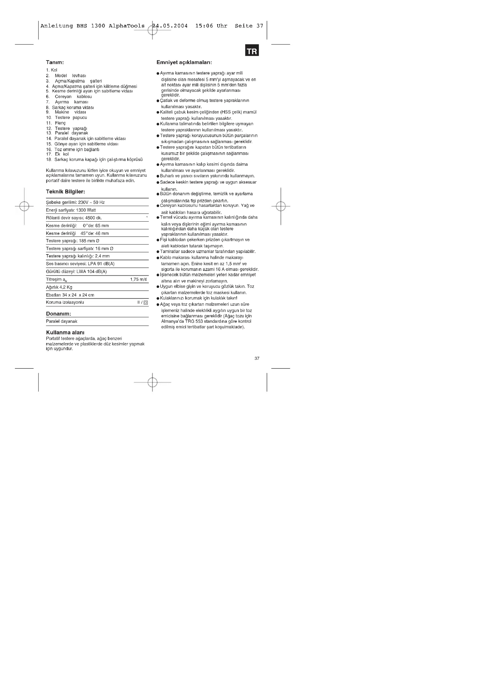 sigorta ile koruman∂n azami 16 A olmas∂ gereklidir. ∑µlenecek bütün malzemeleri yeteri kadar emniyet alt∂na al∂n ve makineyi zorlamay∂n. Uygun elbise giyin ve koruyucu gözlük tak∂n. Toz ç∂kartan malzemelerde toz maskesi kullan∂n. Kulaklar∂n∂z∂ korumak için kulakl∂k tak∂n! Aπaç veya toz ç∂kartan malzemeleri uzun süre iµlemeniz halinde elektrikli ayg∂t∂n uygun bir toz emicisine baπlanmas∂ gereklidir (Aπaç tozu için Almanya’da TRG 553 standard∂na göre kontrol edilmiµ emici tertibatlar µart koµulmaktad∂r). Anleitung BHS 1300 AlphaTools 24.05.2004 15:06 Uhr Seite 3738