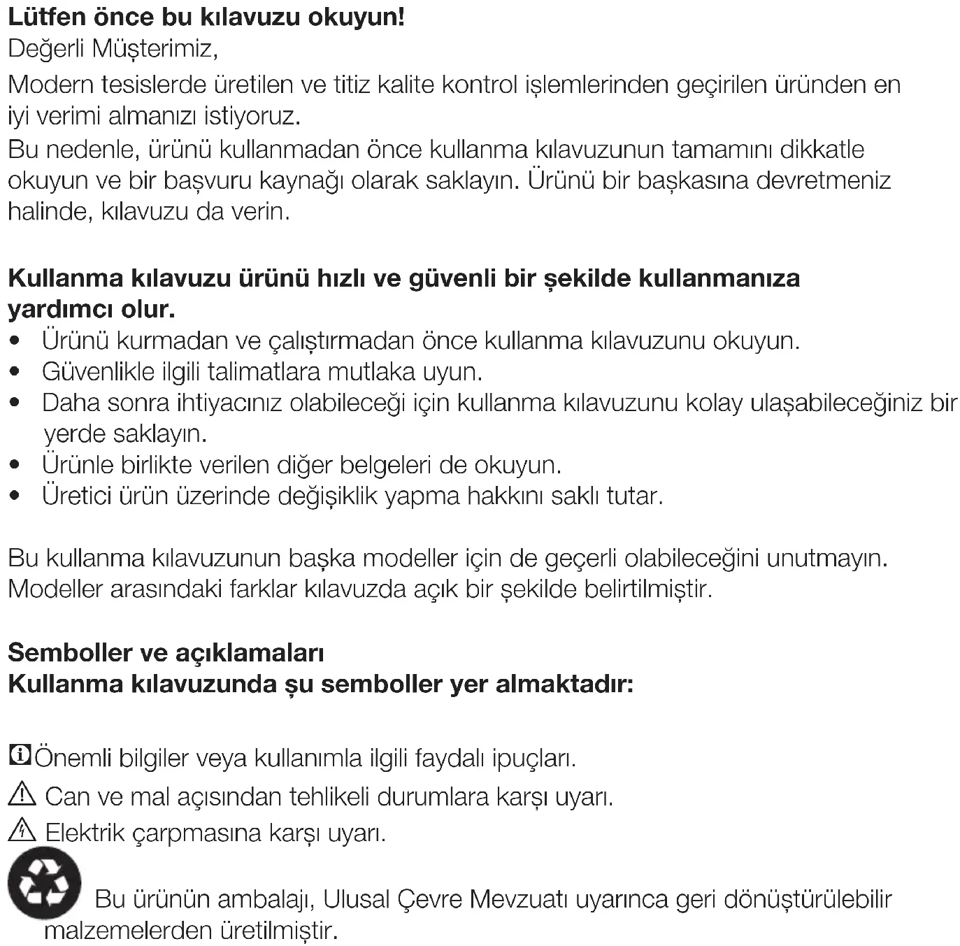 - Üretici ürün üzerinde değişiklik yapma hakkını saklı tutar. Bu kullanma kılavuzunun başka modeller için de geçerli olabileceğini unutmayın. Modeller arasındaki farklar kılavuzda açık bir şekilde belirtilmiştir. Semboller ve açıklamaları Kullanma kılavuzunda şu semboller yer almaktadır: CÖnemli bilgiler veya kullanımla ilgili faydalı ipuçları. A Can ve mal açısından tehlikeli durumlara karşı uyarı. B Elektrik çarpmasına karşı uyarı. Bu ürünün ambalajı, Ulusal Çevre Mevzuatı uyarınca geri dönüştürülebilir malzemelerden üretilmiştir.TR