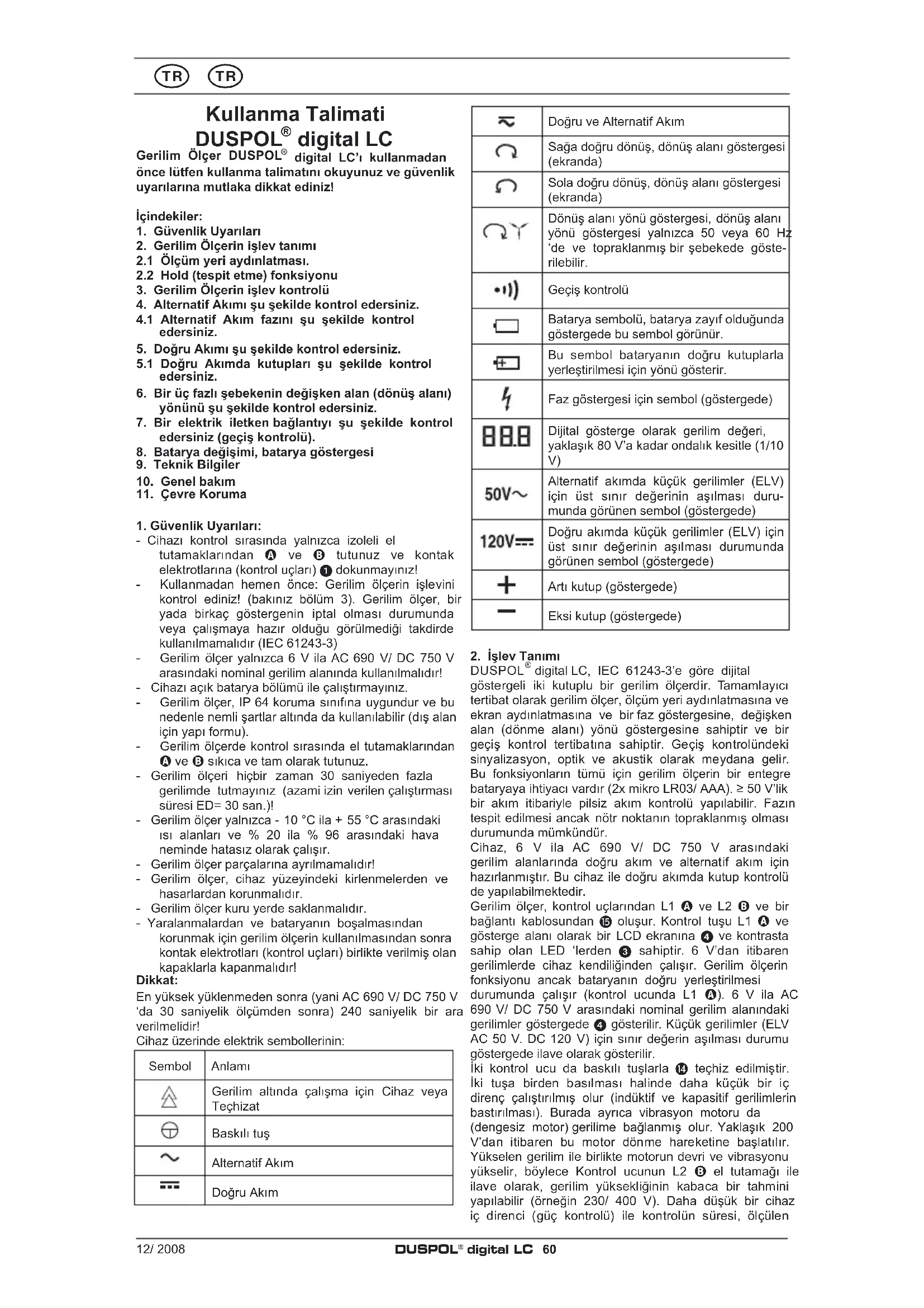 digital LC, IEC 61243-3’e göre dijital göstergeli iki kutuplu bir gerilim ölçerdir. Tamamlayıcı tertibat olarak gerilim ölçer, ölçüm yeri aydınlatmasına ve ekran aydınlatmasına ve bir faz göstergesine, değişken alan (dönme alanı) yönü göstergesine sahiptir ve bir geçiş kontrol tertibatına sahiptir. Geçiş kontrolündeki sinyalizasyon, optik ve akustik olarak meydana gelir. Bu fonksiyonların tümü için gerilim ölçerin bir entegre bataryaya ihtiyacı vardır (2x mikro LR03/ AAA). ≥ 50 V’lik bir akım itibariyle pilsiz akım kontrolü yapılabilir. Fazın tespit edilmesi ancak nötr noktanın topraklanmış olması durumunda mümkündür. Cihaz, 6 V ila AC 690 V/ DC 750 V arasındaki gerilim alanlarında doğru akım ve alternatif akım için hazırlanmıştır. Bu cihaz ile doğru akımda kutup kontrolü de yapılabilmektedir. Gerilim ölçer, kontrol uçlarından L1 A ve L2 B ve bir bağlantı kablosundan oluşur. Kontrol tuşu L1 A ve gösterge alanı olarak bir LCD ekranına 4 ve kontrasta sahip olan LED ‘lerden 3 sahiptir. 6 V’dan itibaren gerilimlerde cihaz kendiliğinden çalışır. Gerilim ölçerin fonksiyonu ancak bataryanın doğru yerleştirilmesi durumunda çalışır (kontrol ucunda L1 A). 6 V ila AC 690 V/ DC 750 V arasındaki nominal gerilim alanındaki gerilimler göstergede 4 gösterilir. Küçük gerilimler (ELV AC 50 V. DC 120 V) için sınır değerin aşılması durumu göstergede ilave olarak gösterilir. İki kontrol ucu da baskılı tuşlarla teçhiz edilmiştir. İki tuşa birden basılması halinde daha küçük bir iç direnç çalıştırılmış olur (indüktif ve kapasitif gerilimlerin bastırılması). Burada ayrıca vibrasyon motoru da (dengesiz motor) gerilime bağlanmış olur. Yaklaşık 200 V’dan itibaren bu motor dönme hareketine başlatılır. Yükselen gerilim ile birlikte motorun devri ve vibrasyonu yükselir, böylece Kontrol ucunun L2 B el tutamağı ile ilave olarak, gerilim yüksekliğinin kabaca bir tahmini yapılabilir (örneğin 230/ 400 V). Daha düşük bir cihaz iç direnci (güç kontrolü) ile kontrolün süresi, ölçülen12/ 2008 DUSPOL