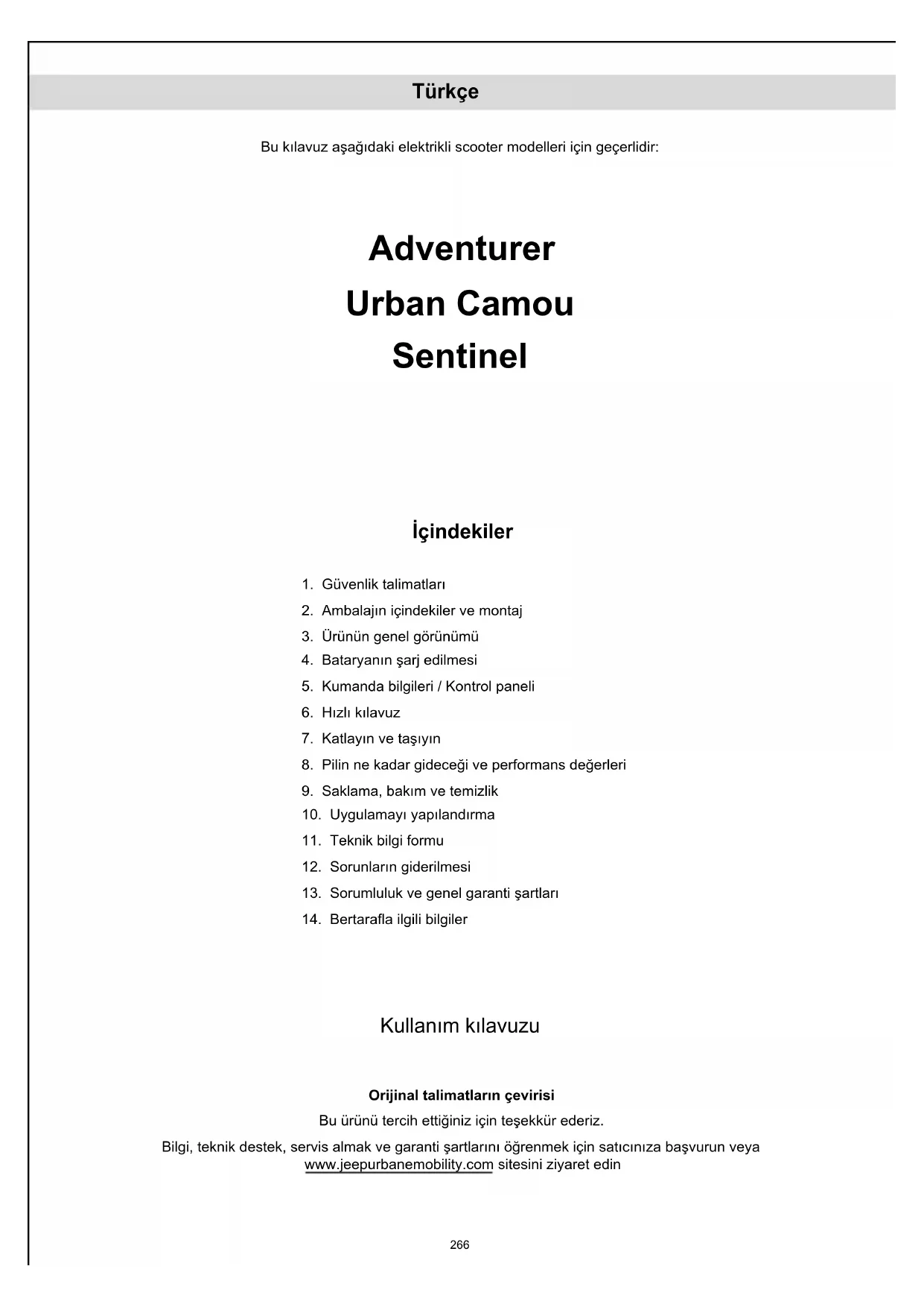 Üretici rma, sürekli gerçekleşen teknik gelişmelerin ışığında ürünlerinde önceden bildirimde bulunmadan ve bu kılavuzu otomatik olarak güncellemeden üründe değişiklik yapma hakkını saklı tutar. Bilgiler ve bu kılavuzun revizyonlarını görmek için www.jeepurbanemobility.com sitesini ziyaret edin Adventurer / Urban Camou Gaz Disk fren Kapatma kancası Dönüş sinyalleri anahtarı Fren kolu Gösterge Kapatma kancası Platform Park ayağı Amortisörlü arka çatal Şasi Emniyet mekanizması Kapatma mekanizması Elektronik fren ve motor Amortisörlü ön çatal274 Sentinel Kapatma kancası Arka çamurluk Dönüş sinyalleri anahtarı Fren kolu Platform Park ayağı Disk fren Arka ışıklar Şarj bağlantı noktası Emniyet mekanizması Kapatma mekanizması Elektronik fren ve motor Gaz Ön ışıklar Kapatma kancası Gösterge Amortisörlü maşa275 DİKKAT İlk kullanımda ürünü %100 oranında şarj edin. Ürünün, batarya şarj cihazının ve şarj bağlantı noktasının kuru olduğundan emin olun. Talimatlar