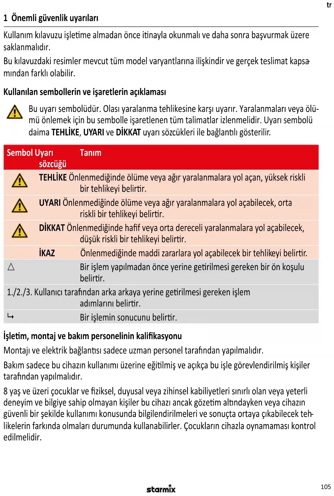 Bir işlemin sonucunu belirr. İşlem, montaj ve bakım personelinin kalikasyonu Montajı ve elektrik bağlansı sadece uzman personel tarandan yapılmalıdır. Bakım sadece bu cihazın kullanımı üzerine eğilmiş ve açıkça bu işle görevlendirilmiş kişiler tarandan yapılmalıdır. 8 yaş ve üzeri çocuklar ve ziksel, duyusal veya zihinsel kabiliyetleri sınırlı olan veya yeterli deneyim ve bilgiye sahip olmayan kişiler bu cihazı ancak gözem alndayken veya cihazın güvenli bir şekilde kullanımı konusunda bilgilendirilmeleri ve sonuçta ortaya çıkabilecek teh