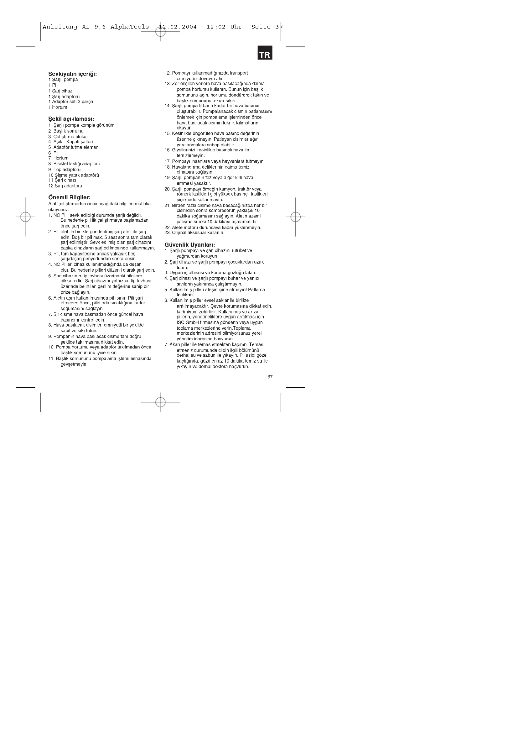 ba©lay∂n. Yeµil LED ve k∂rm∂z∂ LED lambas∂ birlikte yanar, pil µarj edilir. Ωarj süresi pil boµ oldu©unda max. 5 saattir. Ωarj iµlemi esnas∂nda pil biraz ∂s∂nabilir, bu nornaldir. Dikkat! Ωarj iµlemi sona erdikten ve pil µarj edildikten sonra otomatik kapatma gerçekleµmez! Pilin µarj edilmesi mümkün de©ilse aµa©∂daki noktalar∂ kontrol edin: Prizde elektrik olup olmad∂©∂ Ωarj adaptöründeki (Poz. 12) kontaklar∂n pile tam temas edip etmedi©i Pilin µarj edilmesi bu kontrollerden sonra da mümkün de©ilse, Ωarj cihaz∂ ve pili lütfen müµteri hizmetleri bölümümüze gönderin. Pillerin uzun ömürlü olmas∂n∂ sa©lamak için NC pilini zaman∂nda µarj edin. Bu özellikle, µarjl∂ pompan∂n gücünün azalmas∂n∂ fark etti©inizde yap∂lacakt∂r. Pillerin tamamen boµalmas∂n∂ önleyin. Bu durum NC pillerinin ar∂zalanmas∂na yol açacakt∂r! Açma/Kapatma Ωarj edilmiµ pili, aletin sap∂n∂n içine yerine geçinceye kadar bast∂rarak tak∂n. Transport emniyetini (Poz. 3) devreden ç∂kar∂n. Bunun için µalteri sa© pozisyona (kilit aç∂k) getirin. Aleti Aç∂k - Kapal∂ µalteri (Poz. 4) ile çal∂µt∂r∂n. Dikkat! Aç∂k - Kapal∂ µalteri üzerine 60N üzerinde bir kuvvet uygulanmas∂ durumunda da alet transport emniyetine ra©men kendili©inden çal∂µmaya baµlayabilir! Ωiµirme: Dikkat! Alet üzerinde bulunan bas∂nç manometresinin kalibrasyonu yap∂lmam∂µt∂r. Bu nedenle lastik µiµirildikten sonra lasti©in hava bas∂nc∂, kalibrasyonu yap∂lm∂µ bir bas∂nç saati ile kontrol edilecektir. Otomobil lastiklerinin µiµirilmesi Ωarjl∂ pompay∂ direkt olarak veya hortum (Poz. 7) ile lastik ventiline ba©lay∂n. Bisiklet lastiklerinin µiµirilmesi S∂radan ventilli bisiklet lastiklerinin µiµirilmesi için adaptörü (Poz. 8) ventil üzerine tak∂n. Ωarjl∂ pompay∂ adaptör üzerine tak∂n veya hortumu adaptörün üzerine döndürerek tak∂n. Bisiklet lasti©ini µiµirin. Otomobil ventilli bisiklet lastiklerinin µiµirilmesi. Ωarjl∂ pompay∂ direkt olarak veya hortum (Poz. 7) ile lastik ventiline ba©lay∂n. Di©er cisimlerin µiµirilmesi Ωiµirilebilir oyuncak, spor ve plaj ürünlerinin µiµirilmesi için top adaptörü (Poz. 9) veya µiµme yatak adaptörünü (Poz. 10) kullan∂n. Ωiµirilecek eµyan∂n kullan∂m k∂lavuzundaki bilgilere dikkat edin!