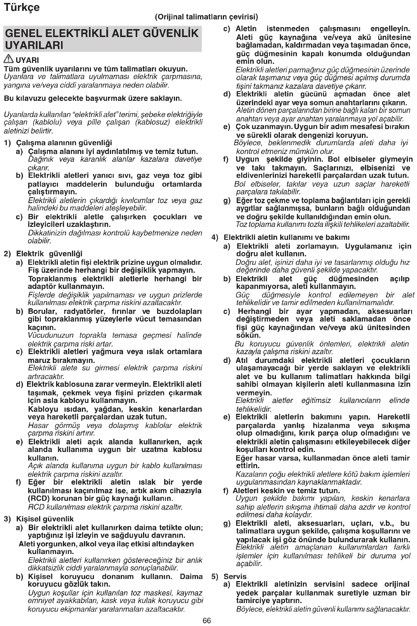 a) Elektrikli aletinizin servisini sadece orijinal yedek parçalar kullanmak suretiyle uzman bir tamirciye yaptırın. Böylece, elektrikli aletin güvenli kullanımı sağlanacaktır. GENEL ELEKTRİKLİ ALET GÜVENLİK UYARILARI UYARI Tüm güvenlik uyarılarını ve tüm talimatları okuyun. Uyarılara ve talimatlara uyulmaması elektrik çarpmasına, yangına ve/veya ciddi yaralanmaya neden olabilir. Bu kılavuzu gelecekte başvurmak üzere saklayın. Uyarılarda kullanılan “elektrikli alet” terimi, şebeke elektriğiyle çalışan (kablolu) veya pille çalışan (kablosuz) elektrikli aletinizi belirtir.