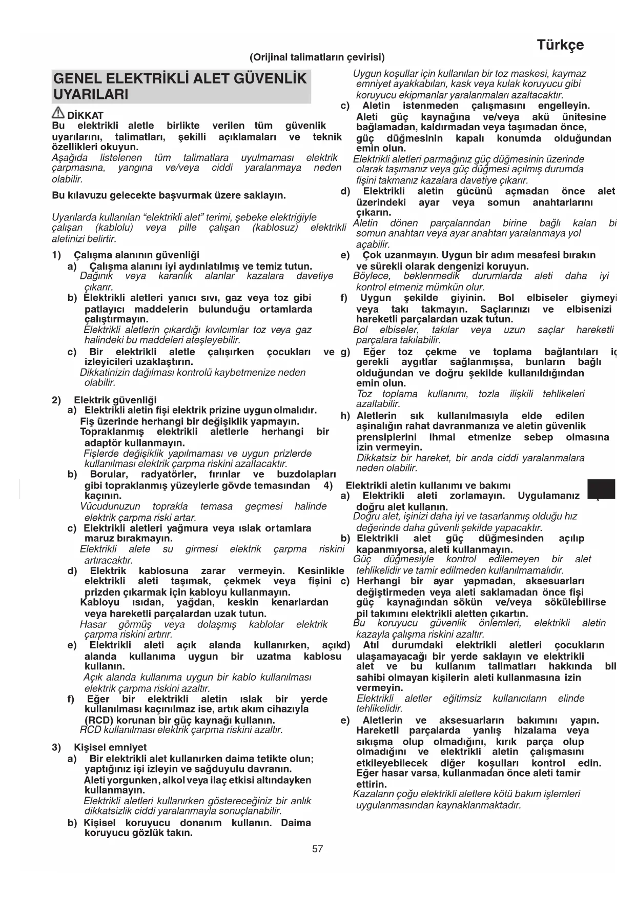 Elektriklialetinşielektrikprizineuygunolmalıdır. Fişüzerindeherhangibirdeğişiklikyapmayın. Topraklanmış elektrikli aletlerle herhangi bir adaptörkullanmayın. Fişlerde değişiklik yapılmaması ve uygun prizlerde kullanılmasıelektrikçarpmariskiniazaltacaktır. b) Borular, radyatörler, fırınlar ve buzdolapları gibitopraklanmışyüzeylerlegövdetemasından kaçının. Vücudunuzun toprakla temasa geçmesi halinde elektrikçarpmariskiartar. c) Elektrikli aletleri yağmura veyaıslak ortamlara maruzbırakmayın. Elektrikli alete su girmesi elektrik çarpma riskini artıracaktır. d) Elektrik kablosuna zarar vermeyin. Kesinlikle elektrikli aleti taşımak, çekmek veya şini prizdençıkarmakiçinkabloyukullanmayın. Kabloyu ısıdan, yağdan, keskin kenarlardan veyahareketliparçalardanuzaktutun. Hasar görmüş veya dolaşmış kablolar elektrik çarpmariskiniartırır. e) Elektrikli aleti açık alanda kullanırken, açık alanda kullanıma uygun bir uzatma kablosu kullanın. Açık alanda kullanıma uygun bir kablo kullanılması elektrikçarpmariskiniazaltır. f) Eğer bir elektrikli aletin ıslak bir yerde kullanılmasıkaçınılmazise,artıkakımcihazıyla (RCD)korunanbirgüçkaynağıkullanın. RCDkullanılmasıelektrikçarpmariskiniazaltır.