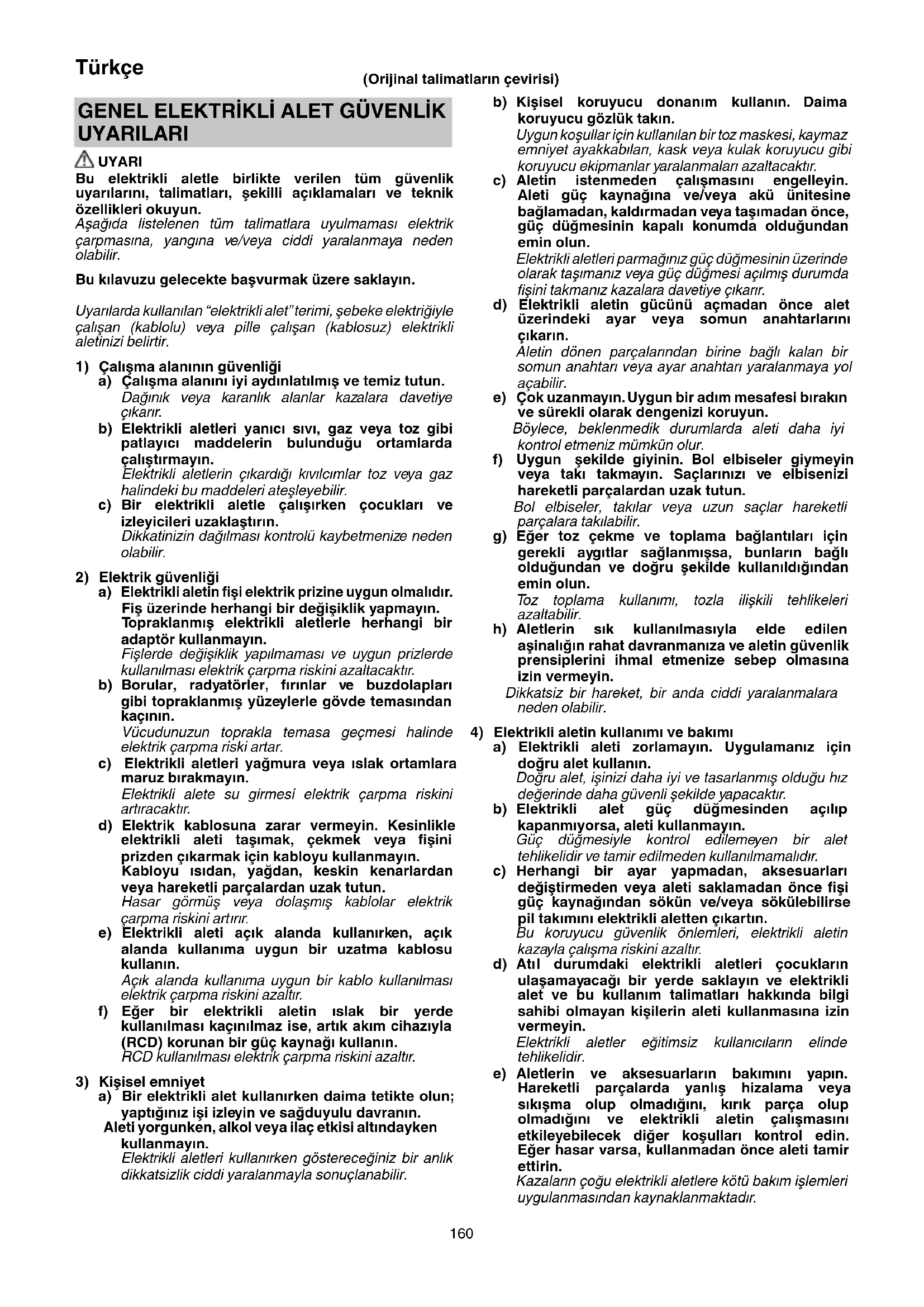 a) Elektrikli aleti zorlamayın. Uygulamanız için doğru alet kullanın. Doğru alet, işinizi daha iyi ve tasarlanmış olduğu hız değerinde daha güvenli şekilde yapacaktır. b) Elektrikli alet güç düğmesinden açılıp kapanmıyorsa, aleti kullanmayın. Güç düğmesiyle kontrol edilemeyen bir alet tehlikelidir ve tamir edilmeden kullanılmamalıdır. c) Herhangi bir ayar yapmadan, aksesuarları değiştirmeden veya aleti saklamadan önce fi şi güç kaynağından sökün ve/veya sökülebilirse pil takımını elektrikli aletten çıkartın. Bu koruyucu güvenlik önlemleri, elektrikli aletin kazayla çalışma riskini azaltır. d) Atı l durumdaki elektrikli aletleri çocukların ulaşamayacağı bir yerde saklayın ve elektrikli alet ve bu kullanım talimatları hakkında bilgi sahibi olmayan kişilerin aleti kullanmasına izin vermeyin. Elektrikli aletler eğitimsiz kullanıcıların elinde tehlikelidir. e) Aletlerin ve aksesuarların bakımını yapın. Hareketli parçalarda yanlış hizalama veya sıkışma olup olmadığını, kırık parça olup olmadığını ve elektrikli aletin çalışmasını etkileyebilecek diğer koşulları kontrol edin. Eğer hasar varsa, kullanmadan önce aleti tamir ettirin. Kazaların çoğu elektrikli aletlere kötü bakım işlemleri uygulanması ndan kaynaklanmaktadır. GENEL ELEKTRİKLİ ALET GÜVENLİK UYARILARI UYARI Bu elektrikli aletle birlikte verilen tüm güvenlik uyarılarını, talimatları, şekilli açıklamaları ve teknik özellikleri okuyun. Aşağıda listelenen tüm talimatlara uyulmaması elektrik çarpmasına, yangına ve/veya ciddi yaralanmaya neden olabilir. Bu kılavuzu gelecekte başvurmak üzere saklayın. Uyarılarda kullanılan “elektrikli alet” terimi, şebeke elektriğiyle çalışan (kablolu) veya pille çalışan (kablosuz) elektrikli aletinizi belirtir.