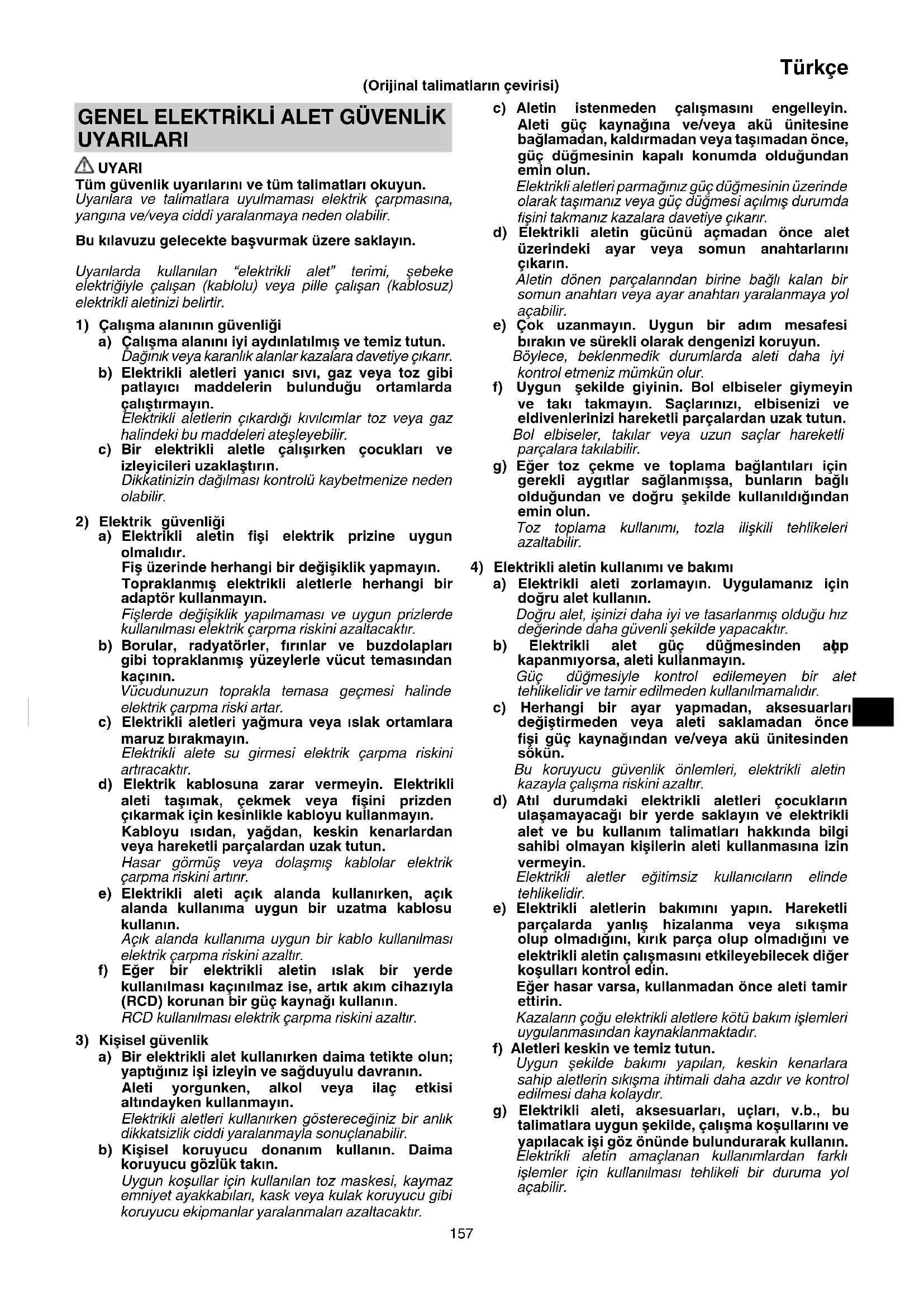 a) Elektrikli aleti zorlamayın. Uygulamanız için doğru alet kullanın. Doğru alet, işinizi daha iyi ve tasarlanmış olduğu hız değerinde daha güvenli şekilde yapacaktır. b) Elektrikli alet güç düğmesinden açı lıp kapanmıyorsa, aleti kullanmayın. Güç düğmesiyle kontrol edilemeyen bir alet tehlikelidir ve tamir edilmeden kullanılmamalıdır. c) Herhangi bir ayar yapmadan, aksesuarları değiştirmeden veya aleti saklamadan önce fi şi güç kaynağından ve/veya akü ünitesinden sökün. Bu koruyucu güvenlik önlemleri, elektrikli aletin kazayla çalışma riskini azaltır. d) Atıl durumdaki elektrikli aletleri çocukların ulaşamayacağı bir yerde saklayın ve elektrikli alet ve bu kullanım talimatları hakkında bilgi sahibi olmayan kişilerin aleti kullanmasına izin vermeyin. Elektrikli aletler eğitimsiz kullanıcıların elinde tehlikelidir. e) Elektrikli aletlerin bakımını yapın. Hareketli parçalarda yanlış hizalanma veya sıkışma olup olmadığını , kırık parça olup olmadığını ve elektrikli aletin çalışmasını etkileyebilecek diğer koşulları kontrol edin. Eğer hasar varsa, kullanmadan önce aleti tamir ettirin. Kazaların çoğu elektrikli aletlere kötü bakım işlemleri uygulanmasından kaynaklanmaktadır. f) Aletleri keskin ve temiz tutun. Uygun şekilde bakımı yapılan, keskin kenarlara sahip aletlerin sıkışma ihtimali daha azdır ve kontrol edilmesi daha kolaydır. g) Elektrikli aleti, aksesuarları, uçları, v.b., bu talimatlara uygun şekilde, çalışma koşullarını ve yapılacak işi göz önünde bulundurarak kullanın. Elektrikli aletin amaçlanan kullanımlardan farklı işlemler için kullanılması tehlikeli bir duruma yol açabilir. GENEL ELEKTRİKLİ ALET GÜVENLİK UYARILARI UYARI Tüm güvenlik uyarılarını ve tüm talimatları okuyun. Uyarılara ve talimatlara uyulmaması elektrik çarpmasına, yangına ve/veya ciddi yaralanmaya neden olabilir. Bu kılavuzu gelecekte başvurmak üzere saklayın. Uyarılarda kullanılan “elektrikli alet” terimi, şebeke elektriğiyle çalışan (kablolu) veya pille çalışan (kablosuz) elektrikli aletinizi belirtir.
