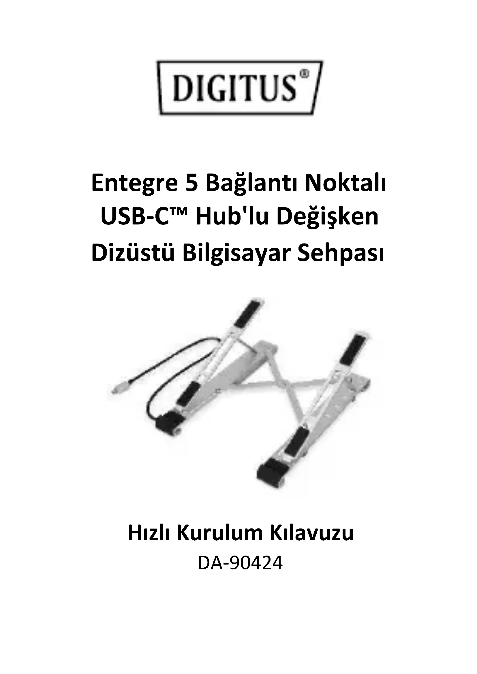 Hızlı Kurulum Kılavuzu DA-904242 Tanıtım DIGITUS®'un ayarlanabilir dizüstü bilgisayar sehpası, ergonomik tasarımı ve bağlantıyı tek bir kullanışlı ünitede birleştirir. Eğim açısını boyunuza göre 5 seviyede kolayca ayarlayabilirsiniz. Dizüstü bilgisayarınız USB-C™ bağlantı noktası üzerinden bağlanarak, hub'ın tüm USB arayüzlerine erişmenizi sağlar. 4 adet tamamen işlevsel USB A bağlantı noktası (USB 3.2 Gen1) ve Güç Beslemeli bir USB-C™ gücü mevcuttur. İsteğe bağlı bir USB-C™ güç adaptörü, örneğin, bağlı bir dizüstü bilgisayar ve USB-A bağlantı noktaları (85 W/ 15 W) için 100 W'a kadar şarj gücü (Güç Beslemesi) sunar. DIGITUS® dizüstü bilgisayar sehpası ve entegre USB hub ile ergonomik tasarım ve bağlantının avantajlarını tek bir ünitede kullanın.3 Özellikler