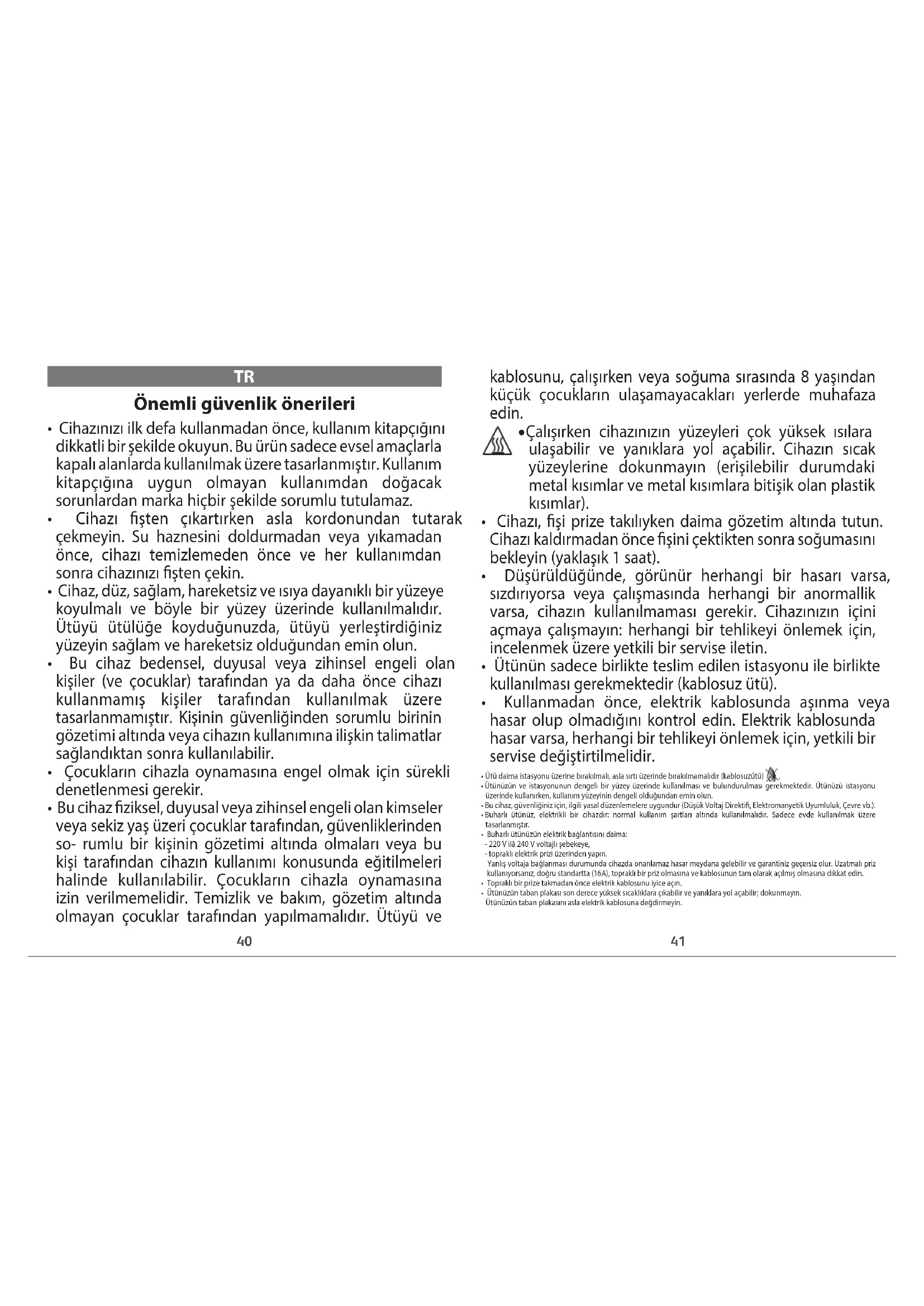 - Bu cihaz ziksel, duyusal veya zihinsel engeli olan kimseler veya sekiz yaş üzeri çocuklar tarafından, güvenliklerinden so- rumlu bir kişinin gözetimi altında olmaları veya bu kişi tarafından cihazın kullanımı konusunda eğitilmeleri halinde kullanılabilir. Çocukların cihazla oynamasına izin verilmemelidir. Temizlik ve bakım, gözetim altında olmayan çocuklar tarafından yapılmamalıdır. Ütüyü ve