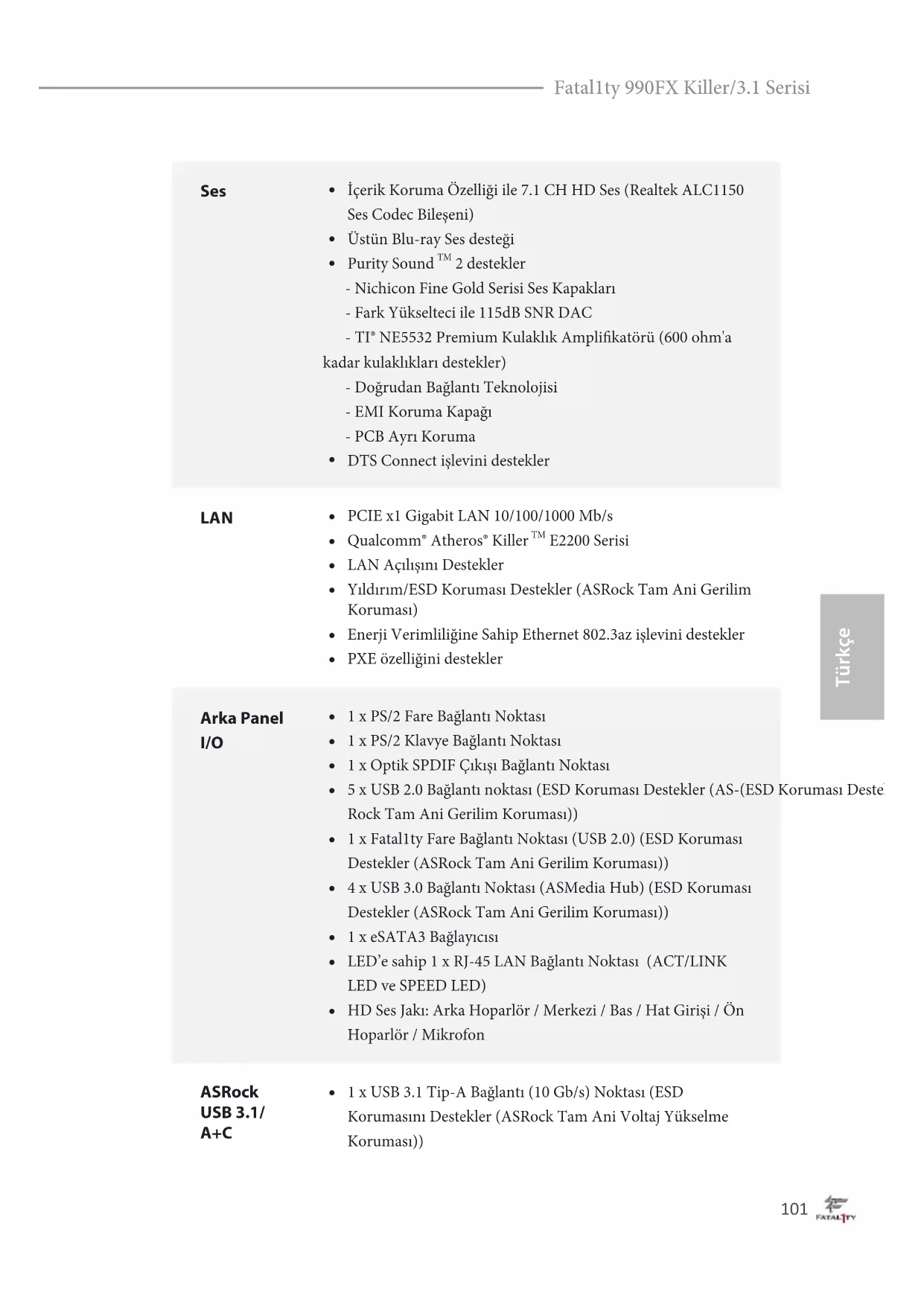 birimlerini destekler101 Türkçe Fatal1ty 990FX Killer/3.1 Serisi Ses
