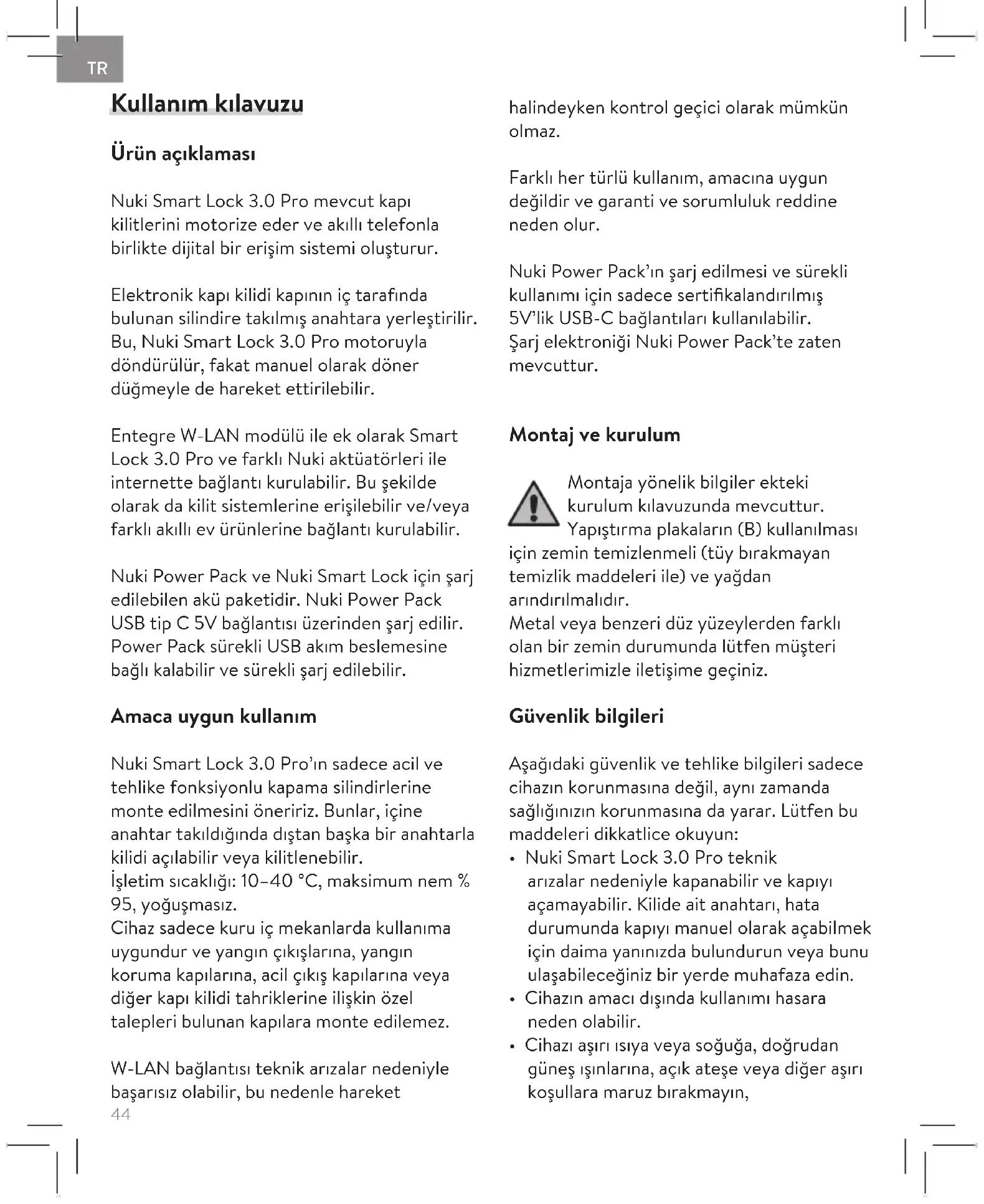- естественные признаки износа. Более подробная информация приведена на сайте: nuki.io/warranty Применяемое право Данная гарантия подчиняется праву Австрийской Республики. Юрисдикция: Грац, Австрия. Контактные данные Электронная почта: service@nuki.io Дополнительную информацию о способах контакта с Nuki Support можно найти на сайте: nuki.io/help Сохраните данные рекомендации и инструкцию по эксплуатации для дальнейшего использования! Настоящим компания Nuki Home Solutions GmbH заявляет, что тип радиооборудования Nuki Smart Lock 3.0 Pro (011.318) соответствует требованиям Директивы 2014/53/ЕС. Полный текст декларации о соответствии требованиям ЕС доступен по следующей ссылке: nuki.io/legal RU44 Kullanım kılavuzu Ürün açıklaması Nuki Smart Lock 3.0 Pro mevcut kapı kilitlerini motorize eder ve akıllı telefonla birlikte dijital bir erişim sistemi oluşturur. Elektronik kapı kilidi kapının iç tarafında bulunan silindire takılmış anahtara yerleştirilir. Bu, Nuki Smart Lock 3.0 Pro motoruyla döndürülür, fakat manuel olarak döner düğmeyle de hareket ettirilebilir. Entegre W-LAN modülü ile ek olarak Smart Lock 3.0 Pro ve farklı Nuki aktüatörleri ile internette bağlantı kurulabilir. Bu şekilde olarak da kilit sistemlerine erişilebilir ve/veya farklı akıllı ev ürünlerine bağlantı kurulabilir. Nuki Power Pack ve Nuki Smart Lock için şarj edilebilen akü paketidir. Nuki Power Pack USB tip C 5V bağlantısı üzerinden şarj edilir. Power Pack sürekli USB akım beslemesine bağlı kalabilir ve sürekli şarj edilebilir. Amaca uygun kullanım Nuki Smart Lock 3.0 Pro’ın sadece acil ve tehlike fonksiyonlu kapama silindirlerine monte edilmesini öneririz. Bunlar, içine anahtar takıldığında dıştan başka bir anahtarla kilidi açılabilir veya kilitlenebilir. İşletim sıcaklığı: 10–40 °C, maksimum nem % 95, yoğuşmasız. Cihaz sadece kuru iç mekanlarda kullanıma uygundur ve yangın çıkışlarına, yangın koruma kapılarına, acil çıkış kapılarına veya diğer kapı kilidi tahriklerine ilişkin özel talepleri bulunan kapılara monte edilemez. W-LAN bağlantısı teknik arızalar nedeniyle başarısız olabilir, bu nedenle hareket halindeyken kontrol geçici olarak mümkün olmaz. Farklı her türlü kullanım, amacına uygun değildir ve garanti ve sorumluluk reddine neden olur. Nuki Power Pack’ın şarj edilmesi ve sürekli kullanımı için sadece sertifikalandırılmış 5V’lik USB-C bağlantıları kullanılabilir. Şarj elektroniği Nuki Power Pack’te zaten mevcuttur. Montaj ve kurulum Montaja yönelik bilgiler ekteki kurulum kılavuzunda mevcuttur. Yapıştırma plakaların (B) kullanılması için zemin temizlenmeli (tüy bırakmayan temizlik maddeleri ile) ve yağdan arındırılmalıdır. Metal veya benzeri düz yüzeylerden farklı olan bir zemin durumunda lütfen müşteri hizmetlerimizle iletişime geçiniz. Güvenlik bilgileri Aşağıdaki güvenlik ve tehlike bilgileri sadece cihazın korunmasına değil, aynı zamanda sağlığınızın korunmasına da yarar. Lütfen bu maddeleri dikkatlice okuyun: