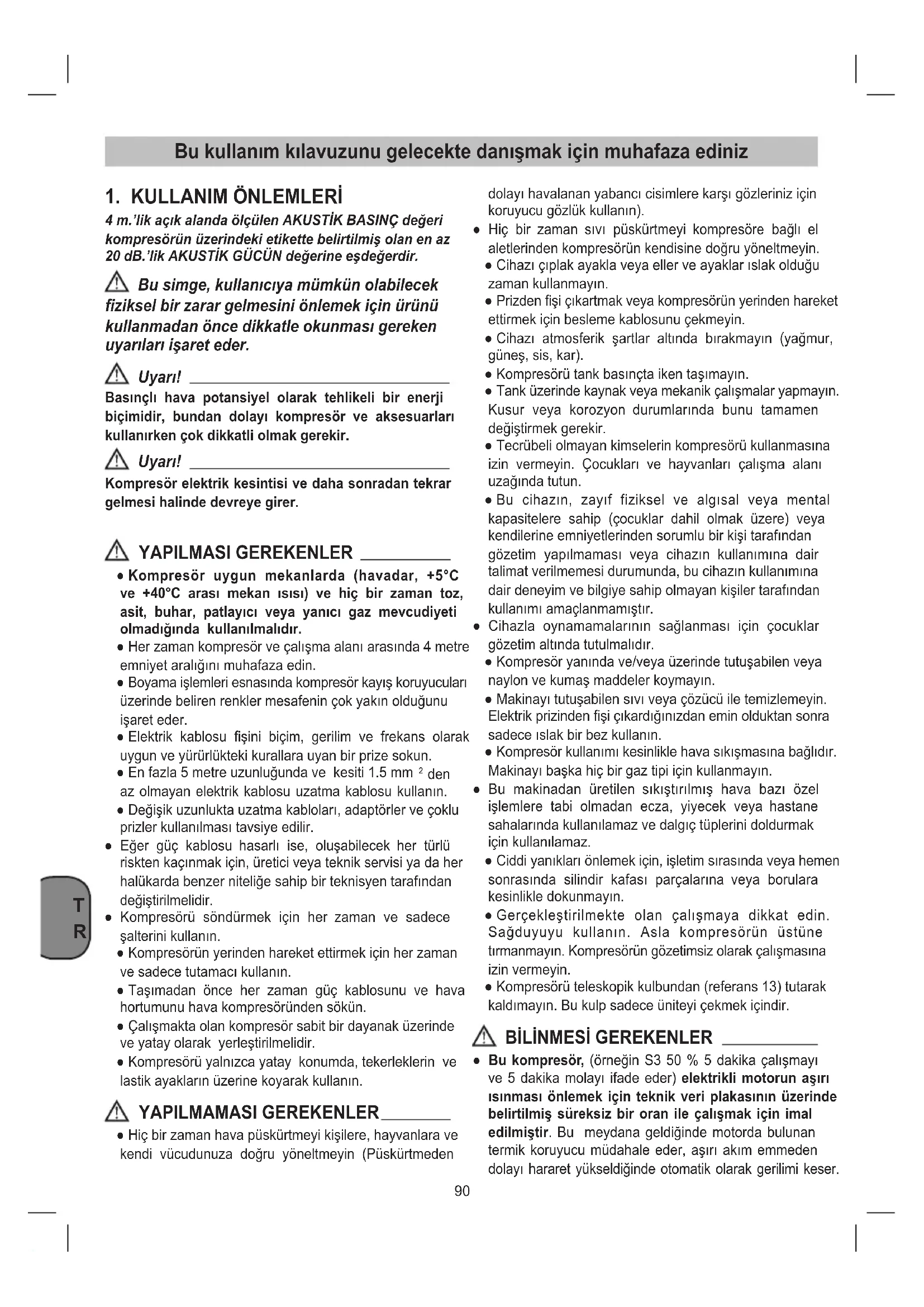 4 m.’lik açık alanda ölçülen AKUSTİK BASINÇ değeri kompresörün üzerindeki etikette belirtilmiş olan en az 20 dB.’lik AKUSTİK GÜCÜN değerine eşdeğerdir. Bu simge, kullanıcıya mümkün olabilecek ziksel bir zarar gelmesini önlemek için ürünü kullanmadan önce dikkatle okunması gereken uyarıları işaret eder. Uyarı! Basınçlı hava potansiyel olarak tehlikeli bir enerji biçimidir, bundan dolayı kompresör ve aksesuarları kullanırken çok dikkatli olmak gerekir. Uyarı! Kompresör elektrik kesintisi ve daha sonradan tekrar gelmesi halinde devreye girer. YAPILMASI GEREKENLER ● Kompresör uygun mekanlarda (havadar, +5°C ve +40°C arası mekan ısısı) ve hiç bir zaman toz, asit, buhar, patlayıcı veya yanıcı gaz mevcudiyeti olmadığında kullanılmalıdır. ● Her zaman kompresör ve çalışma alanı arasında 4 metre emniyet aralığını muhafaza edin. ● Boyama işlemleri esnasında kompresör kayış koruyucuları üzerinde beliren renkler mesafenin çok yakın olduğunu işaret eder. ● Elektrik kablosu şini biçim, gerilim ve frekans olarak uygun ve yürürlükteki kurallara uyan bir prize sokun. ● En fazla 5 metre uzunluğunda ve kesiti 1.5 mm