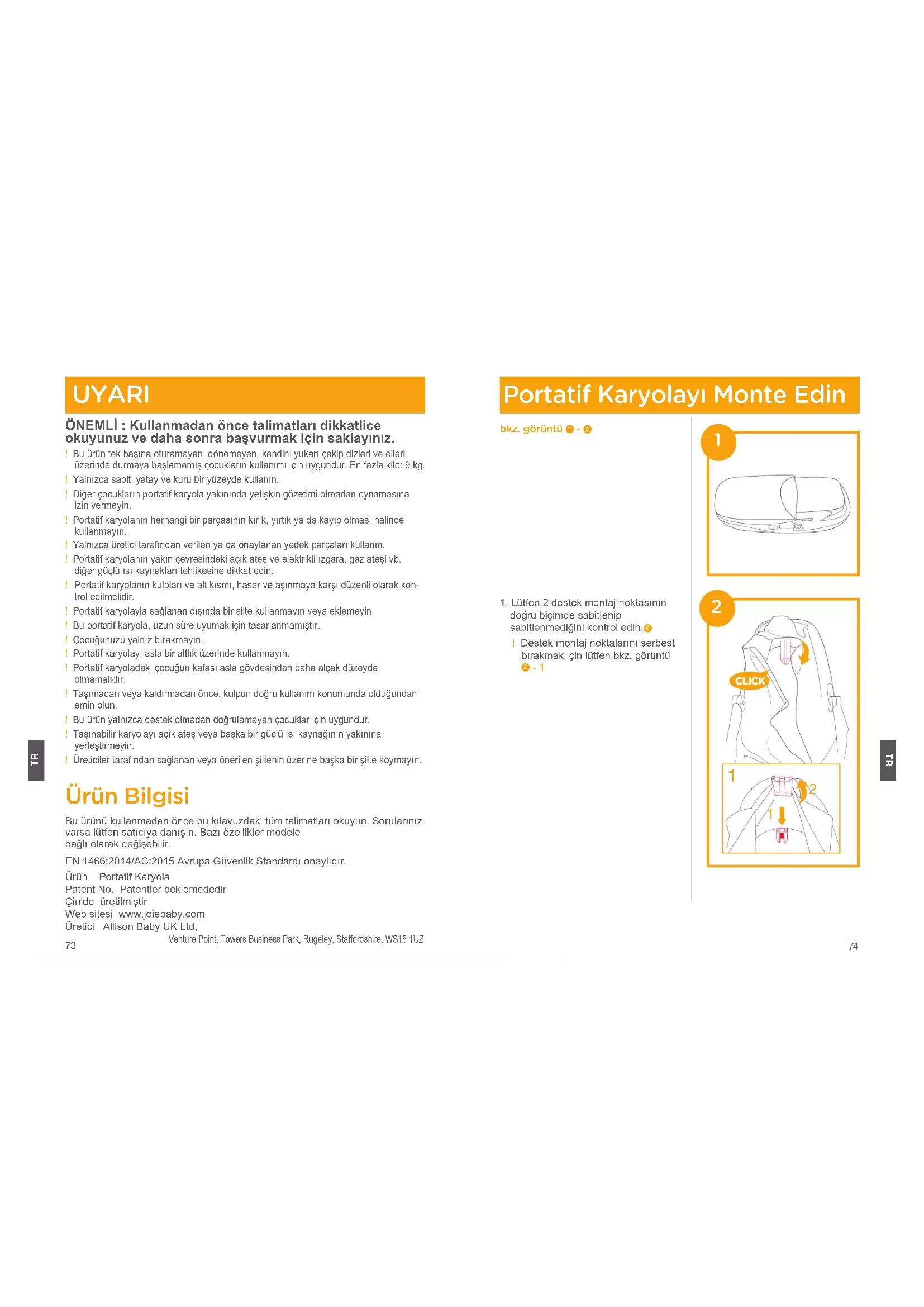 UYARI ÖNEMLİ : Kullanmadan önce talimatları dikkatlice okuyunuz ve daha sonra başvurmak için saklayınız.! Bu ürün tek başına oturamayan, dönemeyen, kendini yukarı çekip dizleri ve elleri üzerinde durmaya başlamamış çocukların kullanımı için uygundur. En fazla kilo: 9 kg.! Yalnızca sabit, yatay ve kuru bir yüzeyde kullanın.! Diğer çocukların portatif karyola yakınında yetişkin gözetimi olmadan oynamasına izin vermeyin.! Portatif karyolanın herhangi bir parçasının kırık, yırtık ya da kayıp olması halinde kullanmayın.! Yalnızca üretici tarafından verilen ya da onaylanan yedek parçaları kullanın.! Portatif karyolanın yakın çevresindeki açık ateş ve elektrikli ızgara, gaz ateşi vb. diğer güçlü ısı kaynakları tehlikesine dikkat edin. ! Portatif karyolanın kulpları ve alt kısmı, hasar ve aşınmaya karşı düzenli olarak kon- trol edilmelidir.! Portatif karyolayla sağlanan dışında bir şilte kullanmayın veya eklemeyin.! Bu portatif karyola, uzun süre uyumak için tasarlanmamıştır.! Çocuğunuzu yalnız bırakmayın.! Portatif karyolayı asla bir altlık üzerinde kullanmayın.! Portatif karyoladaki çocuğun kafası asla gövdesinden daha alçak düzeyde olmamalıdır.! Taşımadan veya kaldırmadan önce, kulpun doğru kullanım konumunda olduğundan emin olun.! Bu ürün yalnızca destek olmadan doğrulamayan çocuklar için uygundur.! Taşınabilir karyolayı açık ateş veya başka bir güçlü ısı kaynağının yakınına yerleştirmeyin.! Üreticiler tarafından sağlanan veya önerilen şiltenin üzerine başka bir şilte koymayın. Ürün Bilgisi Bu ürünü kullanmadan önce bu kılavuzdaki tüm talimatları okuyun. Sorularınız varsa lütfen satıcıya danışın. Bazı özellikler modelebağlı olarak değişebilir.EN 1466:2014/AC:2015 Avrupa Güvenlik Standardı onaylıdır. Ürün Portatif KaryolaPatent No. Patentler beklemededirÇin'de üretilmiştirWeb sitesi www.joiebaby.comÜretici Allison Baby UK Ltd, Venture Point, Towers Business Park, Rugeley, Staffordshire, WS15 1UZ Portatif Karyolayı Monte Edin bkz. görüntü