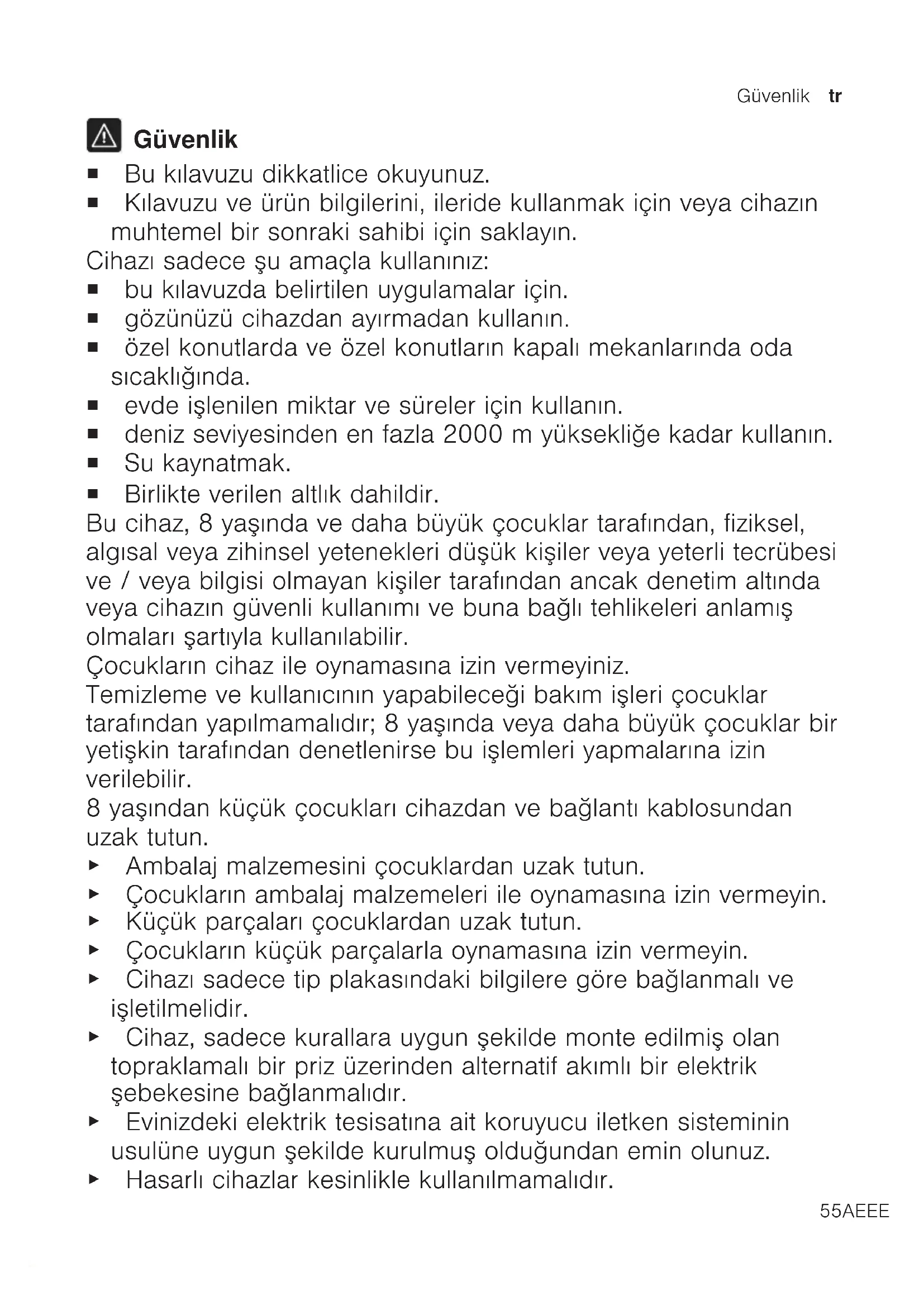 Λεπτομερείς πληροφορίες για τον χρόνο εγ- γύησης και τους όρους εγγύησης στη χώρα σας θα λάβετε από την υπηρεσία εξυπη- ρέτησης πελατών της εταιρείας μας, τον έμπορά σας ή την ιστοσελίδα μας. Τα στοιχεία επικοινωνίας της υπηρεσίας εξυ- πηρέτησης πελατών θα τα βρείτε στον συ- νημμένο κατάλογο της υπηρεσίας εξυπη- ρέτησης πελατών ή στην ιστοσελίδα μας.Güvenlik tr 55AEEE Yönetmeliǧine Uygundur. PCB içermez. Güvenlik ¡ Bu kılavuzu dikkatlice okuyunuz. ¡ Kılavuzu ve ürün bilgilerini, ileride kullanmak için veya cihazın muhtemel bir sonraki sahibi için saklayın. Cihazı sadece şu amaçla kullanınız: ¡ bu kılavuzda belirtilen uygulamalar için. ¡ gözünüzü cihazdan ayırmadan kullanın. ¡ özel konutlarda ve özel konutların kapalı mekanlarında oda sıcaklığında. ¡ evde işlenilen miktar ve süreler için kullanın. ¡ deniz seviyesinden en fazla 2000m yüksekliğe kadar kullanın. ¡ Su kaynatmak. ¡ Birlikte verilen altlık dahildir. Bu cihaz, 8 yaşında ve daha büyük çocuklar tarafından, fiziksel, algısal veya zihinsel yetenekleri düşük kişiler veya yeterli tecrübesi ve / veya bilgisi olmayan kişiler tarafından ancak denetim altında veya cihazın güvenli kullanımı ve buna bağlı tehlikeleri anlamış olmaları şartıyla kullanılabilir. Çocukların cihaz ile oynamasına izin vermeyiniz. Temizleme ve kullanıcının yapabileceği bakım işleri çocuklar tarafından yapılmamalıdır; 8 yaşında veya daha büyük çocuklar bir yetişkin tarafından denetlenirse bu işlemleri yapmalarına izin verilebilir. 8 yaşından küçük çocukları cihazdan ve bağlantı kablosundan uzak tutun. ▶ Ambalaj malzemesini çocuklardan uzak tutun. ▶ Çocukların ambalaj malzemeleri ile oynamasına izin vermeyin. ▶ Küçük parçaları çocuklardan uzak tutun. ▶ Çocukların küçük parçalarla oynamasına izin vermeyin. ▶ Cihazı sadece tip plakasındaki bilgilere göre bağlanmalı ve işletilmelidir. ▶ Cihaz, sadece kurallara uygun şekilde monte edilmiş olan topraklamalı bir priz üzerinden alternatif akımlı bir elektrik şebekesine bağlanmalıdır. ▶ Evinizdeki elektrik tesisatına ait koruyucu iletken sisteminin usulüne uygun şekilde kurulmuş olduğundan emin olunuz. ▶ Hasarlı cihazlar kesinlikle kullanılmamalıdır.tr Maddi hasarların önlenmesi