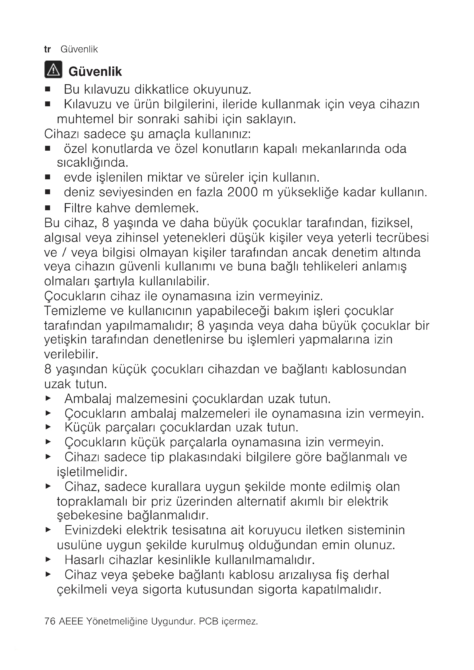 Λεπτομερείς πληροφορίες για τον χρόνο εγ- γύησης και τους όρους εγγύησης στη χώρα σας θα λάβετε από την υπηρεσία εξυπη- ρέτησης πελατών της εταιρείας μας, τον έμπορά σας ή την ιστοσελίδα μας. Τα στοιχεία επικοινωνίας της υπηρεσίας εξυ- πηρέτησης πελατών θα τα βρείτε στον συ- νημμένο κατάλογο της υπηρεσίας εξυπη- ρέτησης πελατών ή στην ιστοσελίδα μας.tr Güvenlik 76 AEEE Yönetmeliǧine Uygundur. PCB içermez. Güvenlik ¡ Bu kılavuzu dikkatlice okuyunuz. ¡ Kılavuzu ve ürün bilgilerini, ileride kullanmak için veya cihazın muhtemel bir sonraki sahibi için saklayın. Cihazı sadece şu amaçla kullanınız: ¡ özel konutlarda ve özel konutların kapalı mekanlarında oda sıcaklığında. ¡ evde işlenilen miktar ve süreler için kullanın. ¡ deniz seviyesinden en fazla 2000m yüksekliğe kadar kullanın. ¡ Filtre kahve demlemek. Bu cihaz, 8 yaşında ve daha büyük çocuklar tarafından, fiziksel, algısal veya zihinsel yetenekleri düşük kişiler veya yeterli tecrübesi ve / veya bilgisi olmayan kişiler tarafından ancak denetim altında veya cihazın güvenli kullanımı ve buna bağlı tehlikeleri anlamış olmaları şartıyla kullanılabilir. Çocukların cihaz ile oynamasına izin vermeyiniz. Temizleme ve kullanıcının yapabileceği bakım işleri çocuklar tarafından yapılmamalıdır; 8 yaşında veya daha büyük çocuklar bir yetişkin tarafından denetlenirse bu işlemleri yapmalarına izin verilebilir. 8 yaşından küçük çocukları cihazdan ve bağlantı kablosundan uzak tutun. ▶ Ambalaj malzemesini çocuklardan uzak tutun. ▶ Çocukların ambalaj malzemeleri ile oynamasına izin vermeyin. ▶ Küçük parçaları çocuklardan uzak tutun. ▶ Çocukların küçük parçalarla oynamasına izin vermeyin. ▶ Cihazı sadece tip plakasındaki bilgilere göre bağlanmalı ve işletilmelidir. ▶ Cihaz, sadece kurallara uygun şekilde monte edilmiş olan topraklamalı bir priz üzerinden alternatif akımlı bir elektrik şebekesine bağlanmalıdır. ▶ Evinizdeki elektrik tesisatına ait koruyucu iletken sisteminin usulüne uygun şekilde kurulmuş olduğundan emin olunuz. ▶ Hasarlı cihazlar kesinlikle kullanılmamalıdır. ▶ Cihaz veya şebeke bağlantı kablosu arızalıysa fiş derhal çekilmeli veya sigorta kutusundan sigorta kapatılmalıdır.Maddi hasarların önlenmesi tr