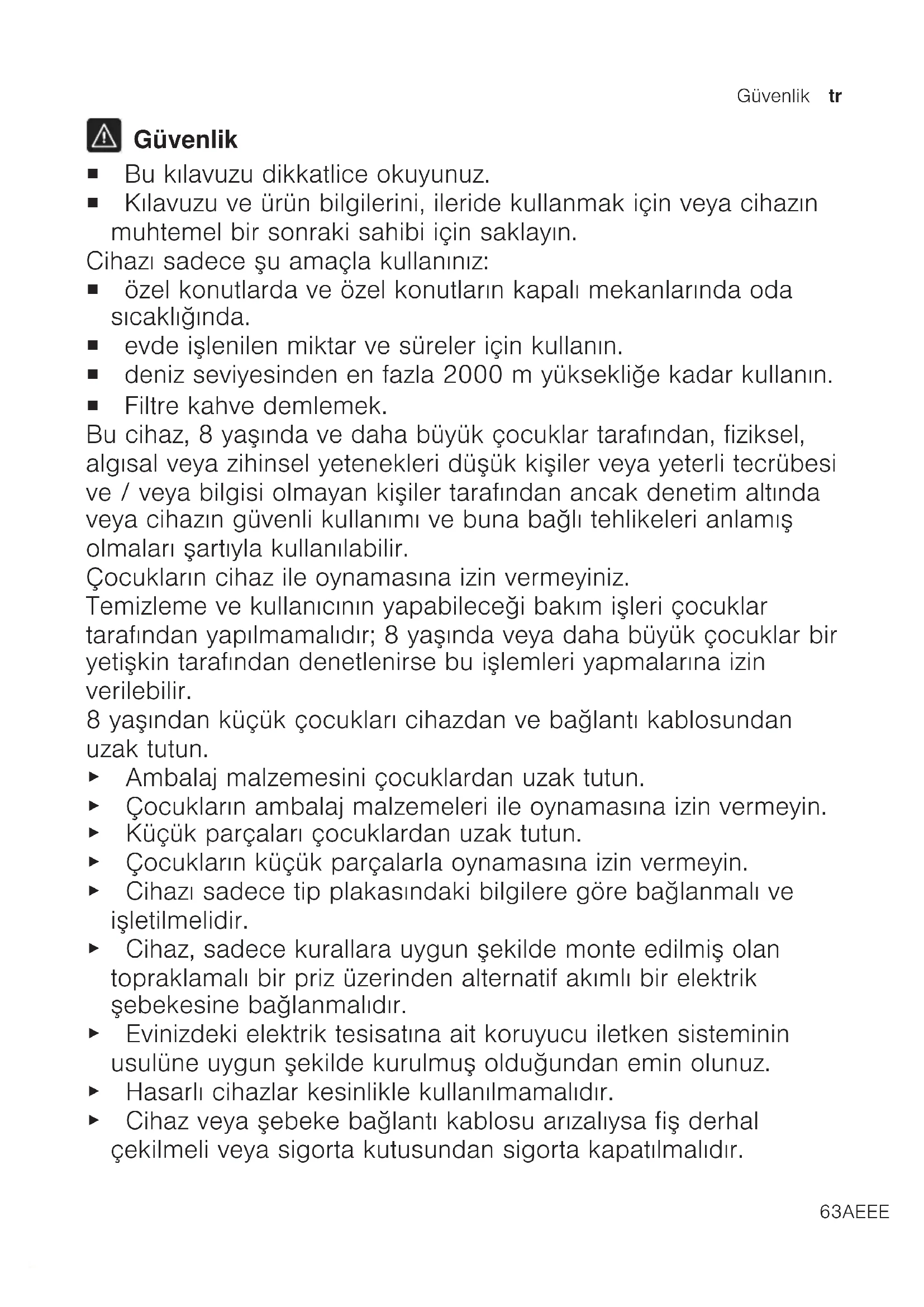 Λεπτομερείς πληροφορίες για τον χρόνο εγ- γύησης και τους όρους εγγύησης στη χώρα σας θα λάβετε από την υπηρεσία εξυπη- ρέτησης πελατών της εταιρείας μας, τον έμπορά σας ή την ιστοσελίδα μας. Τα στοιχεία επικοινωνίας της υπηρεσίας εξυ- πηρέτησης πελατών θα τα βρείτε στον συ- νημμένο κατάλογο της υπηρεσίας εξυπη- ρέτησης πελατών ή στην ιστοσελίδα μας.Güvenlik tr 63AEEE Yönetmeliǧine Uygundur. PCB içermez. Güvenlik ¡ Bu kılavuzu dikkatlice okuyunuz. ¡ Kılavuzu ve ürün bilgilerini, ileride kullanmak için veya cihazın muhtemel bir sonraki sahibi için saklayın. Cihazı sadece şu amaçla kullanınız: ¡ özel konutlarda ve özel konutların kapalı mekanlarında oda sıcaklığında. ¡ evde işlenilen miktar ve süreler için kullanın. ¡ deniz seviyesinden en fazla 2000m yüksekliğe kadar kullanın. ¡ Filtre kahve demlemek. Bu cihaz, 8 yaşında ve daha büyük çocuklar tarafından, fiziksel, algısal veya zihinsel yetenekleri düşük kişiler veya yeterli tecrübesi ve / veya bilgisi olmayan kişiler tarafından ancak denetim altında veya cihazın güvenli kullanımı ve buna bağlı tehlikeleri anlamış olmaları şartıyla kullanılabilir. Çocukların cihaz ile oynamasına izin vermeyiniz. Temizleme ve kullanıcının yapabileceği bakım işleri çocuklar tarafından yapılmamalıdır; 8 yaşında veya daha büyük çocuklar bir yetişkin tarafından denetlenirse bu işlemleri yapmalarına izin verilebilir. 8 yaşından küçük çocukları cihazdan ve bağlantı kablosundan uzak tutun. ▶ Ambalaj malzemesini çocuklardan uzak tutun. ▶ Çocukların ambalaj malzemeleri ile oynamasına izin vermeyin. ▶ Küçük parçaları çocuklardan uzak tutun. ▶ Çocukların küçük parçalarla oynamasına izin vermeyin. ▶ Cihazı sadece tip plakasındaki bilgilere göre bağlanmalı ve işletilmelidir. ▶ Cihaz, sadece kurallara uygun şekilde monte edilmiş olan topraklamalı bir priz üzerinden alternatif akımlı bir elektrik şebekesine bağlanmalıdır. ▶ Evinizdeki elektrik tesisatına ait koruyucu iletken sisteminin usulüne uygun şekilde kurulmuş olduğundan emin olunuz. ▶ Hasarlı cihazlar kesinlikle kullanılmamalıdır. ▶ Cihaz veya şebeke bağlantı kablosu arızalıysa fiş derhal çekilmeli veya sigorta kutusundan sigorta kapatılmalıdır.tr Maddi hasarların önlenmesi