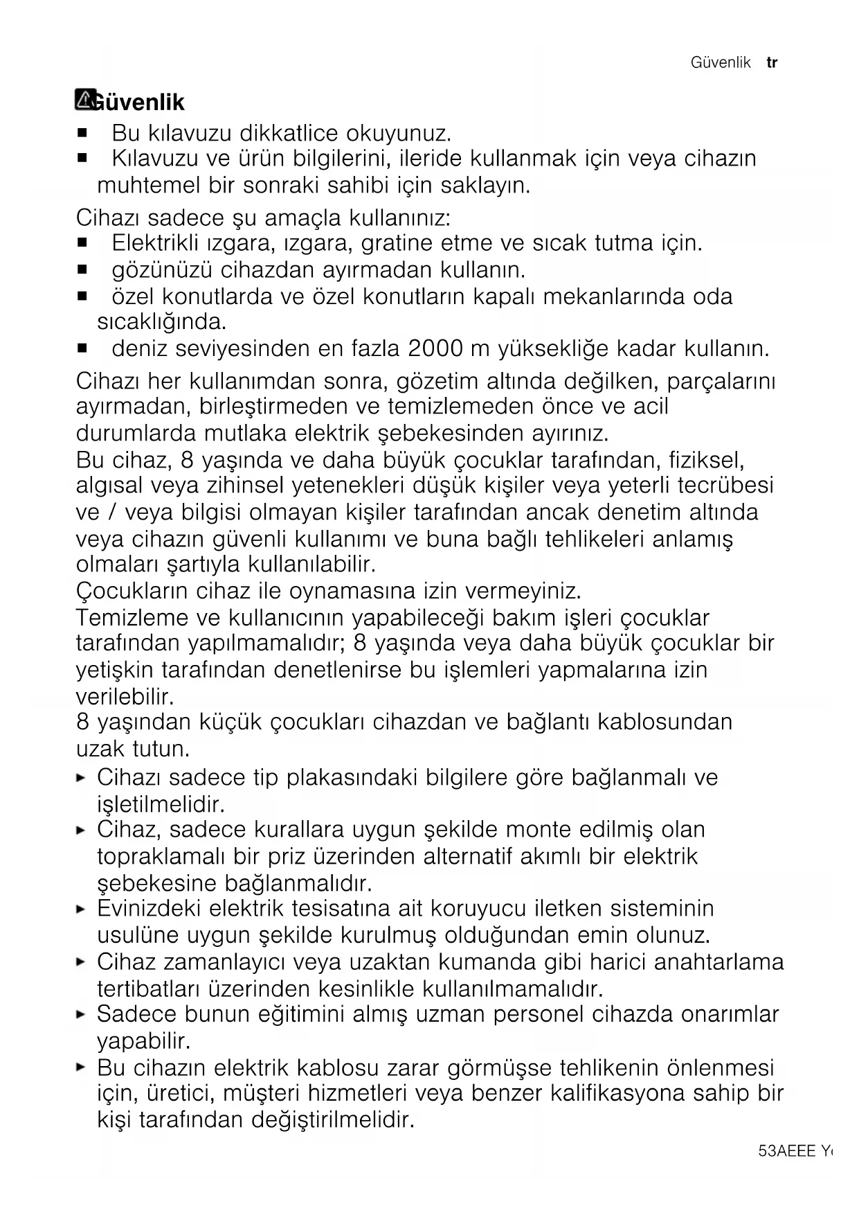Εκτυπωμένο σε 100 % ανακυκλωμένο χαρτί 52 Εκτυπωμένο σε 100 % ανακυκλωμένο χαρτίGüvenlik tr Güvenlik Güvenlik ¡ Bu kılavuzu dikkatlice okuyunuz. ¡ Kılavuzu ve ürün bilgilerini, ileride kullanmak için veya cihazın muhtemel bir sonraki sahibi için saklayın. Cihazı sadece şu amaçla kullanınız: ¡ Elektrikli ızgara, ızgara, gratine etme ve sıcak tutma için. ¡ gözünüzü cihazdan ayırmadan kullanın. ¡ özel konutlarda ve özel konutların kapalı mekanlarında oda sıcaklığında. ¡ deniz seviyesinden en fazla 2000m yüksekliğe kadar kullanın. Cihazı her kullanımdan sonra, gözetim altında değilken, parçalarını ayırmadan, birleştirmeden ve temizlemeden önce ve acil durumlarda mutlaka elektrik şebekesinden ayırınız. Bu cihaz, 8 yaşında ve daha büyük çocuklar tarafından, fiziksel, algısal veya zihinsel yetenekleri düşük kişiler veya yeterli tecrübesi ve / veya bilgisi olmayan kişiler tarafından ancak denetim altında veya cihazın güvenli kullanımı ve buna bağlı tehlikeleri anlamış olmaları şartıyla kullanılabilir. Çocukların cihaz ile oynamasına izin vermeyiniz. Temizleme ve kullanıcının yapabileceği bakım işleri çocuklar tarafından yapılmamalıdır; 8 yaşında veya daha büyük çocuklar bir yetişkin tarafından denetlenirse bu işlemleri yapmalarına izin verilebilir. 8 yaşından küçük çocukları cihazdan ve bağlantı kablosundan uzak tutun. Cihazı sadece tip plakasındaki bilgilere göre bağlanmalı ve işletilmelidir. Cihaz, sadece kurallara uygun şekilde monte edilmiş olan topraklamalı bir priz üzerinden alternatif akımlı bir elektrik şebekesine bağlanmalıdır. Evinizdeki elektrik tesisatına ait koruyucu iletken sisteminin usulüne uygun şekilde kurulmuş olduğundan emin olunuz. Cihaz zamanlayıcı veya uzaktan kumanda gibi harici anahtarlama tertibatları üzerinden kesinlikle kullanılmamalıdır. Sadece bunun eğitimini almış uzman personel cihazda onarımlar yapabilir. Bu cihazın elektrik kablosu zarar görmüşse tehlikenin önlenmesi için, üretici, müşteri hizmetleri veya benzer kalifikasyona sahip bir kişi tarafından değiştirilmelidir. 53AEEE Yönetmeliǧine Uygundur. PCB içermez.tr Maddi hasarların önlenmesi Cihazı veya elektrik kablosunu kesinlikle suya sokmayın veya bulaşık makinesine koymayın. Cihazı temizlemek için buharlı temizleyiciler veya yüksek basınçlı temizleyiciler kullanmayın. Şebeke bağlantı kablosunu asla sıcak parçalara temas ettirmeyiniz veya keskin kenarlar üzerinden çekmeyiniz. Cihaz çalışma sırasında ısınır. Sıcak yüzeylere asla dokunmayın. Çalışma sırasında yalnızca kumanda elemanlarına veya tutma sapına dokunun. Temizlemeden veya taşımadan önce cihazın soğumasını bekleyiniz. Yaralanmaları önlemek için cihazı sadece amacına uygun olarak kullanın. Ambalaj malzemesini çocuklardan uzak tutun. Çocukların ambalaj malzemeleri ile oynamasına izin vermeyin. Küçük parçaları çocuklardan uzak tutun. Çocukların küçük parçalarla oynamasına izin vermeyin. Maddi hasarların önlenmesiMaddi hasarların önlenmesi Izgarayı asla ızgara tavası yerleştirilmeden devreye almayın. Izgara tavası üzerinde keskin, sivri uçlu veya metal çatal takımı bıçak kullanmayın. Plastik veya ahşap çatal bıçak takımı kullanın. Yağ damlama tepsilerini her zaman yağ drenajlarının altına yerleştirin. Seramik kaplamanın zarar görmesini önlemek için dumanlanma noktası 180 °C'nin altında olan yemeklik yağ, örneğin natürel sızma zeytinyağı kullanmayın. Ayarlanan ızgara sıcaklığına ulaşıldıktan sonra ızgara tavasını asla yiyecek olmadan ısıtmaya devam etmeyin. Cihazı tanımaCihazı tanıma Genel bakış Şek.