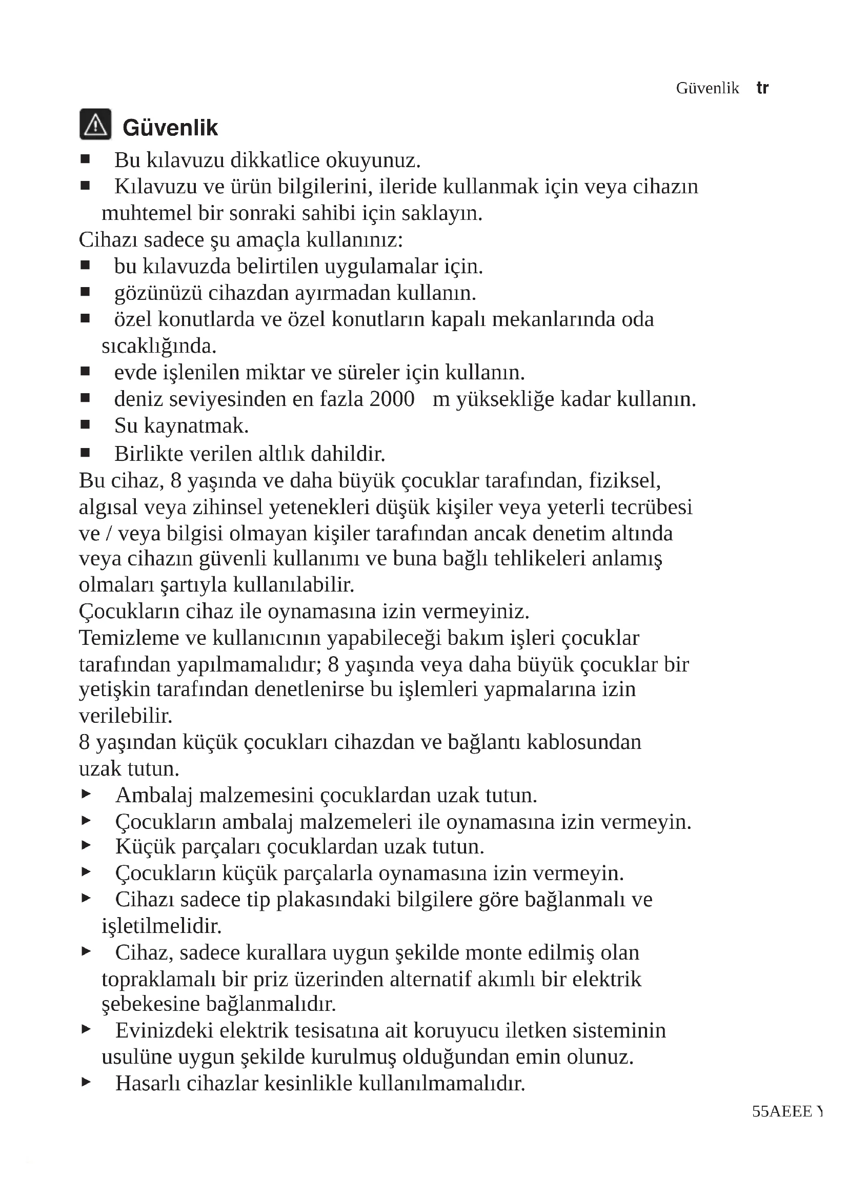 Λεπτομερείς πληροφορίες για τον χρόνο εγ- γύησης και τους όρους εγγύησης στη χώρα σας θα λάβετε από την υπηρεσία εξυπη- ρέτησης πελατών της εταιρείας μας, τον έμπορά σας ή την ιστοσελίδα μας. Τα στοιχεία επικοινωνίας της υπηρεσίας εξυ- πηρέτησης πελατών θα τα βρείτε στον συ- νημμένο κατάλογο της υπηρεσίας εξυπη- ρέτησης πελατών ή στην ιστοσελίδα μας.Güvenlik tr 55AEEE Yönetmeliǧine Uygundur. PCB içermez. Güvenlik ¡ Bu kılavuzu dikkatlice okuyunuz. ¡ Kılavuzu ve ürün bilgilerini, ileride kullanmak için veya cihazın muhtemel bir sonraki sahibi için saklayın. Cihazı sadece şu amaçla kullanınız: ¡ bu kılavuzda belirtilen uygulamalar için. ¡ gözünüzü cihazdan ayırmadan kullanın. ¡ özel konutlarda ve özel konutların kapalı mekanlarında oda sıcaklığında. ¡ evde işlenilen miktar ve süreler için kullanın. ¡ deniz seviyesinden en fazla 2000m yüksekliğe kadar kullanın. ¡ Su kaynatmak. ¡ Birlikte verilen altlık dahildir. Bu cihaz, 8 yaşında ve daha büyük çocuklar tarafından, fiziksel, algısal veya zihinsel yetenekleri düşük kişiler veya yeterli tecrübesi ve / veya bilgisi olmayan kişiler tarafından ancak denetim altında veya cihazın güvenli kullanımı ve buna bağlı tehlikeleri anlamış olmaları şartıyla kullanılabilir. Çocukların cihaz ile oynamasına izin vermeyiniz. Temizleme ve kullanıcının yapabileceği bakım işleri çocuklar tarafından yapılmamalıdır; 8 yaşında veya daha büyük çocuklar bir yetişkin tarafından denetlenirse bu işlemleri yapmalarına izin verilebilir. 8 yaşından küçük çocukları cihazdan ve bağlantı kablosundan uzak tutun. ▶ Ambalaj malzemesini çocuklardan uzak tutun. ▶ Çocukların ambalaj malzemeleri ile oynamasına izin vermeyin. ▶ Küçük parçaları çocuklardan uzak tutun. ▶ Çocukların küçük parçalarla oynamasına izin vermeyin. ▶ Cihazı sadece tip plakasındaki bilgilere göre bağlanmalı ve işletilmelidir. ▶ Cihaz, sadece kurallara uygun şekilde monte edilmiş olan topraklamalı bir priz üzerinden alternatif akımlı bir elektrik şebekesine bağlanmalıdır. ▶ Evinizdeki elektrik tesisatına ait koruyucu iletken sisteminin usulüne uygun şekilde kurulmuş olduğundan emin olunuz. ▶ Hasarlı cihazlar kesinlikle kullanılmamalıdır.tr Maddi hasarların önlenmesi