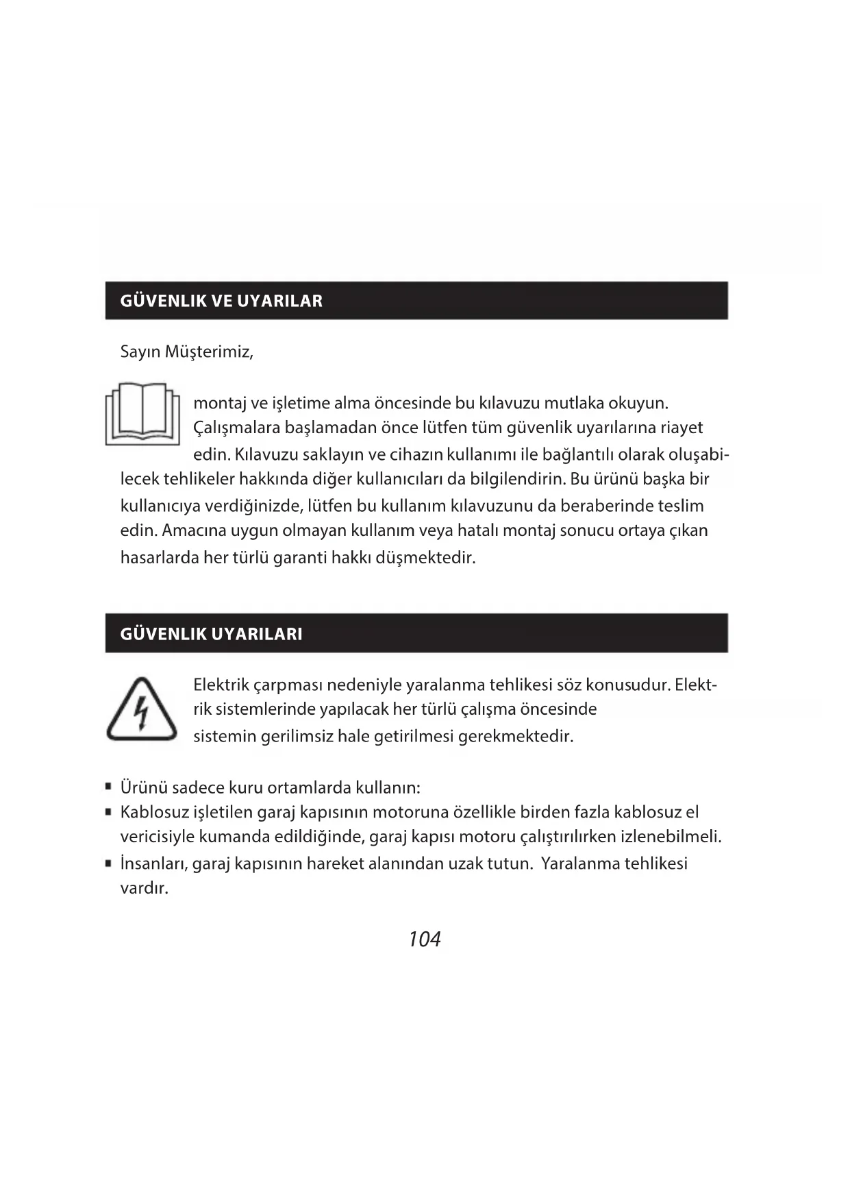 Elektrik çarpması nedeniyle yaralanma tehlikesi söz konusudur Elekt- rik sistemlerinde yapılacak her türlü çalışma öncesinde sistemin gerilimsiz hale getirilmesi gerekmektedir Ürünü sadece kuru ortamlarda kullanın: Kablosuz işletilen garaj kapısının motoruna özellikle birden fazla kablosuz el vericisiyle kumanda edildiğinde, garaj kapısı motoru çalıştırılırken izlenebilmeli İnsanları, garaj kapısının hareket alanından uzak tutun Yaralanma tehlikesi vardır