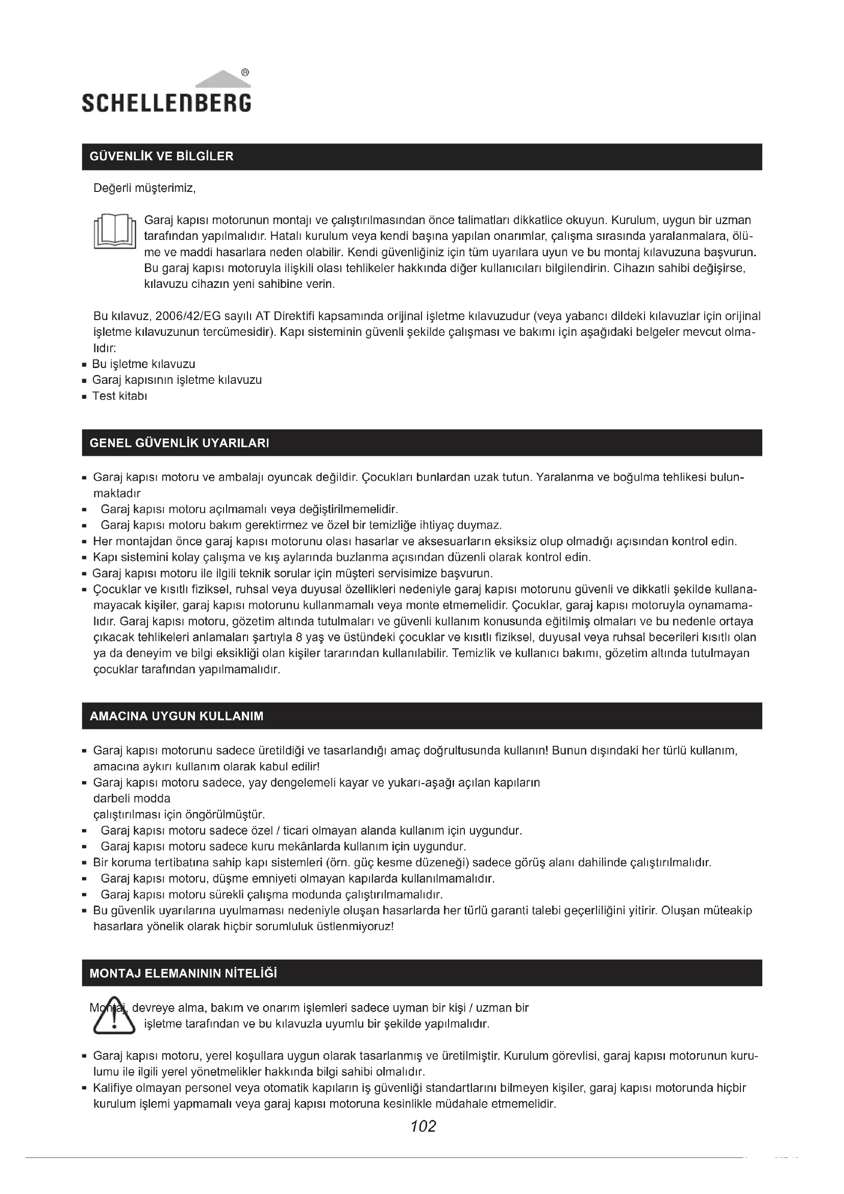 Montaj, devreye alma, bakım ve onarım işlemleri sadece uyman bir kişi / uzman bir işletme tarafından ve bu kılavuzla uyumlu bir şekilde yapılmalıdır. Garaj kapısı motoru, yerel koşullara uygun olarak tasarlanmış ve üretilmiştir. Kurulum görevlisi, garaj kapısı motorunun kuru- lumu ile ilgili yerel yönetmelikler hakkında bilgi sahibi olmalıdır. Kalifiye olmayan personel veya otomatik kapıların iş güvenliği standartlarını bilmeyen kişiler, garaj kapısı motorunda hiçbir kurulum işlemi yapmamalı veya garaj kapısı motoruna kesinlikle müdahale etmemelidir.103