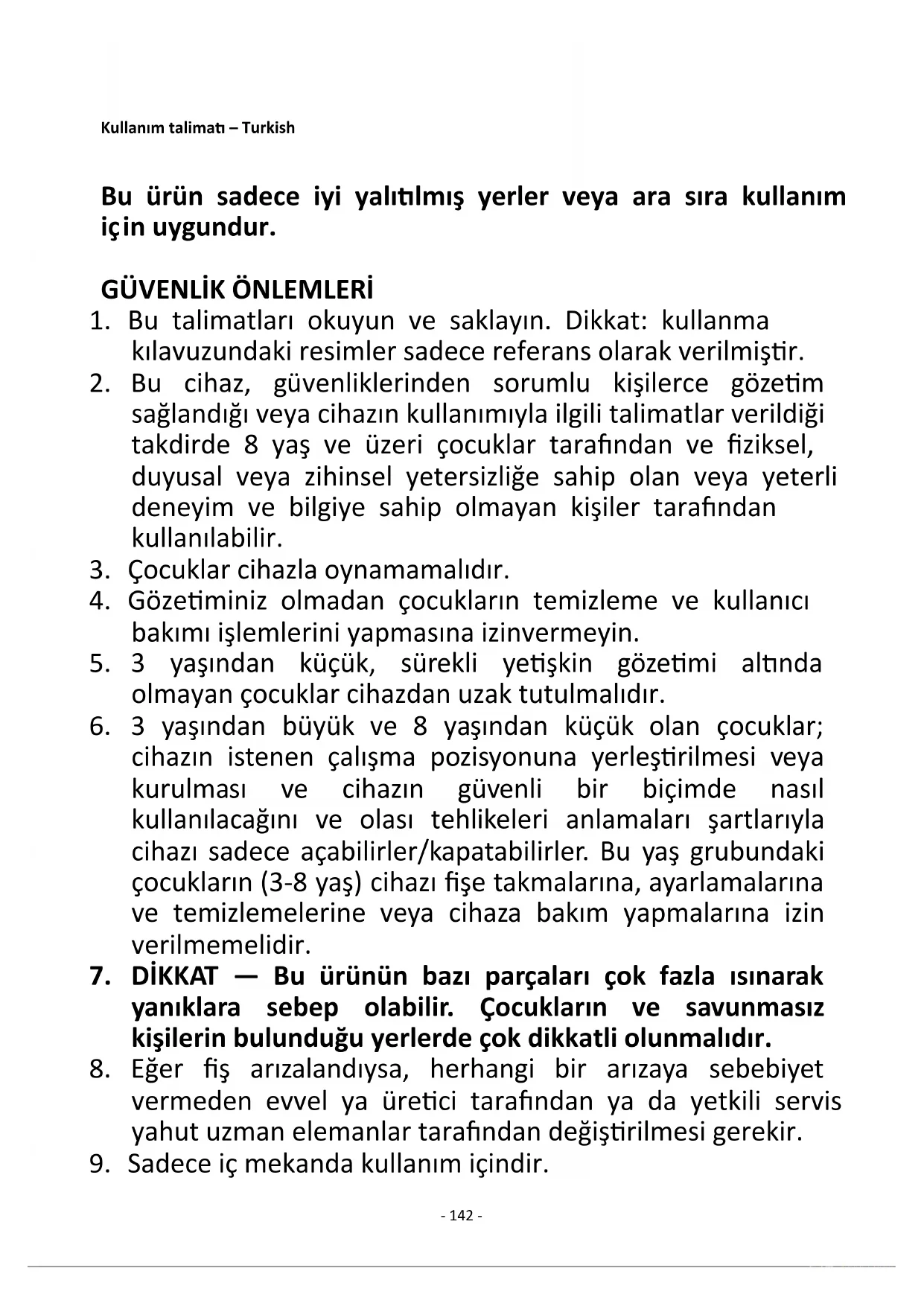 7. DİKKAT — Bu ürünün bazı parçaları çok fazla ısınarak