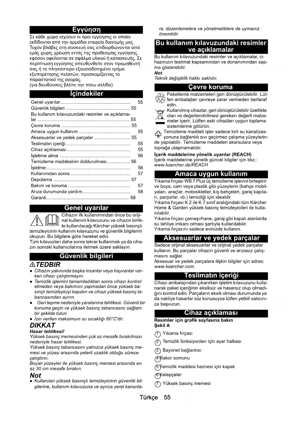 - Σε κάθε χώρα ισχύουν οι όροι εγγύησης οι οποίοι εκδίδονται από την αρμόδια εταιρεία διανομής μας. Τυχόν βλάβες στη συσκευή σας επιδιορθώνονται από εμάς χωρίς χρέωση εντός της προθεσμίας εγγύησης, εφόσον οφείλονται σε σφάλμα υλικού ή κατασκευής. Σε περίπτωση εγγύησης απευθυνθείτε στον προμηθευτή σας ή το πλησιέστερο εξουσιοδοτημένο τμήμα εξυπηρέτησης πελατών , προσκομίζοντας το παραστατικό της αγοράς. (για διευθύνσεις βλέπε την πίσω σελίδα) İçindekiler Genel uyarılar Cihazın ilk kullanımından önce bu oriji- nal kullanım kılavuzunu ve cihazın birlik- te kullanılacağı Kärcher yüksek basınçlı temizleyicinin kullanım kılavuzunu ve güvenlik bilgilerini okuyun. Bu bilgilere göre hareket edin. Tüm kılavuzları daha sonra tekrar kullanmak ya da ciha- zın sonraki kullanıcılarına iletmek üzere saklayın. Güvenlik bilgileri 몇 TEDBIR ● Cihazın yakınında başka insanlar veya hayvanlar var- ken cihazı çalıştırmayın. ● Temizlik işlemini tamamladıktan sonra cihazı kontrol etmeden veya bakımını yapmadan önce yüksek ba- sınçlı temizleyiciyi kapatın ve cihazı yüksek basınç ta- bancasından ayırın. ● Geri tepme nedeniyle yaralanma tehlikesi. Güvenli bir konuma geçin ve yüksek basınç tabancasını sağlam bir şekilde tutun. ● İzin verilen maksimum su sıcaklığı 60°C'dir. DIKKAT Hasar tehlikesi! Yüksek basınç memesinden çok az mesafe bırakılması nedeniyle hasar tehlikesi. Yüksek basınç tabancasını yalnızca yüksek basınç me- mesi ve yüzey arasında yeterli uzaklık olduğu sürece çalıştırın. Boyalı yüzeyler ile yüksek basınç memesi arasında en az 30 cm mesafe bırakın. Not ● Kullanılan yüksek basınçlı temizleyicinin güvenlik bil- gilerine, kullanım kılavuzuna ve ayrıca yerel kanunla- ra, düzenlemelere ve yönetmeliklere de uymanız önemlidir. Bu kullanım kılavuzundaki resimler ve açıklamalar Bu kullanım kılavuzundaki resimler ve açıklamalar, ci- hazınızın teslimat kapsamından ve donanımından sap- ma gösterebilir. Not Teknik değişiklik hakkı saklıdır. Çevre koruma Paketleme malzemeleri geri dönüştürülebilir. Lüt- fen ambalajları çevreye zarar vermeden bertaraf edin. Kullanılmış cihazlar, geri dönüştürülebilir özellikte olan ve değerlendirilmesi gereken değerli malze- meler içerir. Lütfen eski cihazları uygun toplama sistemlerine götürün. Temizleme maddeli işler sadece kirli su kanalizas- yonuna bağlantılı sıvı geçirmez çalışma yüzeylerin- de yapılabilir. Temizleme maddeleri akarsulara veya toprağa ulaşmamalıdır. İçerik maddelerine yönelik uyarılar (REACH) İçerik maddelerine yönelik güncel bilgiler için bkz.: www.kaercher.de/REACH Amaca uygun kullanım Yıkama fırçası WB 7 Plus üç temizleme işlevini birleştirir ve boya, cam veya plastik gibi yüzeylerin (bahçe mobil- yaları, araçlar, motosikletler, kış bahçeleri, garaj kapıla- rı, panjurlar, vb.) temizliği için idealdir. Yıkama fırçası K 2 ile K 7 sınıf aralığındaki tüm Kärcher Home & Garden yüksek basınç temizleyicileri ile kulla- nılabilir. Yıkama fırçası çamaşırhane, garaj gibi kapalı alanlarda su tahliye imkanı olması şartıyla kullanılabilir. Yıkama fırçasını sadece evinizde kullanın. Aksesuarlar ve yedek parçalar Sadece orijinal aksesuarlar ve orijinal yedek parçalar kullanın. Bu parçalar cihazın güvenli ve arızasız çalış- masını sağlar. Aksesuar ve yedek parçalara ilişkin bilgiler için adres: www.kaercher.com. Teslimatın içeriği Cihazı ambalajından çıkarırken işletim kılavuzunu kulla- narak paket içeriğinin eksiksiz ve hasarsız olup olmadı- ğını kontrol edin. Parçaların eksik olması durumunda ya da nakliye hasarlar söz konusuysa lütfen yetkili satıcını- za başvurun. Cihaz açıklaması Resimler için grafik sayfasına bakın Şekil A 1 Yıkama fırçası 2 Temizlik fonksiyonları için ayar halkası 3 Bayonet bağlantısı 4 Rakor somunu 5 Temizlik maddesi haznesi için kapak 6 Kelepçeler 7 Yüksek basınç memesi Genel uyarılar p. 55